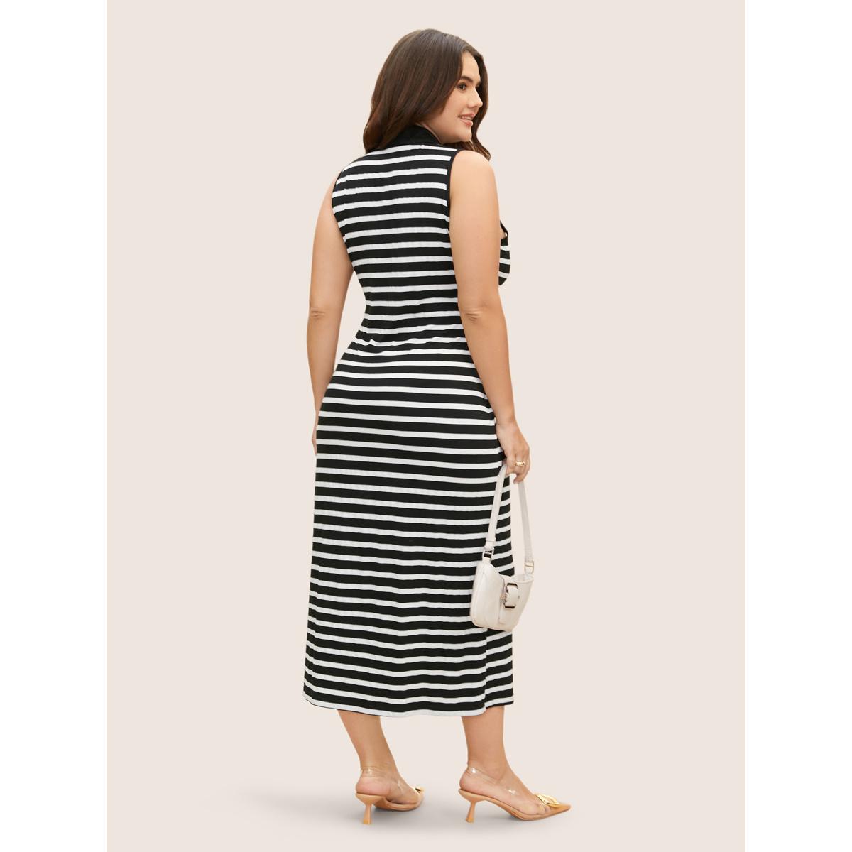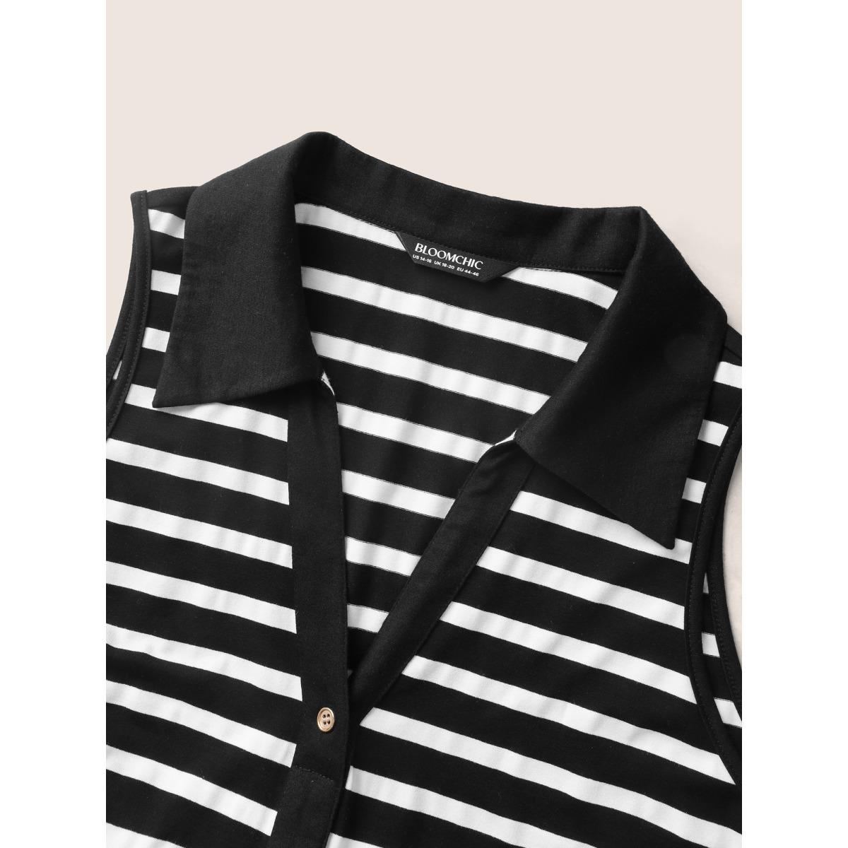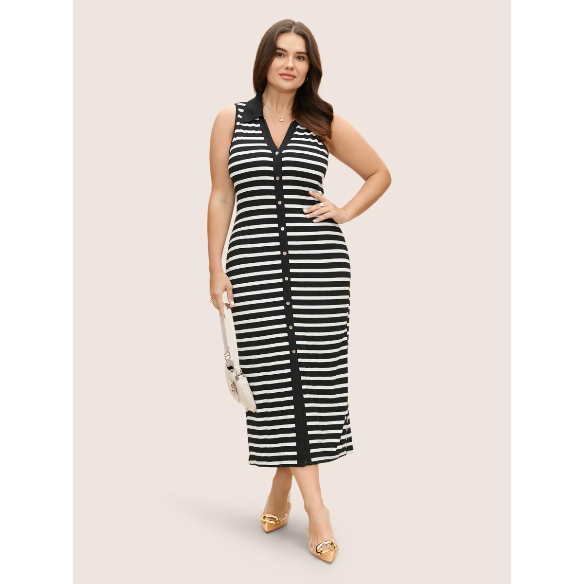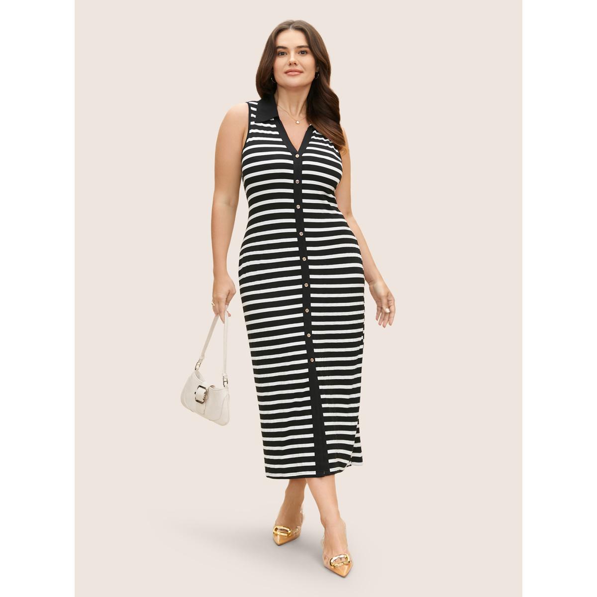 Plus Size Lapel Collar Striped Button Detail Midi Dress Black Women Work From Home Button Shirt collar Sleeveless Curvy BloomChic 26/4X