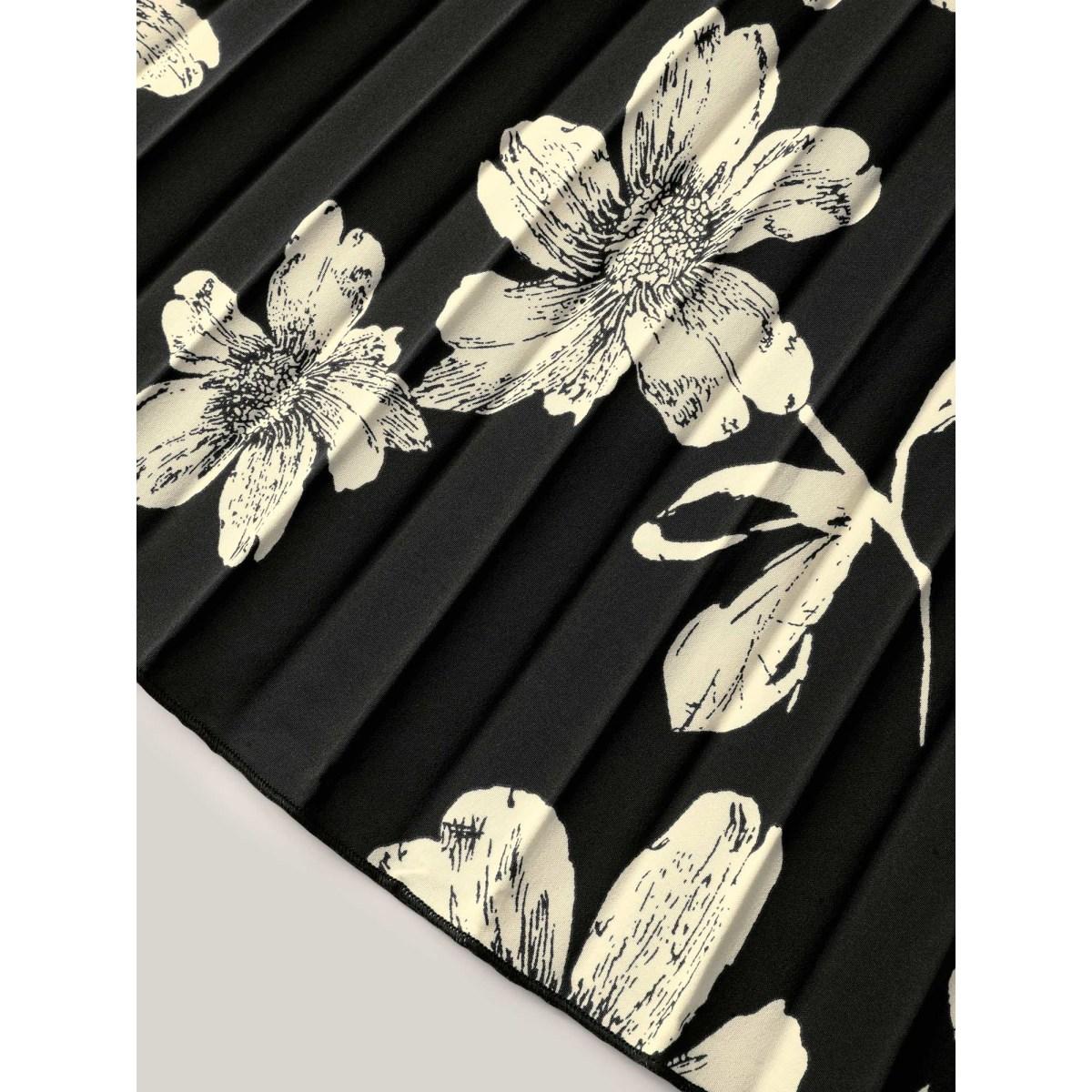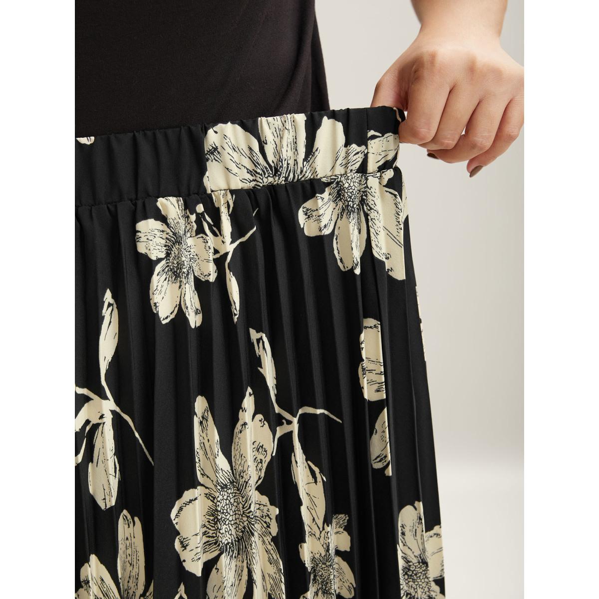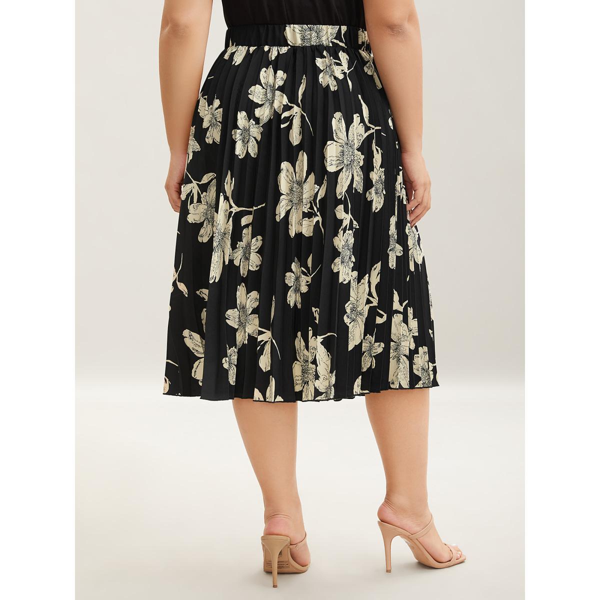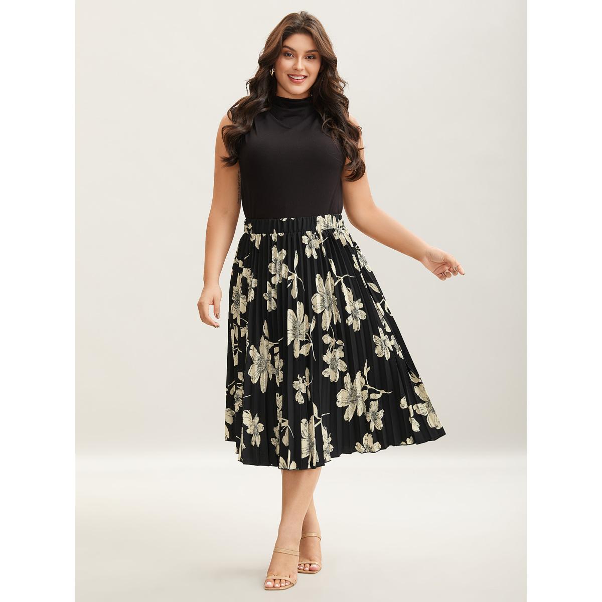 Plus Size Large Flower Print Pleated Maxi Dress Women BlackFlower Elegant Contrast Low stretch Slanted pocket Everyday-Elegant Skirts BloomChic 22-24/3X