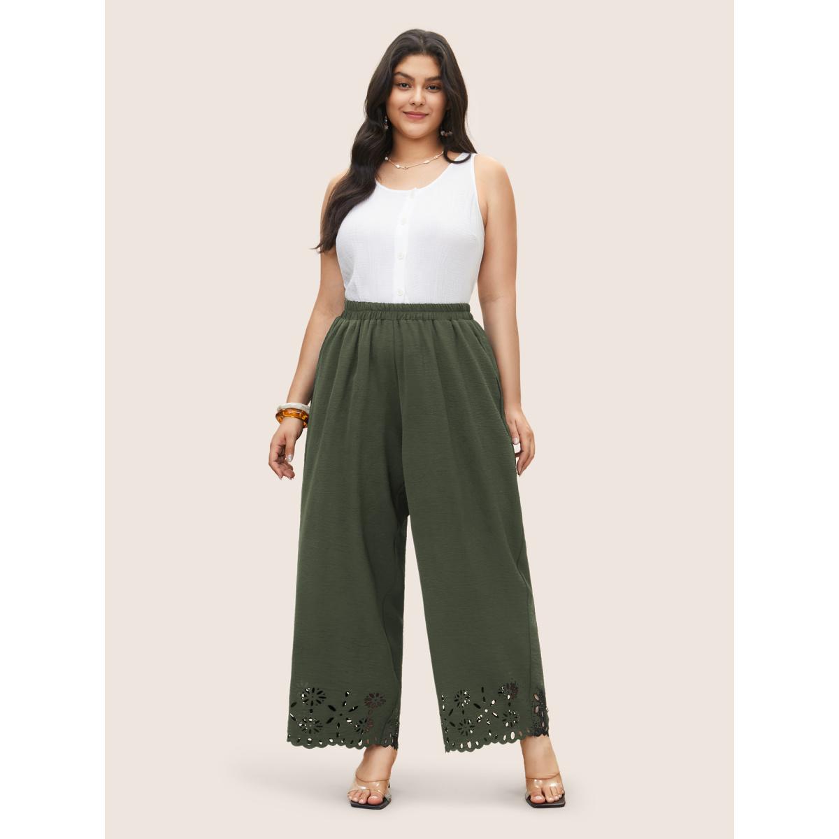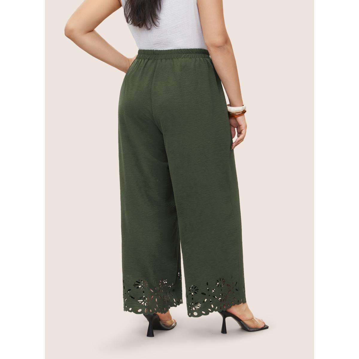 Plus Size Laser Cut Elastic Waist Wide Leg Pants Women ArmyGreen Elegant Wide Leg High Rise Everyday Pants BloomChic 28/5X