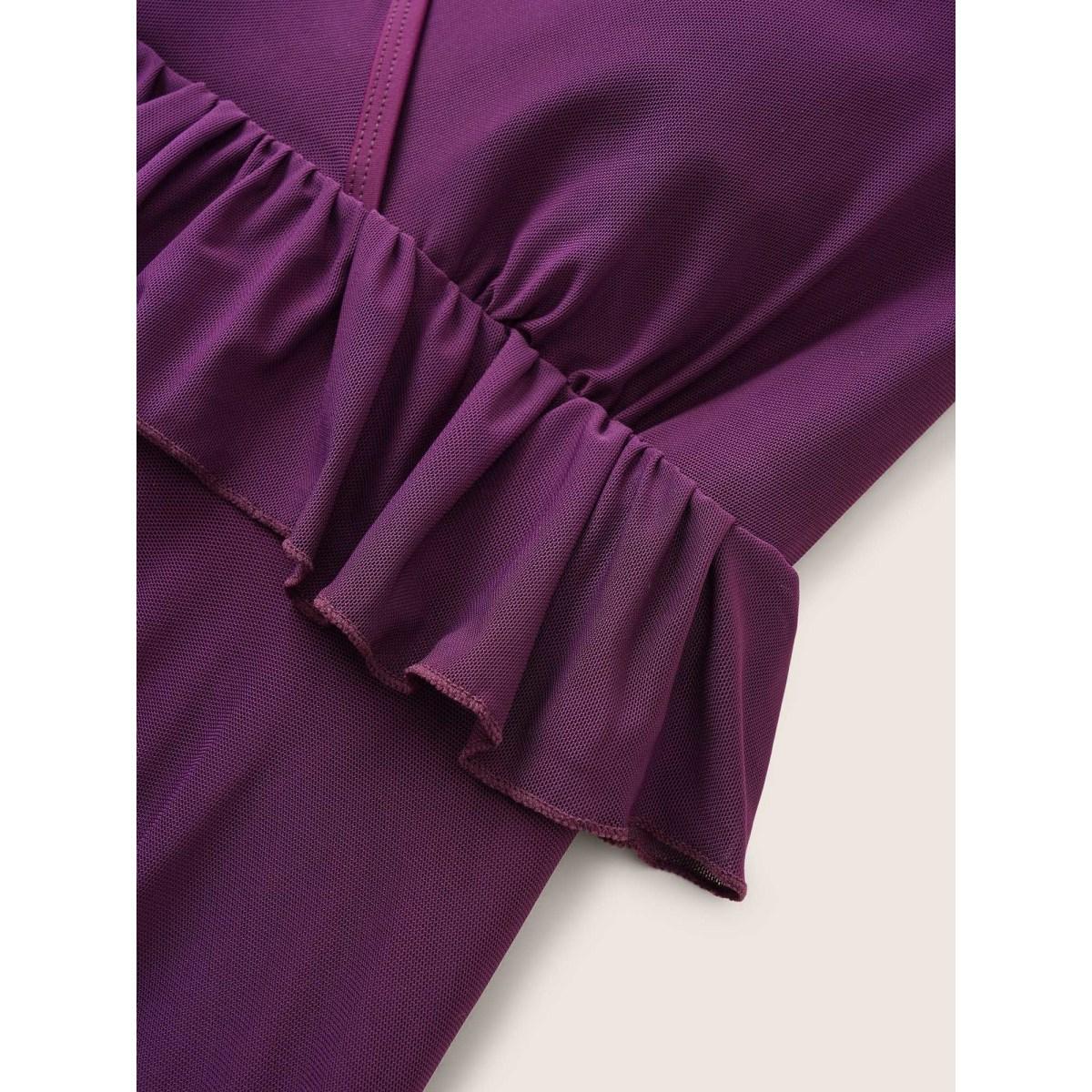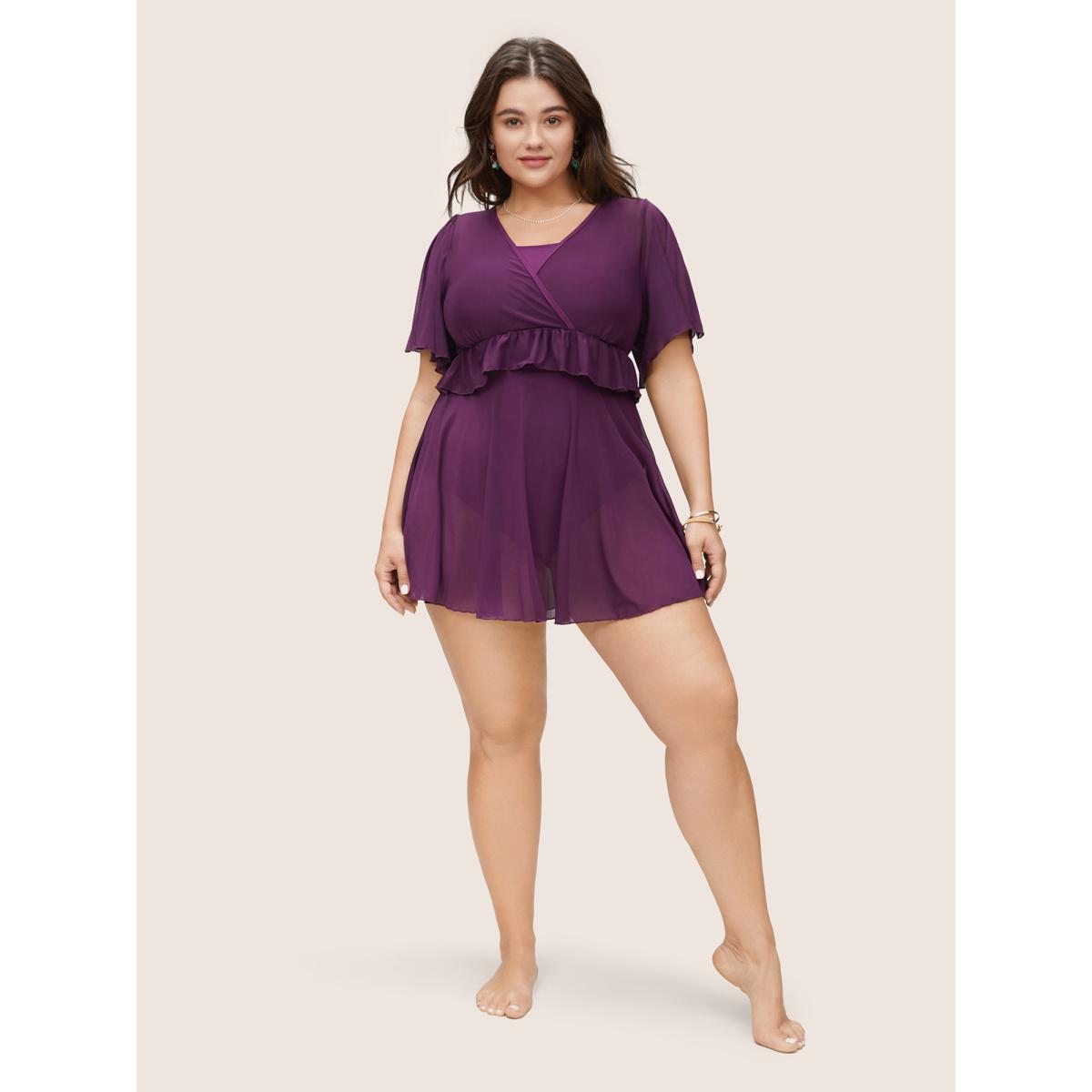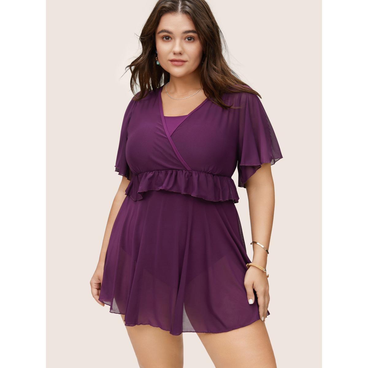 Plus Size Layered Ruffle Trim Mesh Swim Dress Women's Swimwear Eggplant Beach Skinny V-neck High stretch Curve Swim Dresses BloomChic 10/M