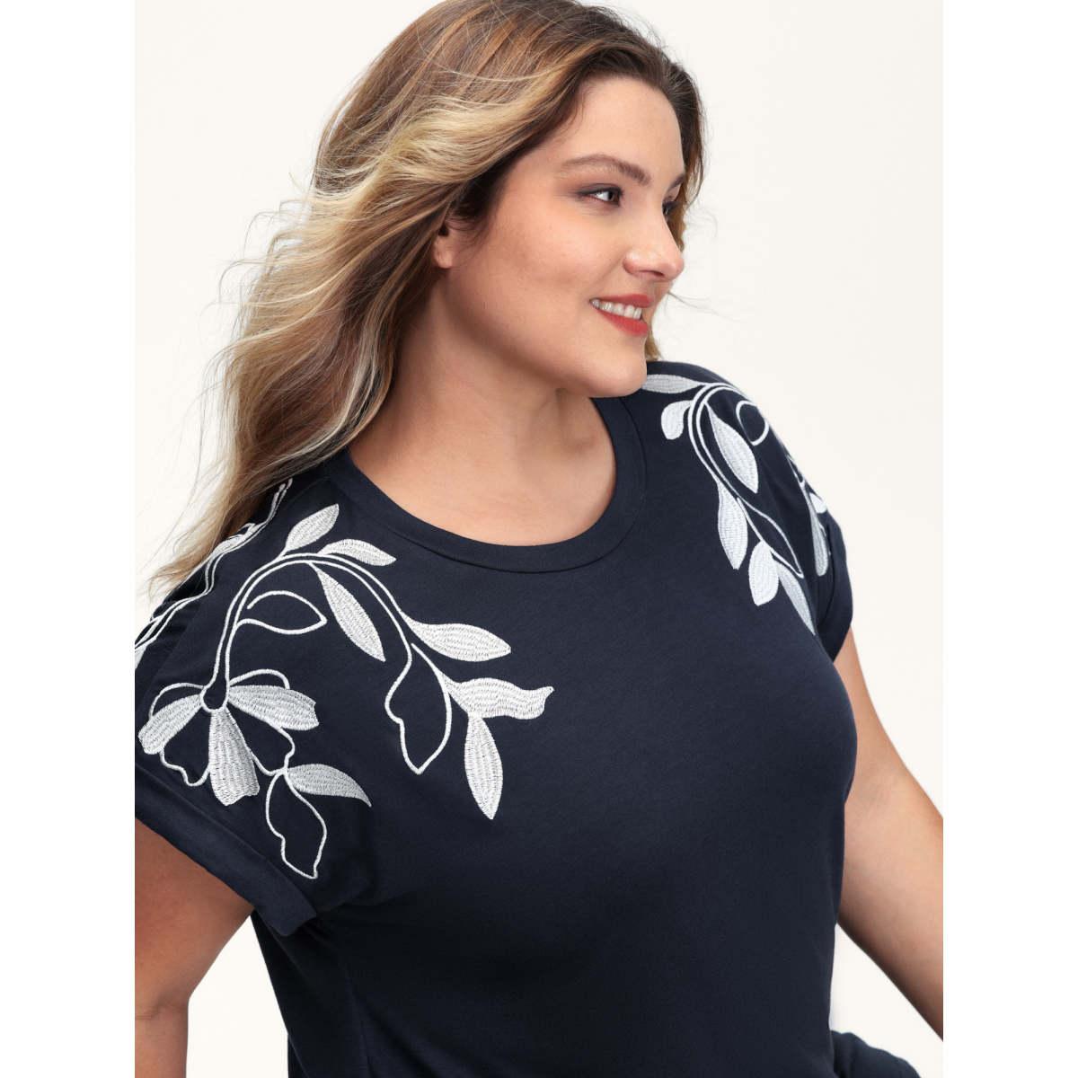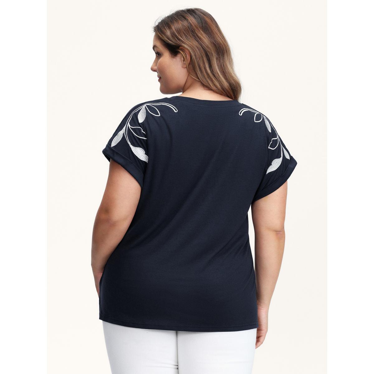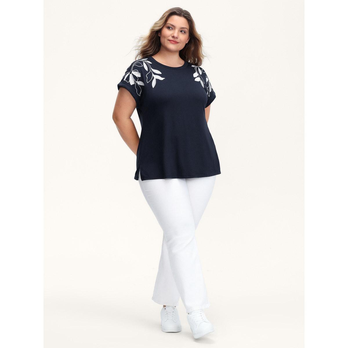 Plus Size Leaf Embroidery Round Neck Split T-Shirt Midnight Women Leisure Round Neck Casual T-shirts BloomChic 26/4X