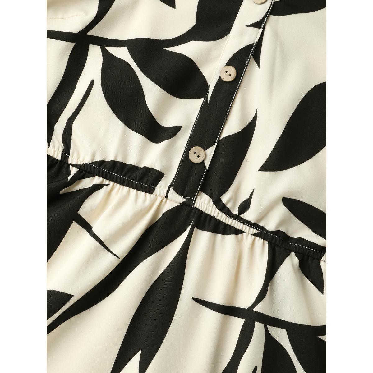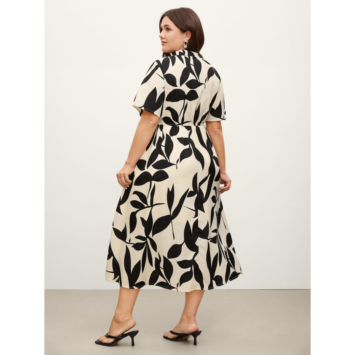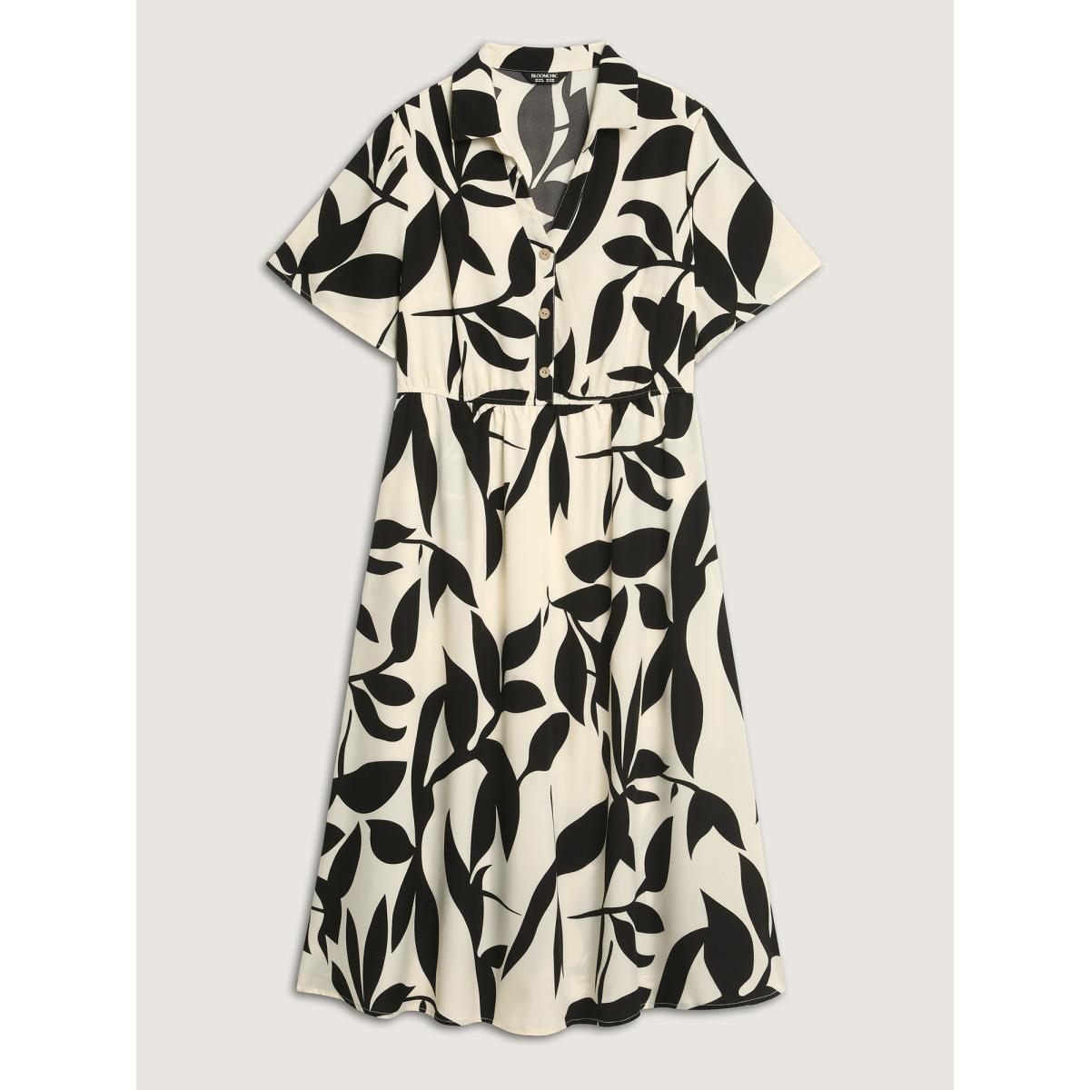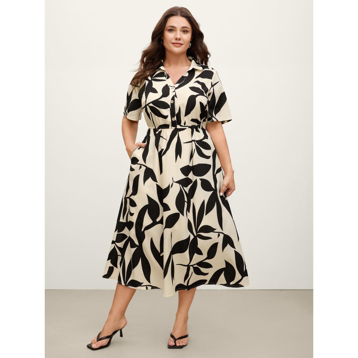 Plus Size Leaf Print Buttons Waist-Defining Midi Dress Beige Women Shirt collar Short sleeve Curvy BloomChic 10/M