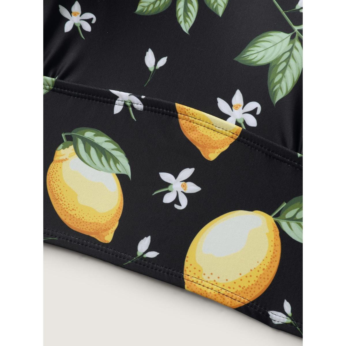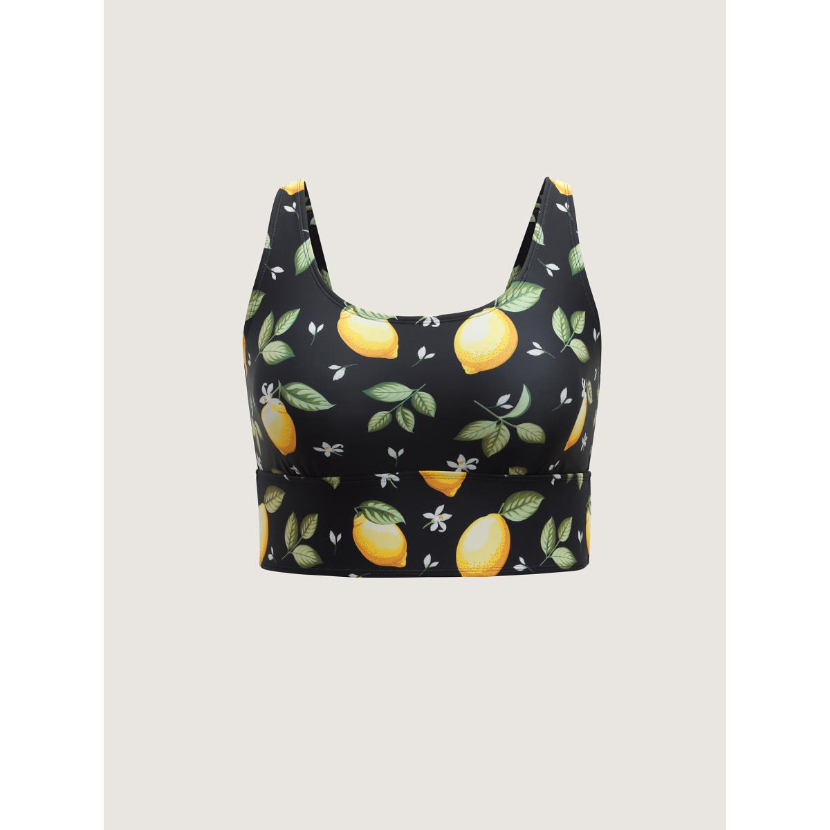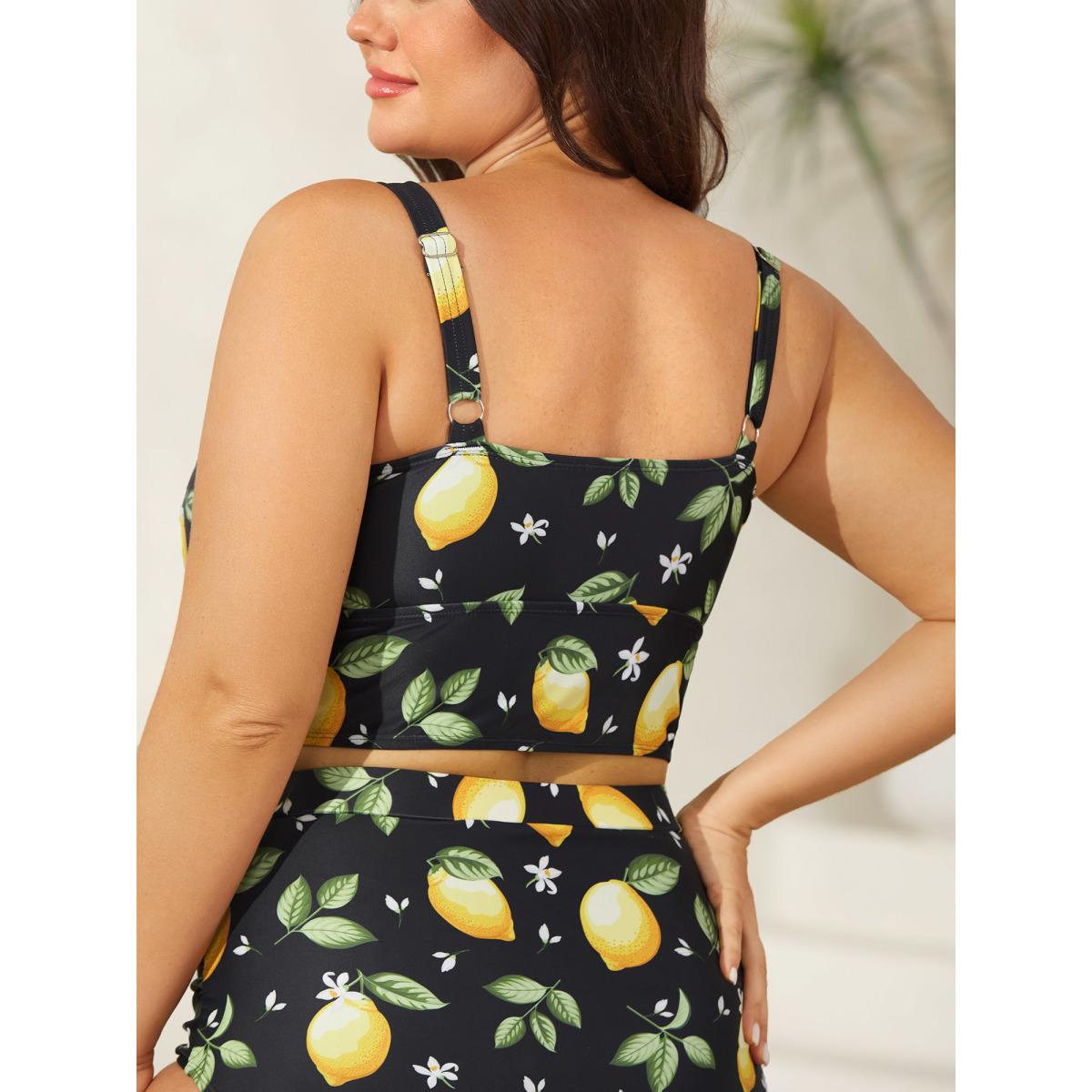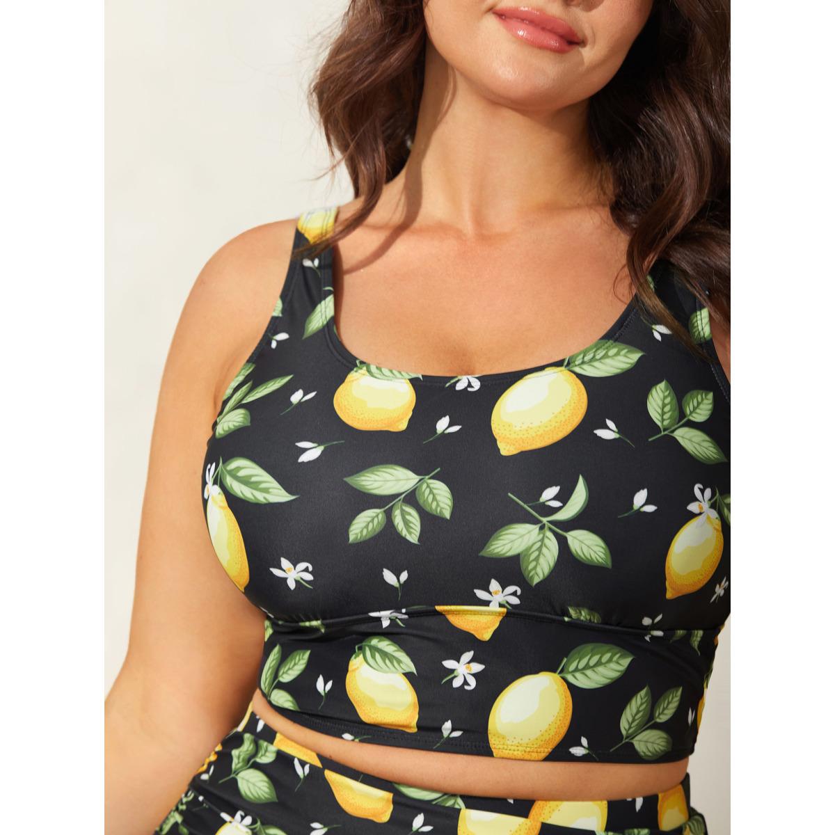 Plus Size Lemon Print Scoop Neck Swim Top Women's Swimwear Black Resort Printed High stretch Skinny U-neck Curve Swim Tops BloomChic 22-24/3X