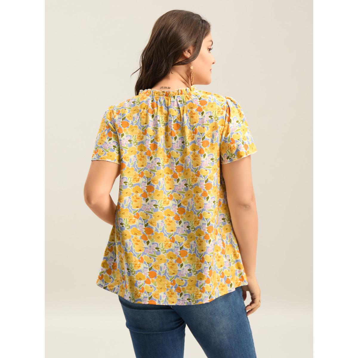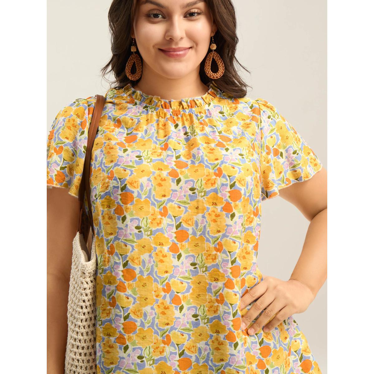 Plus Size Lemonyellow In Full Bloom Mock Neck Shirt Women Resort Cap Sleeve Stand-up collar Vacation Blouses BloomChic 12/L