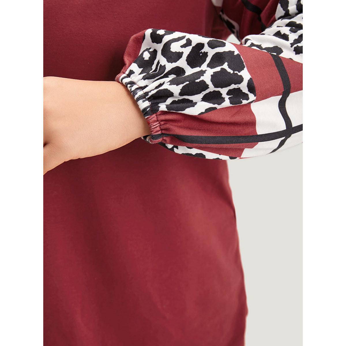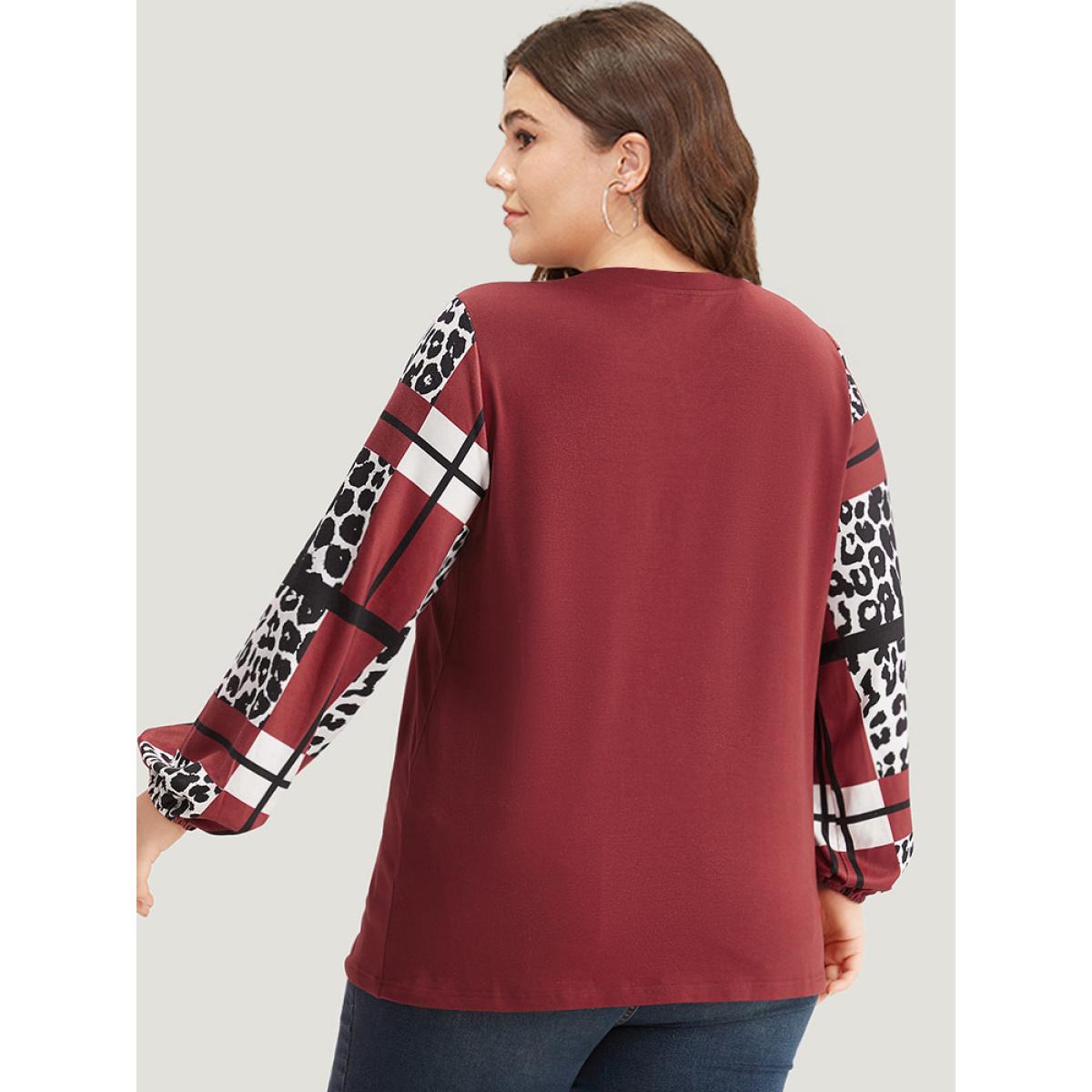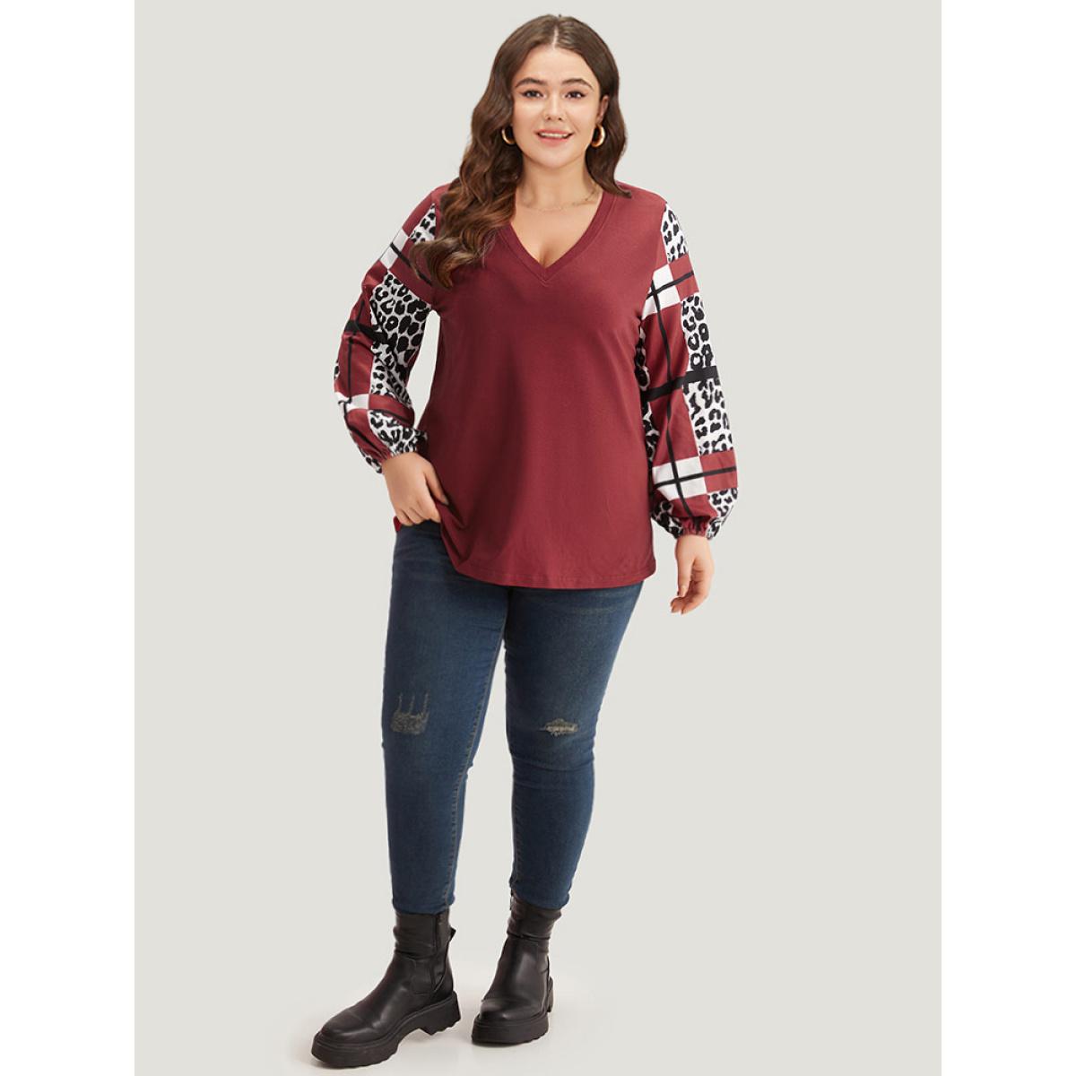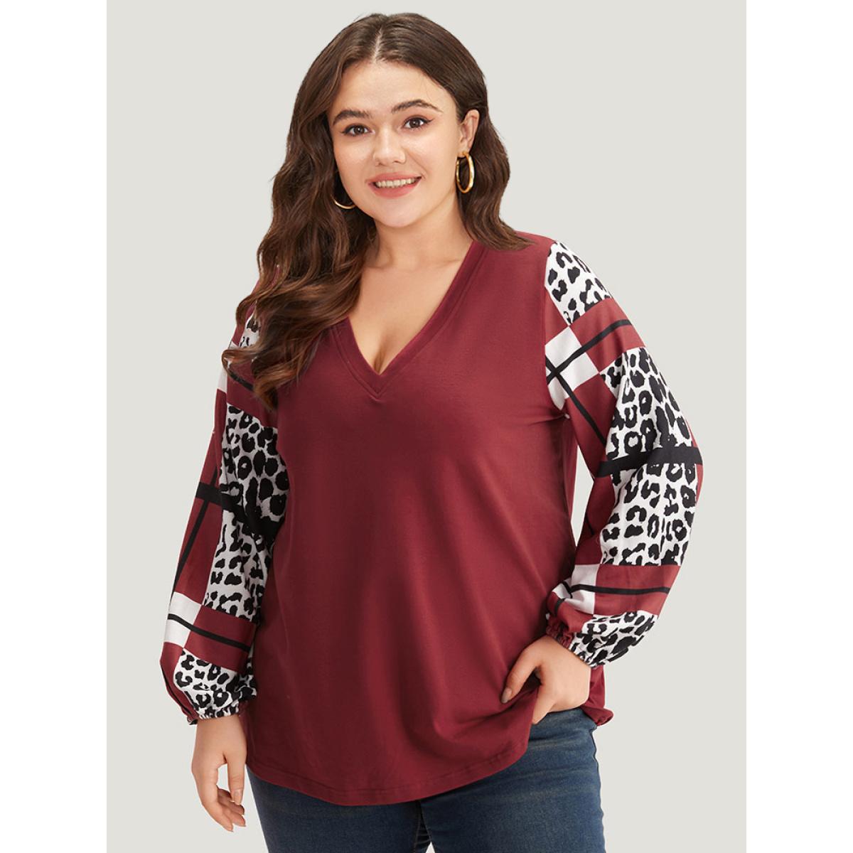 Plus Size Leopard Colorblock Contrast V Neck Lantern Sleeve Sweatshirt Women Scarlet Casual Elastic cuffs V-neck Dailywear Sweatshirts BloomChic 14-16/1X