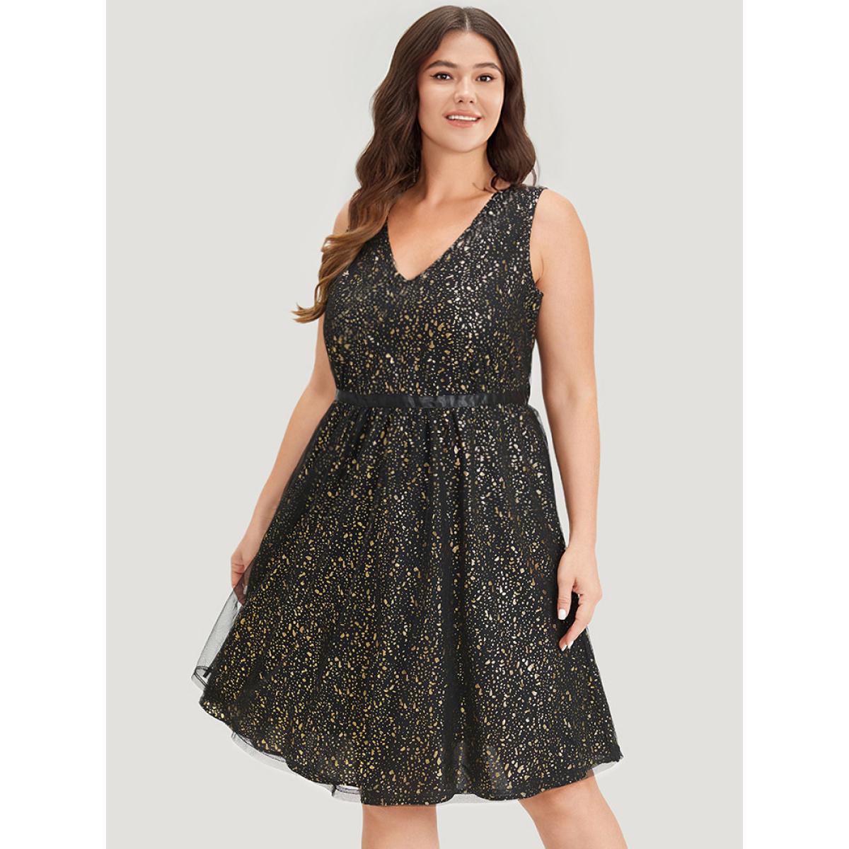 Plus Size Leopard Glitter Pocket Mesh Ribbon Tank Dress Black Women Party Ribbon V-neck Sleeveless Curvy Knee Dress BloomChic 18-20/2X