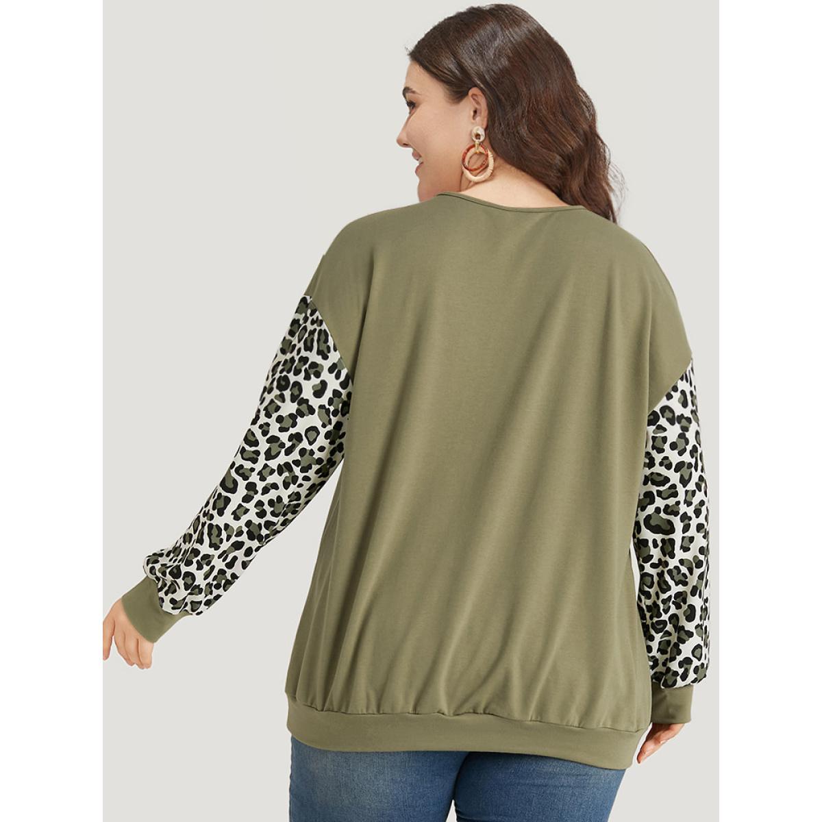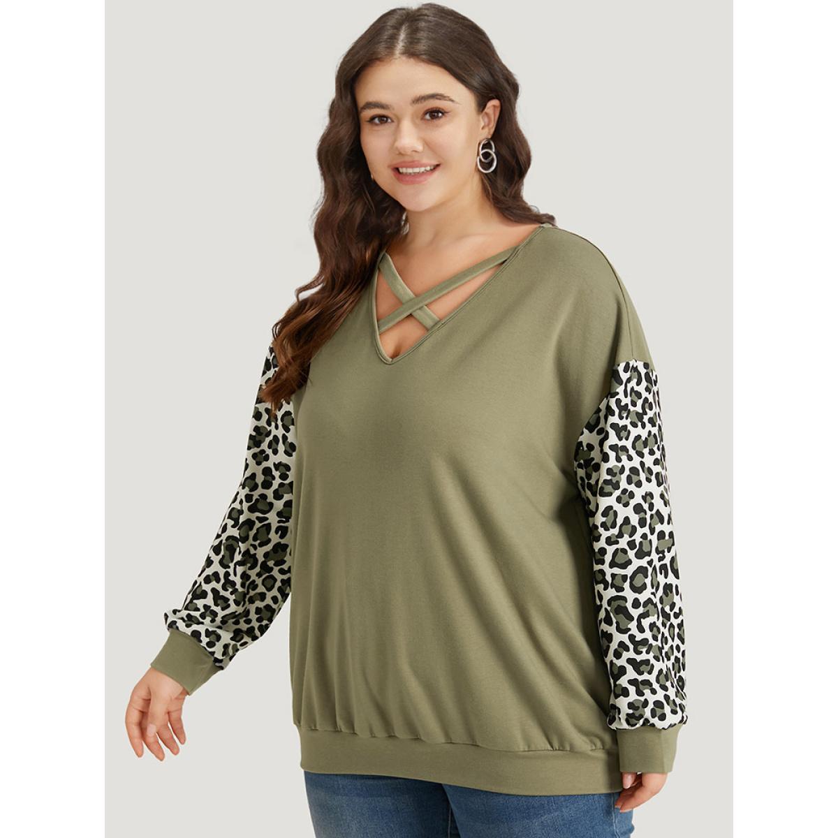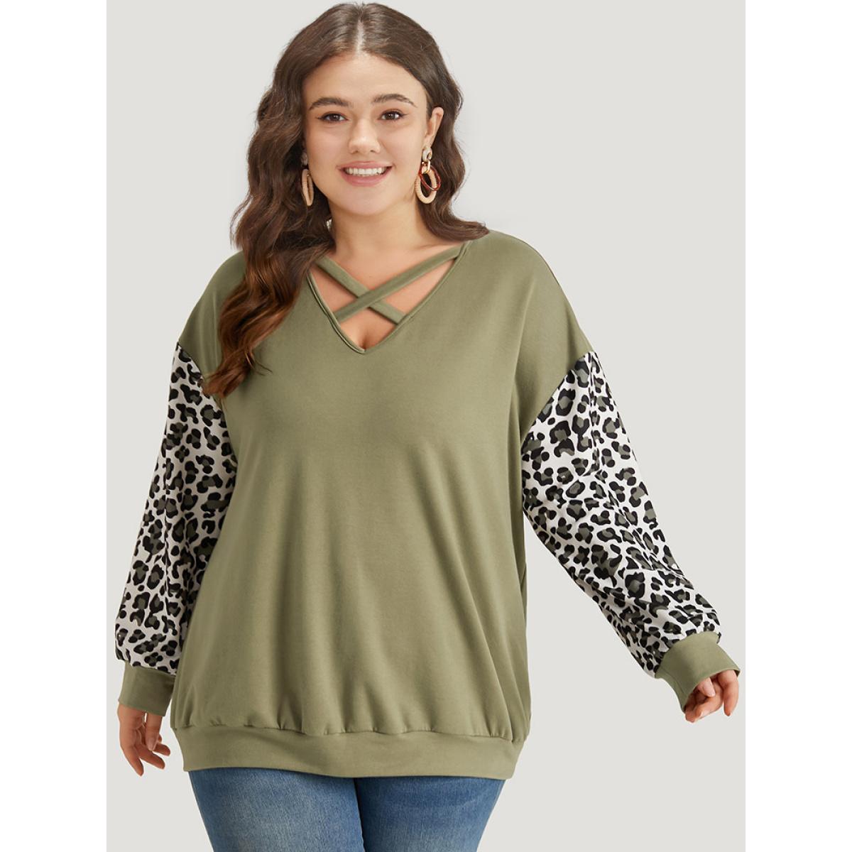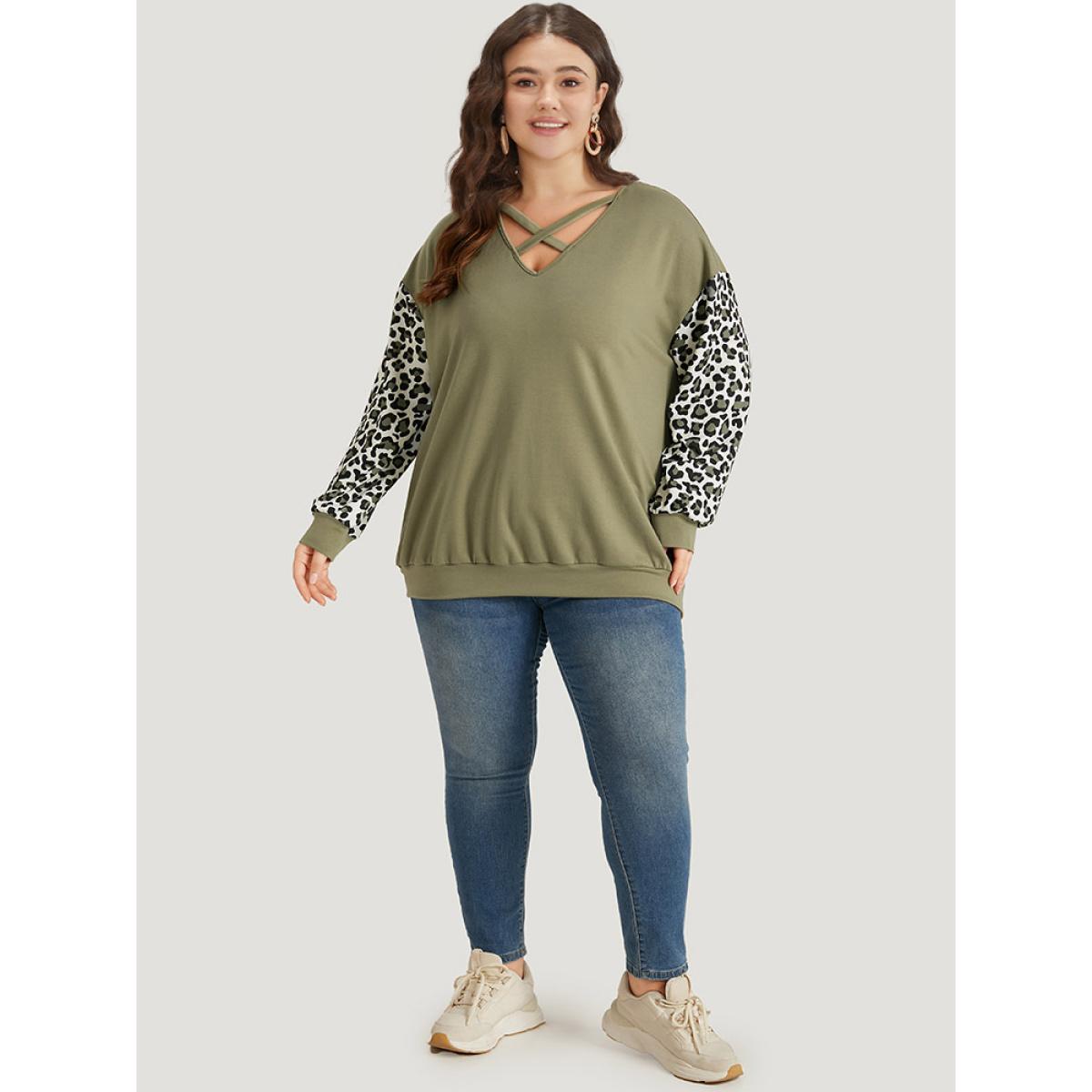 Plus Size Leopard Patchwork Crisscross Neck Elastic Cuffs Sweatshirt Women Sage Casual Elastic cuffs V-neck Dailywear Sweatshirts BloomChic 22-24/3X