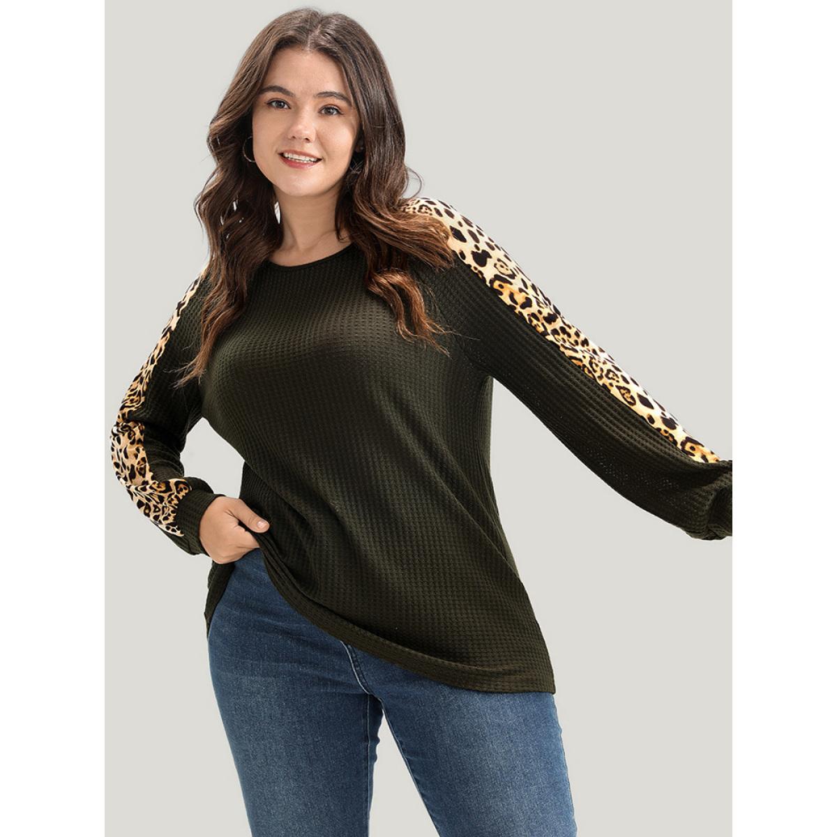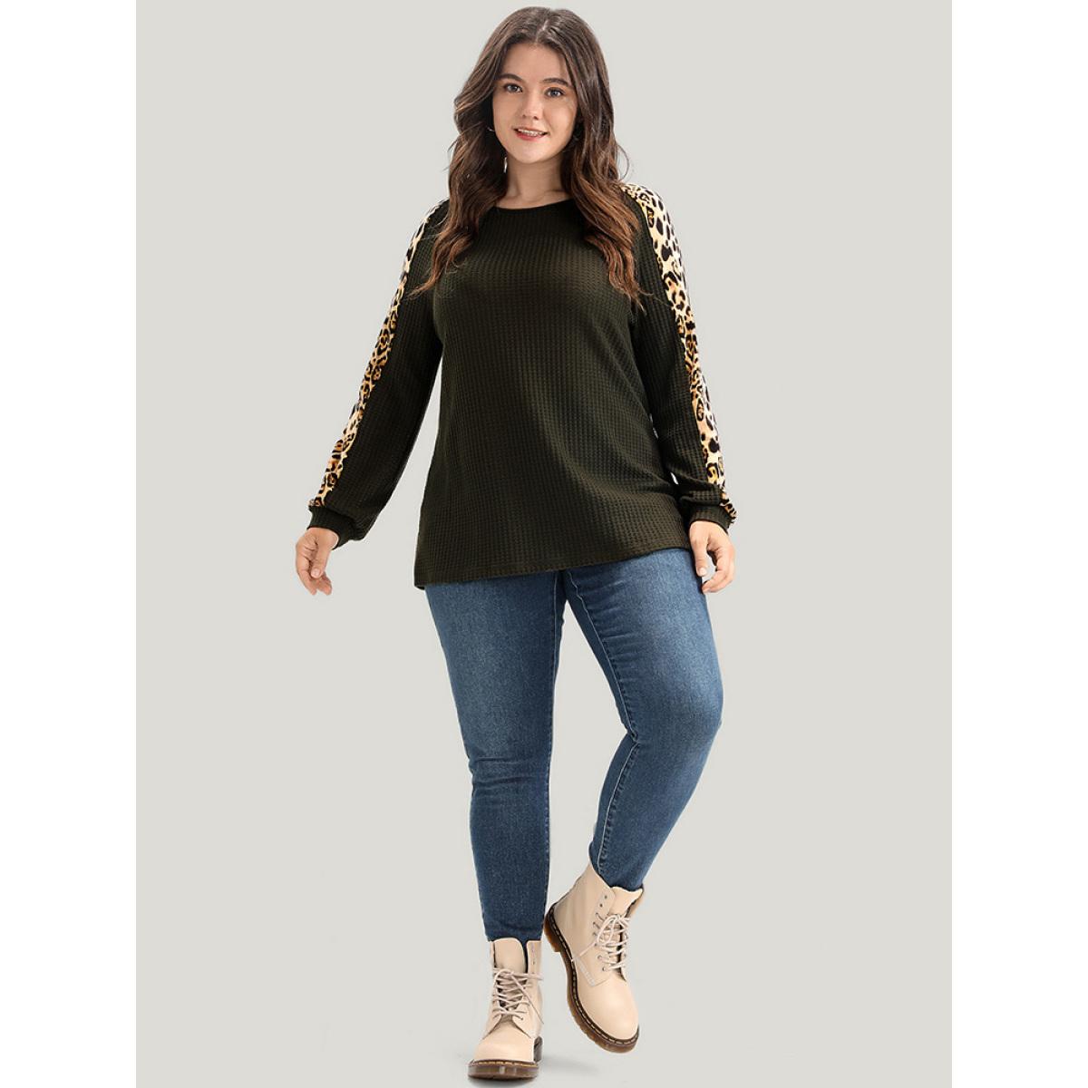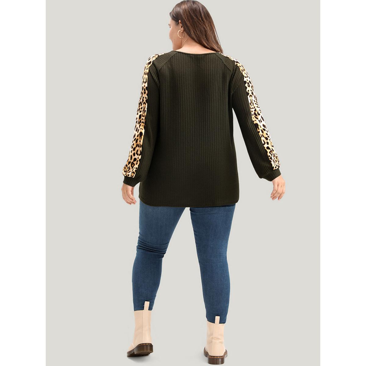 Plus Size Leopard Patchwork Raglan Sleeve Waffle Knit Sweatshirt Women ArmyGreen Casual Patchwork Round Neck Dailywear Sweatshirts BloomChic 30/6X