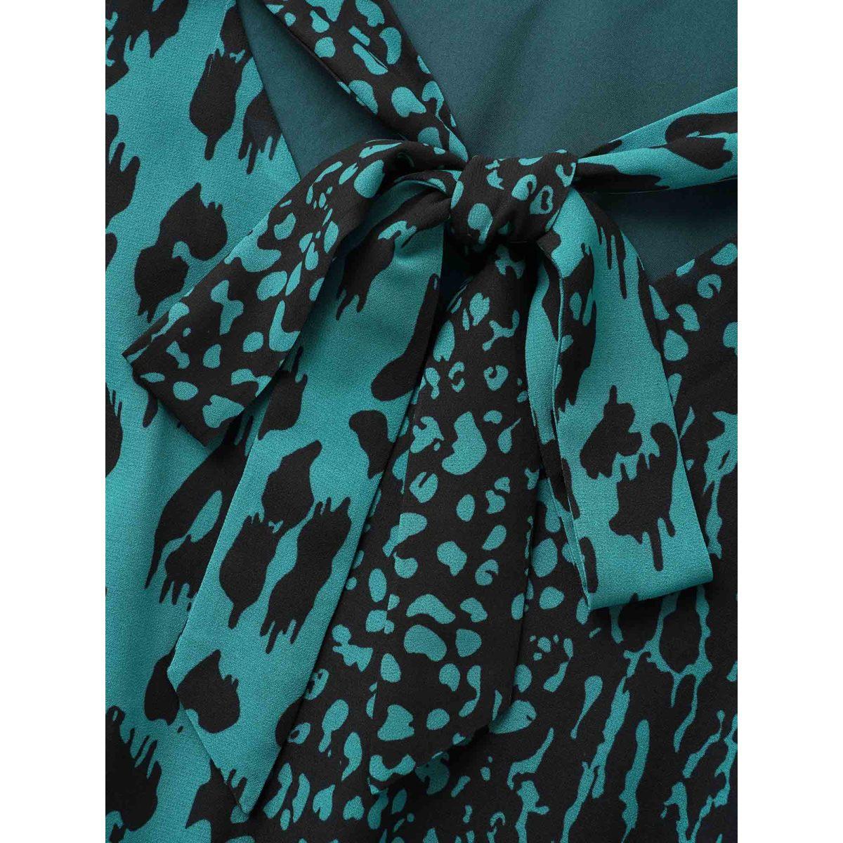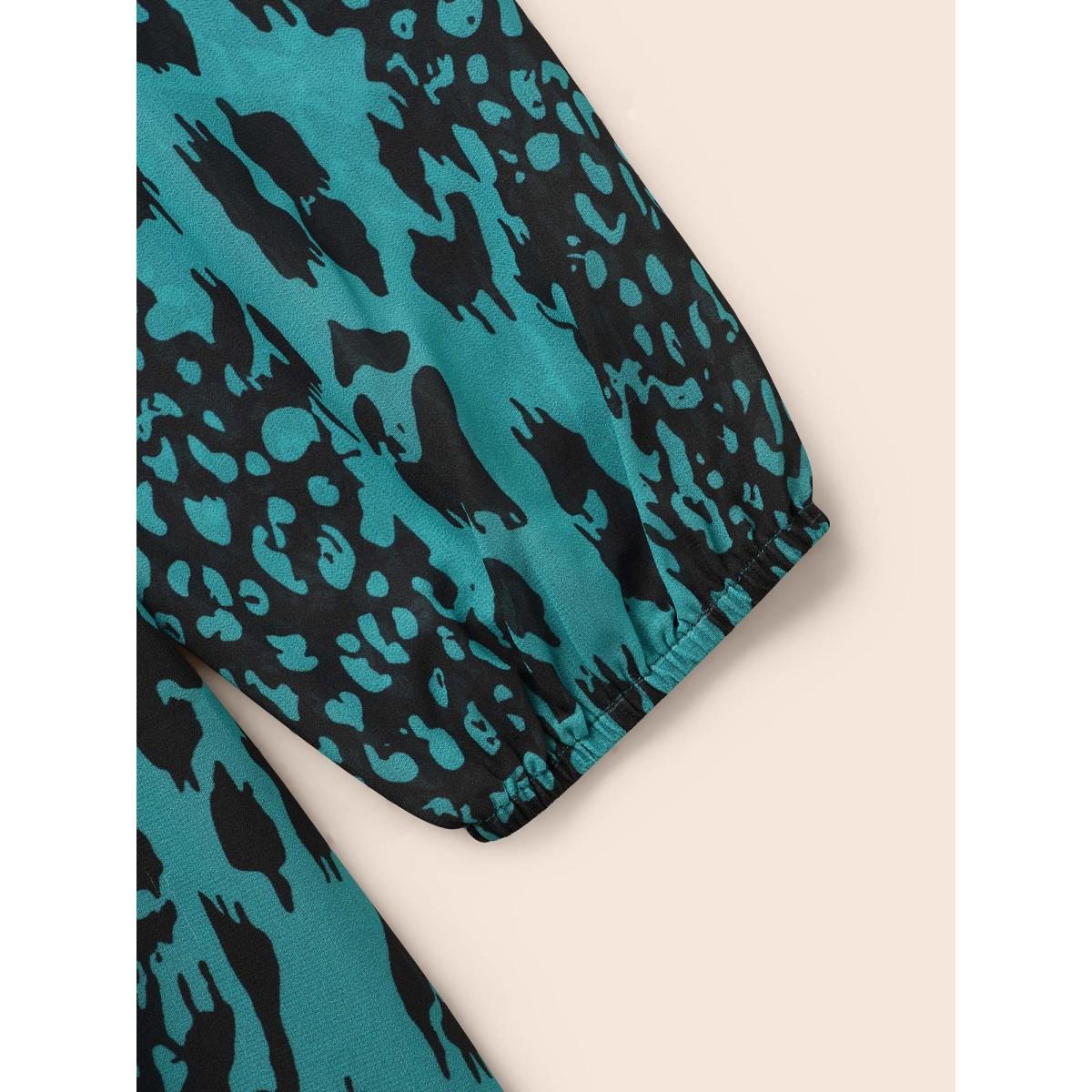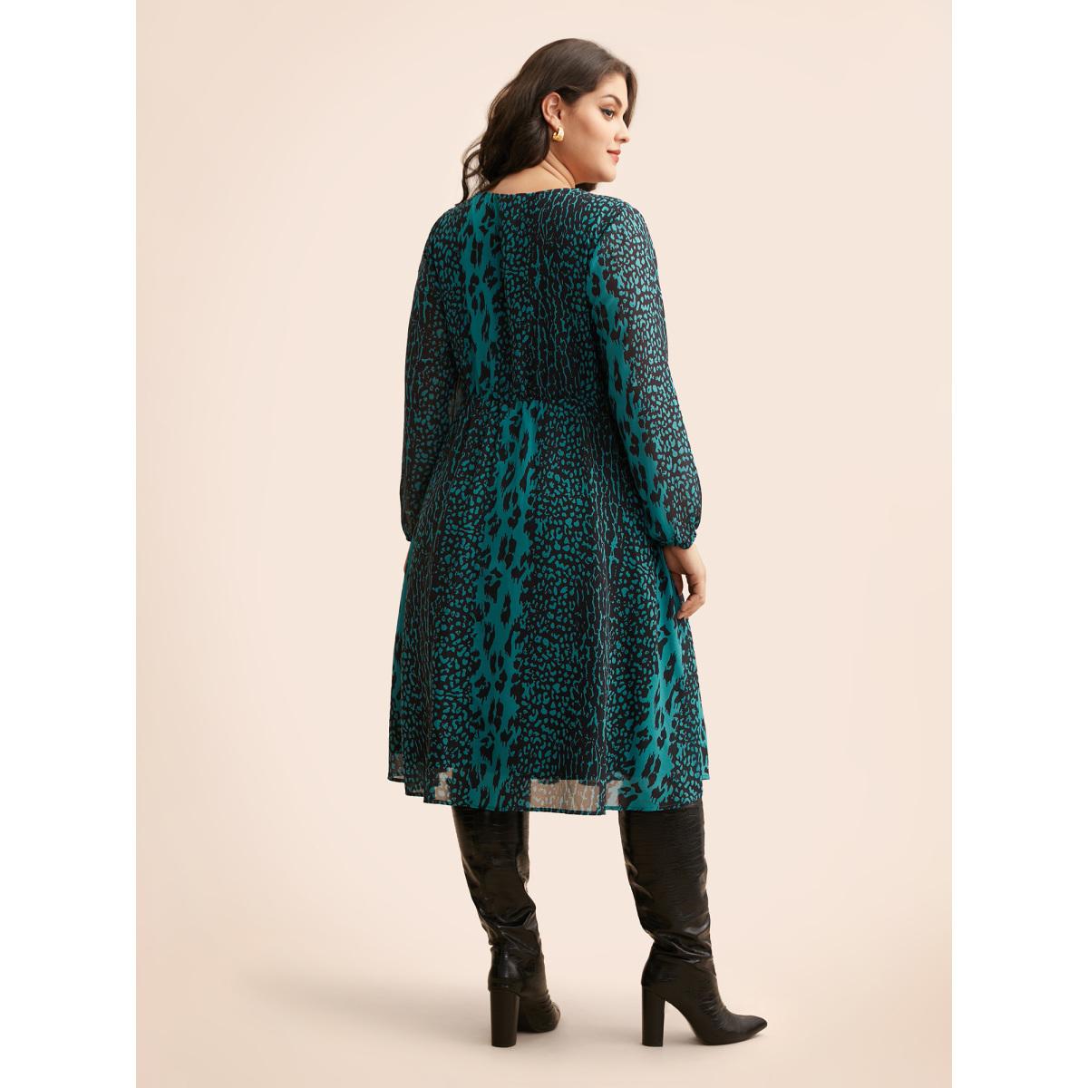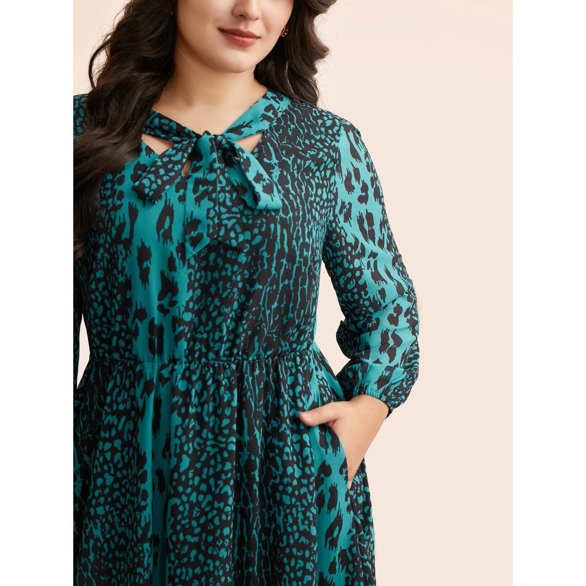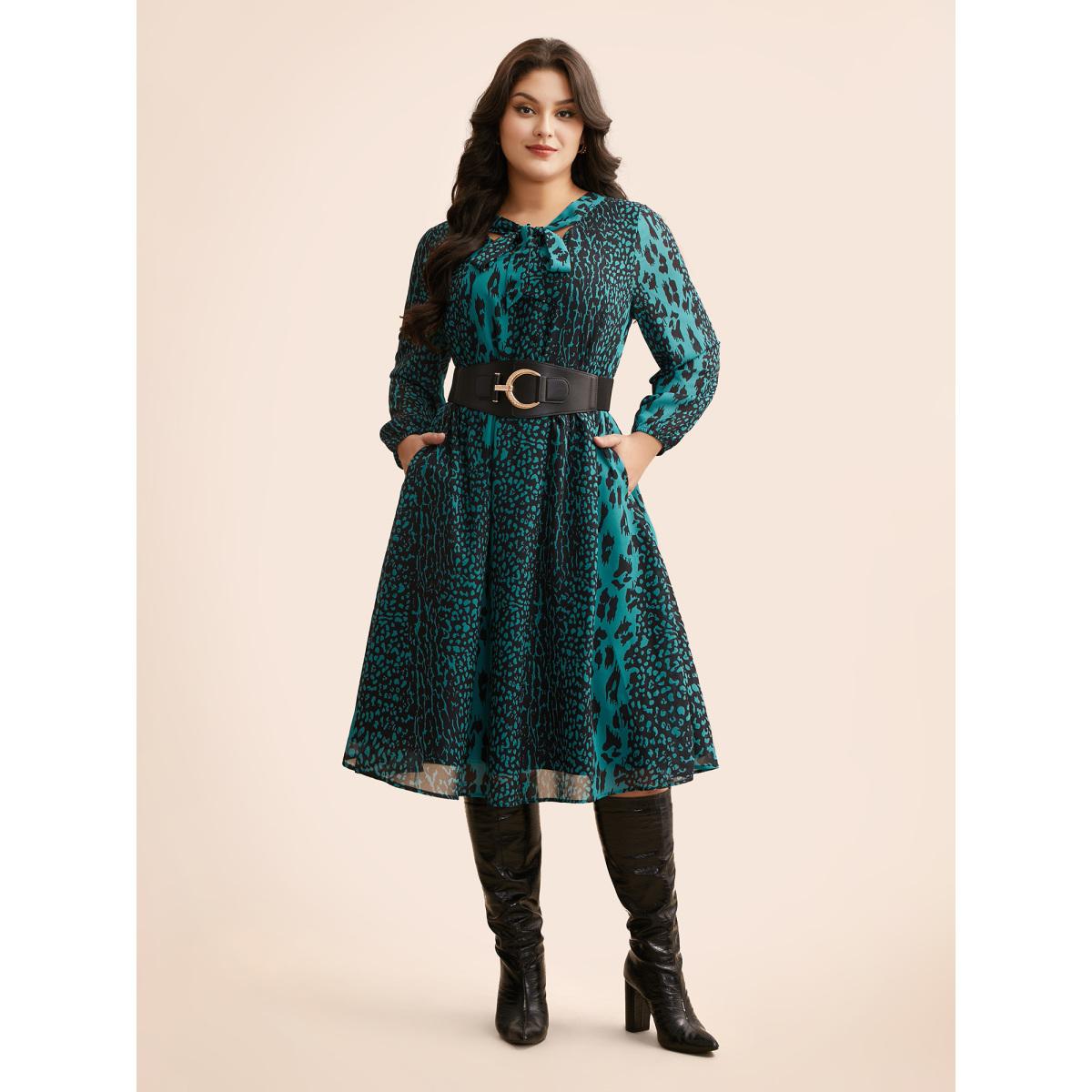 Plus Size Leopard Print Elastic Waist Tie Knot Dress Teal Women Elegant Tie knot Ribbon-tied collar Long Sleeve Curvy BloomChic 26/4X