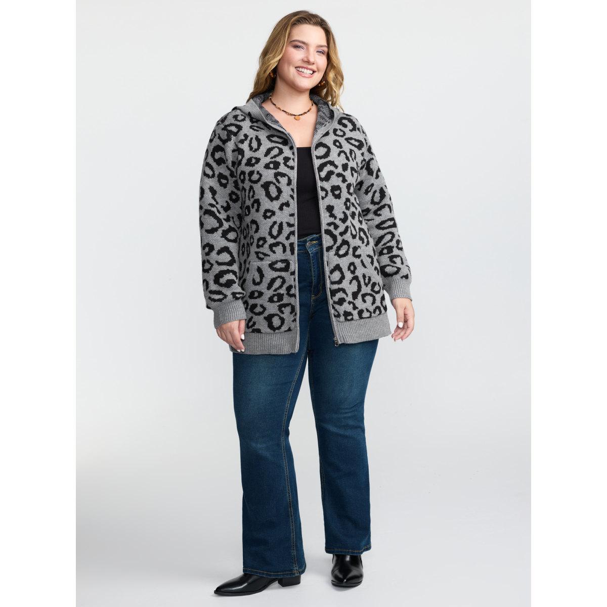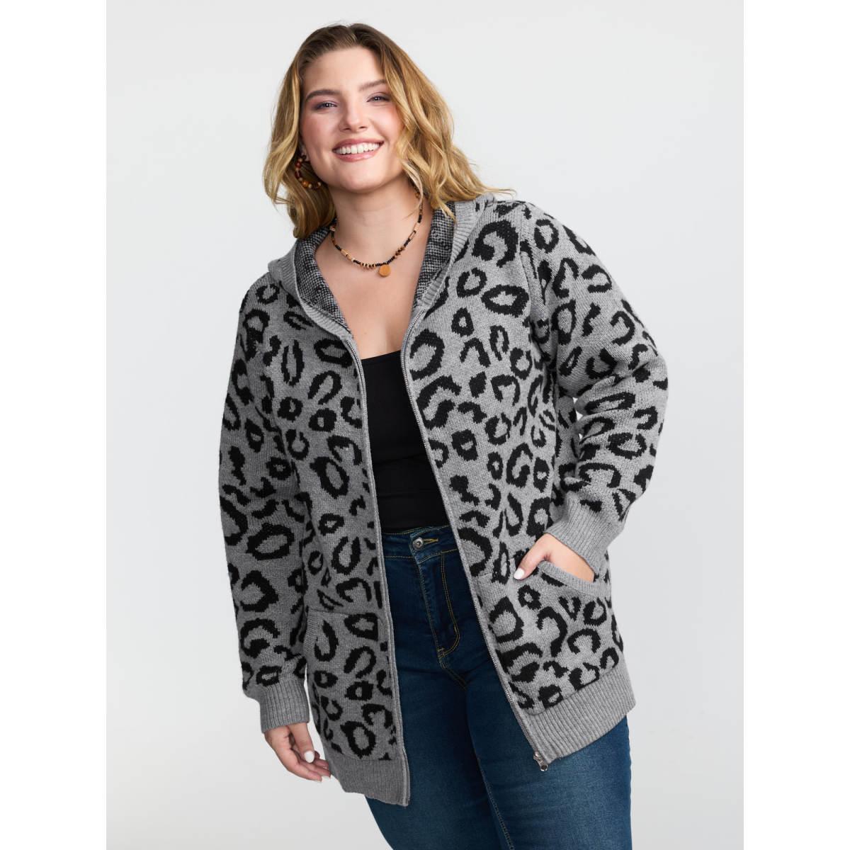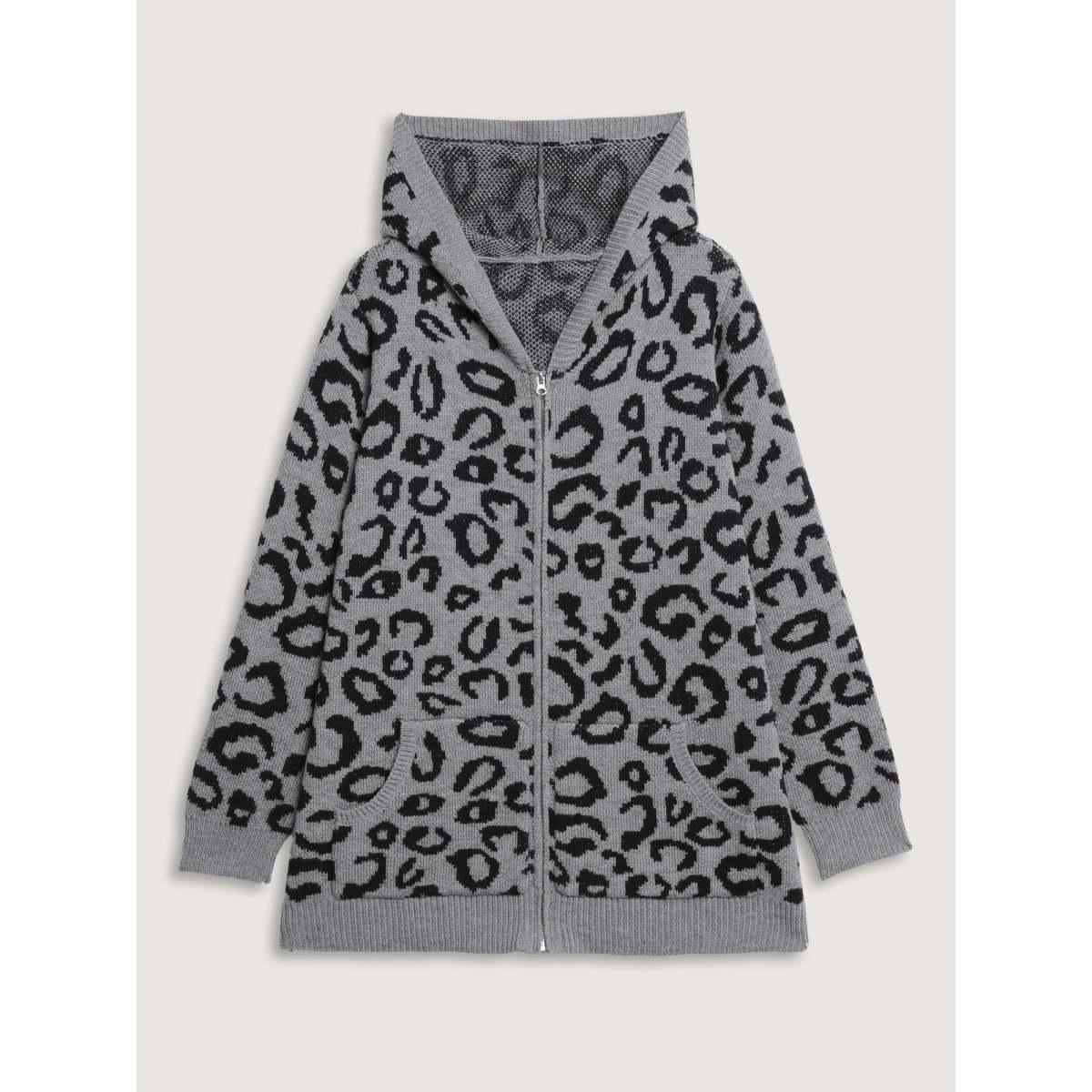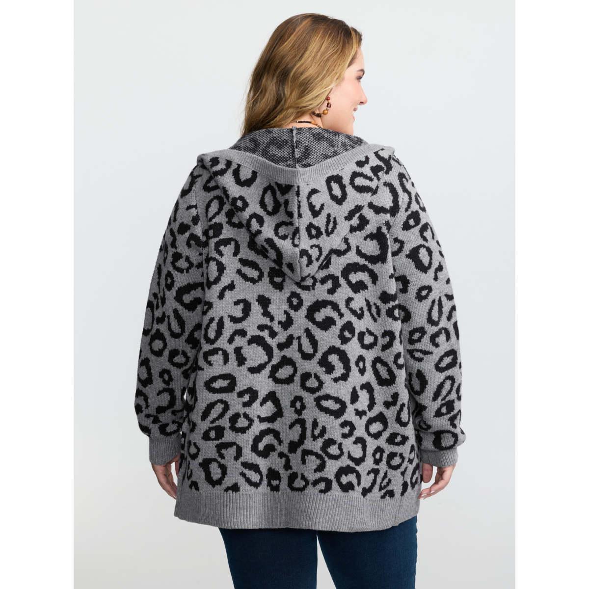 Plus Size Leopard Print Jacquard Hooded Knit Cardigan DarkGray Women Leisure Loose Long Sleeve Casual Cardigans BloomChic 14-16/1X