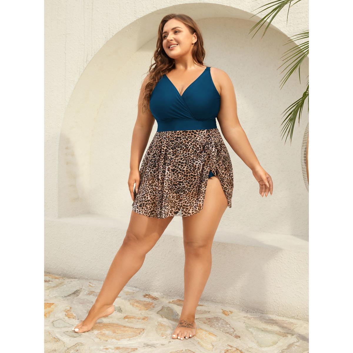 Plus Size Leopard Print Knotted Surplice Swim Dress Women's Swimwear DarkBlue Resort Bodycon Overlap Collar High stretch Curve Swim Dresses BloomChic 12/L
