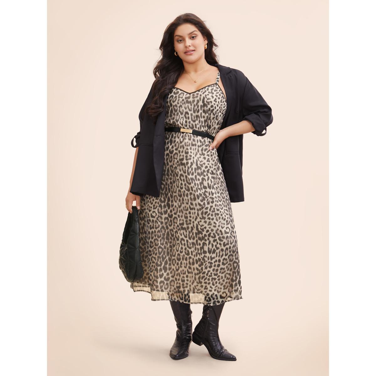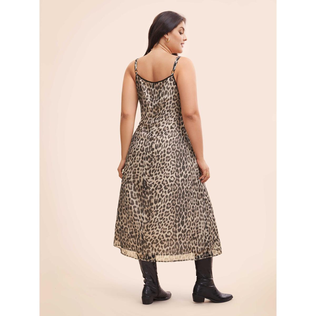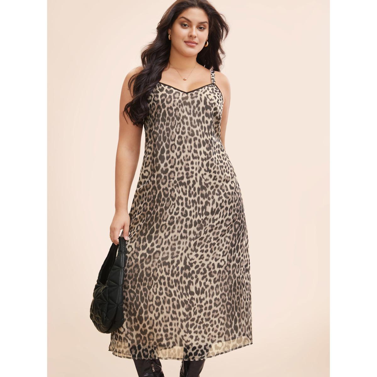 Plus Size Leopard Print Mesh Cami Dress LightBrown Women At the Office See through V-neck Sleeveless Curvy BloomChic 18-20/2X