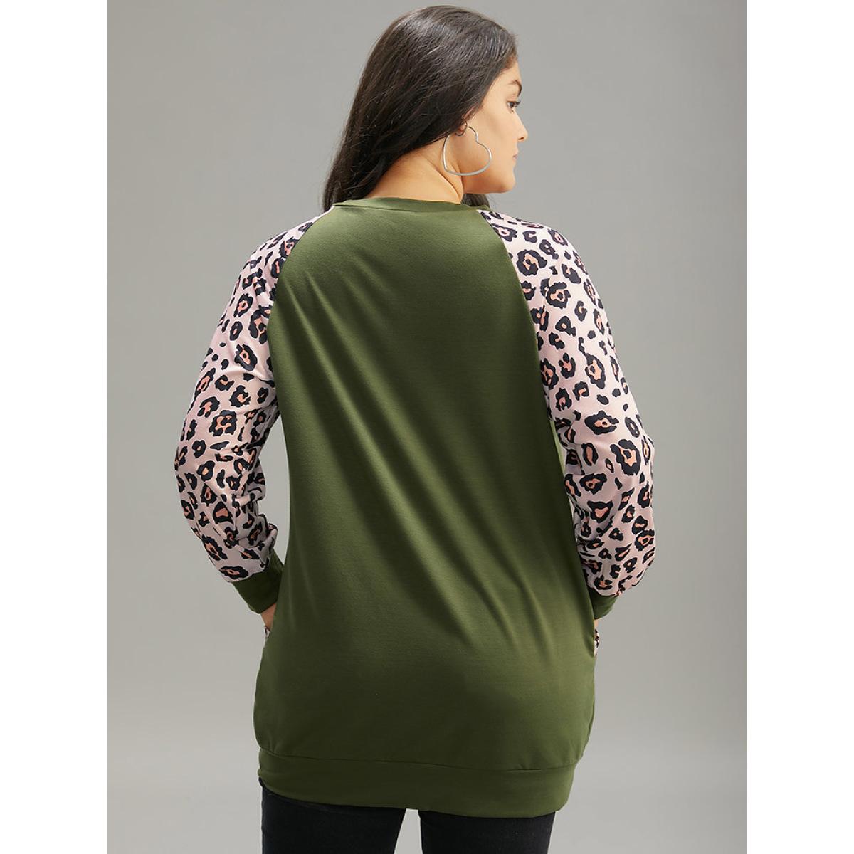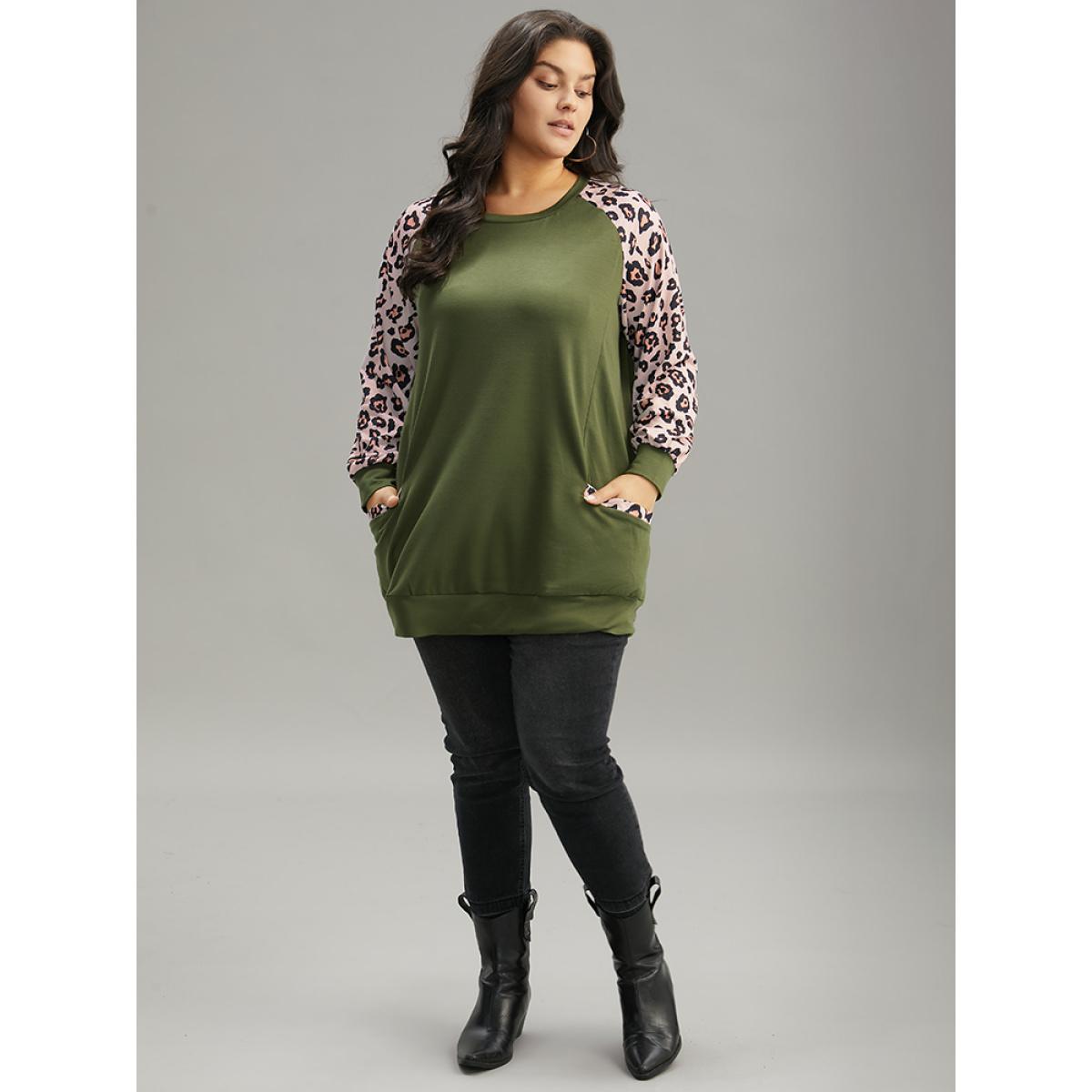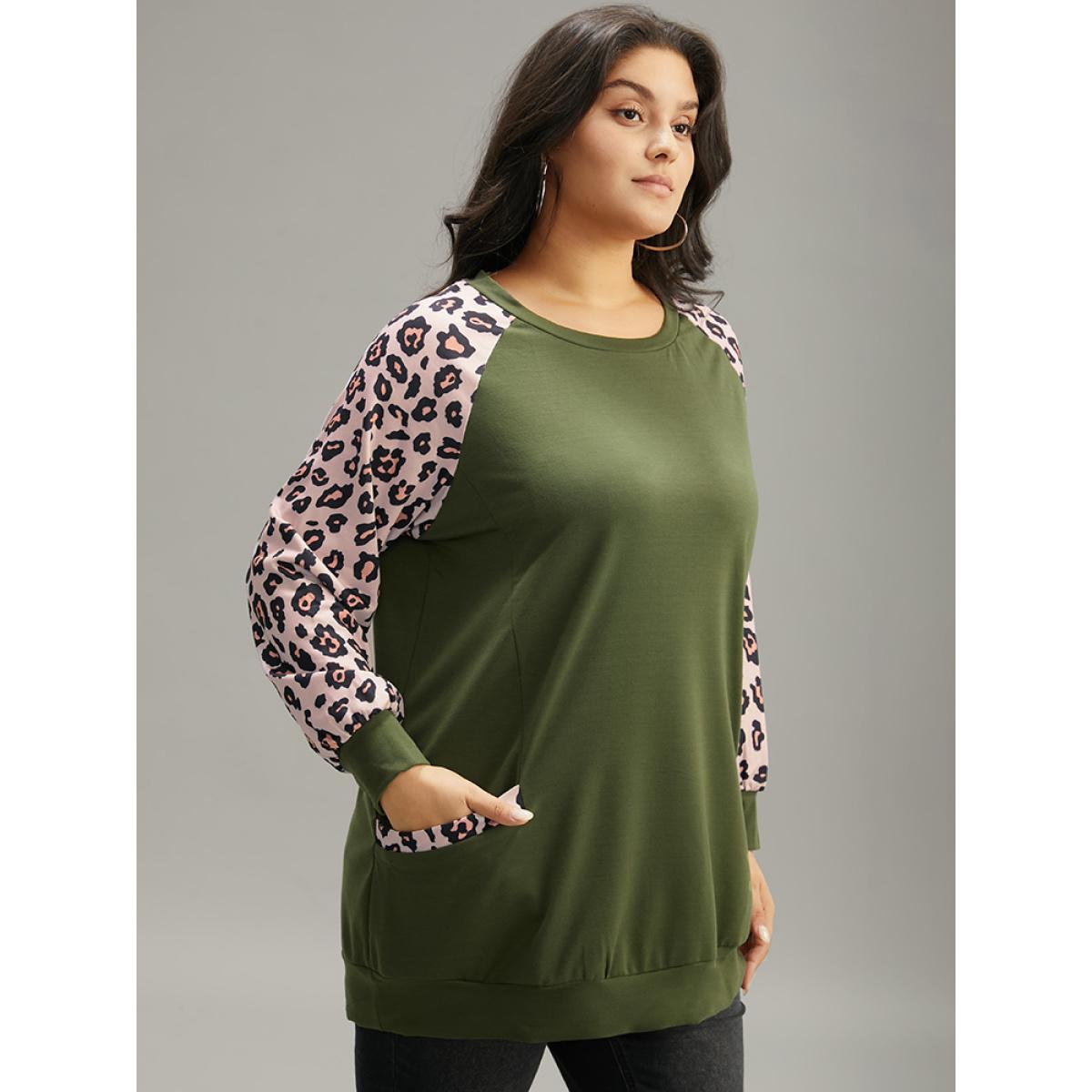 Plus Size Leopard Print Patchwork Contrast Pocket Raglan Sleeve Sweatshirt Women Green Casual Elastic cuffs Round Neck Dailywear Sweatshirts BloomChic 22-24/3X