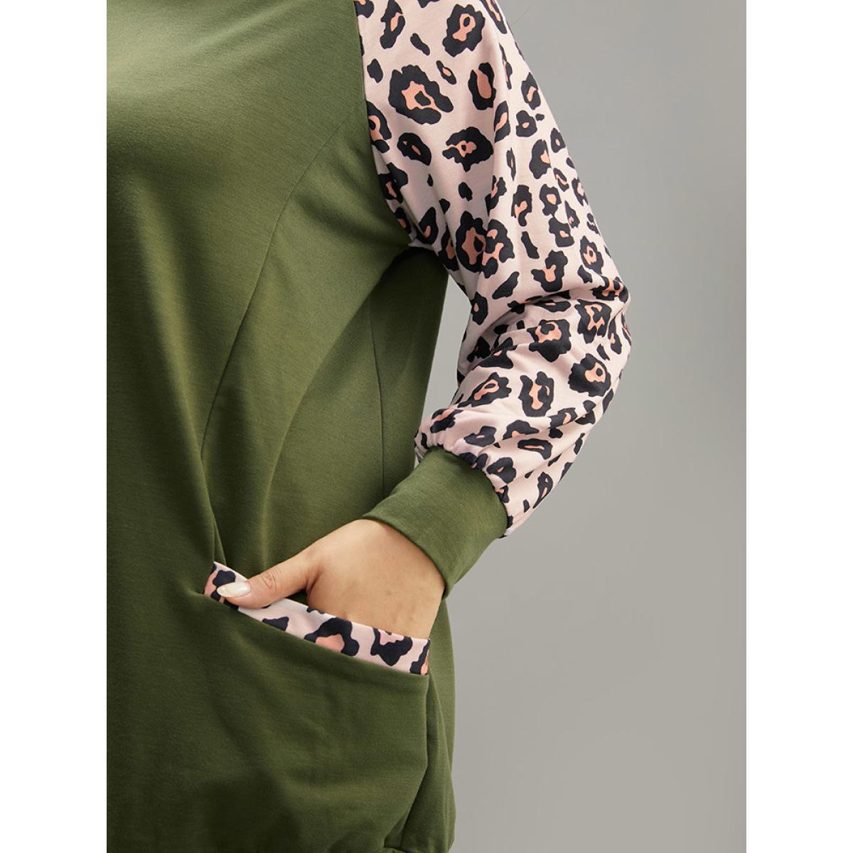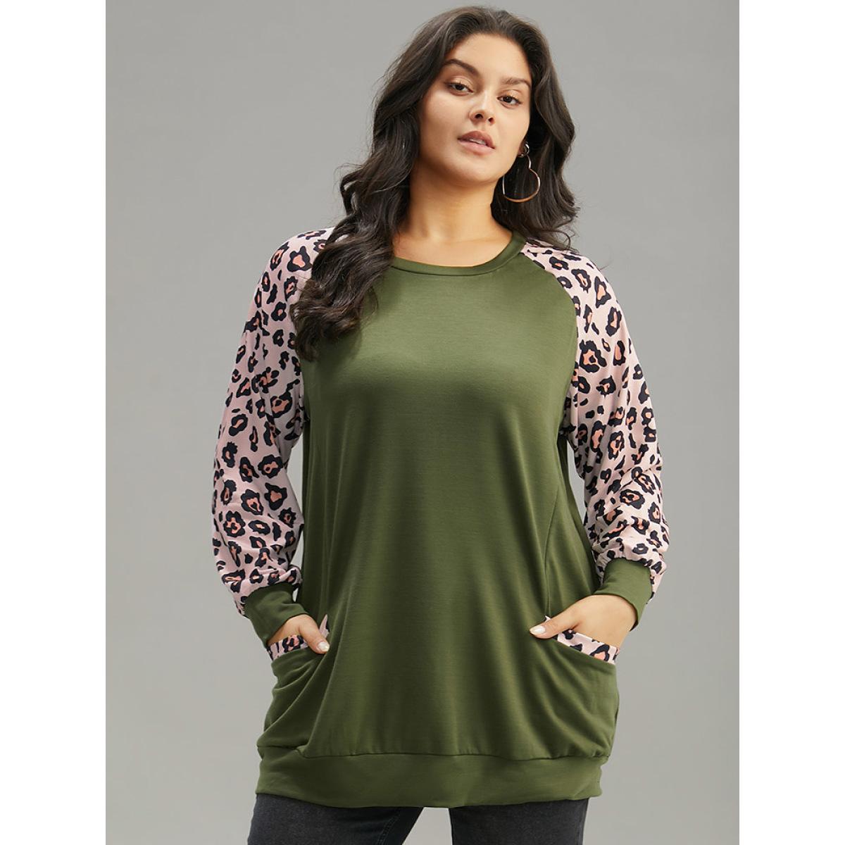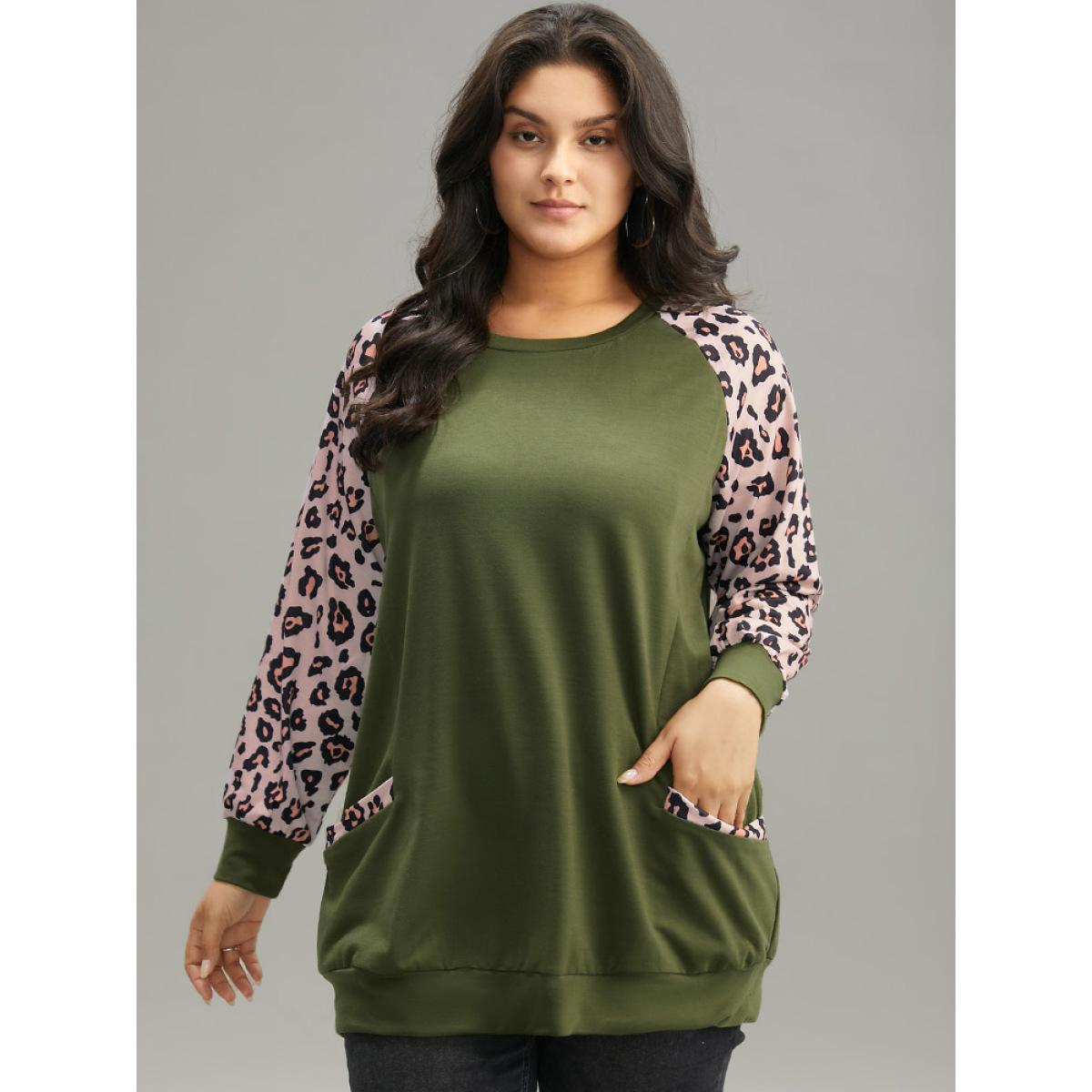 Plus Size Leopard Print Patchwork Contrast Pocket Raglan Sleeve Sweatshirt Women Green Casual Elastic cuffs Round Neck Dailywear Sweatshirts BloomChic 22-24/3X