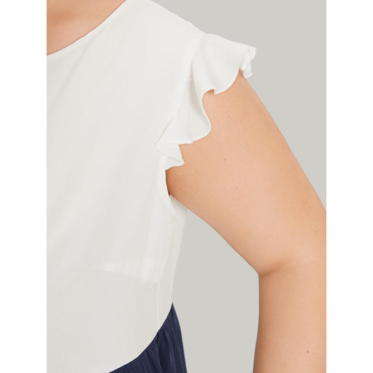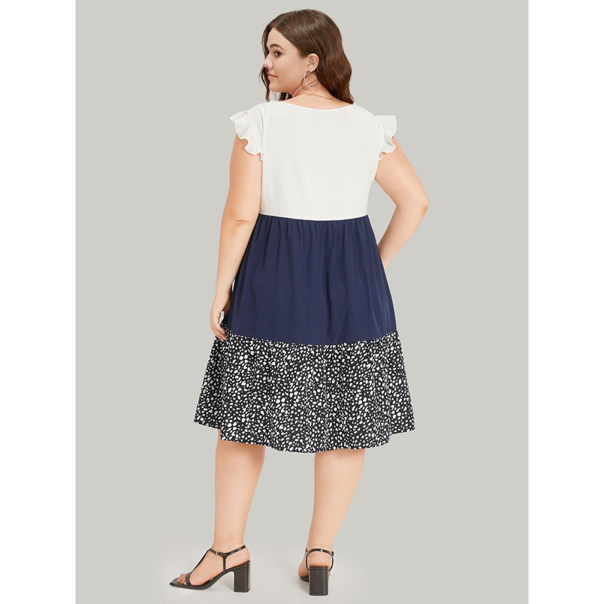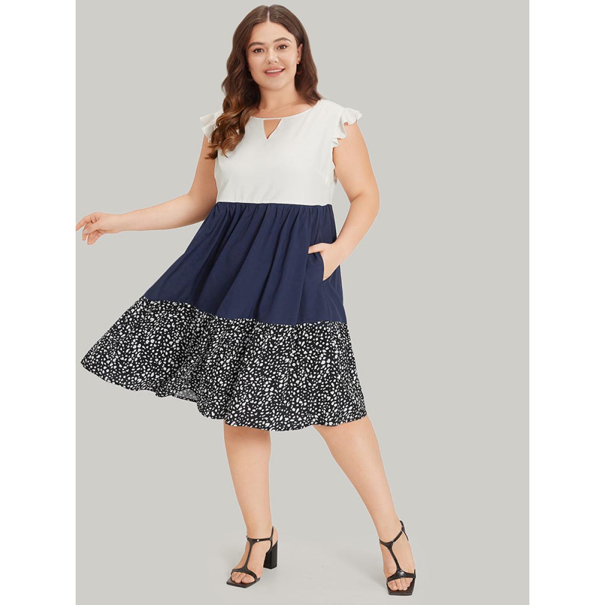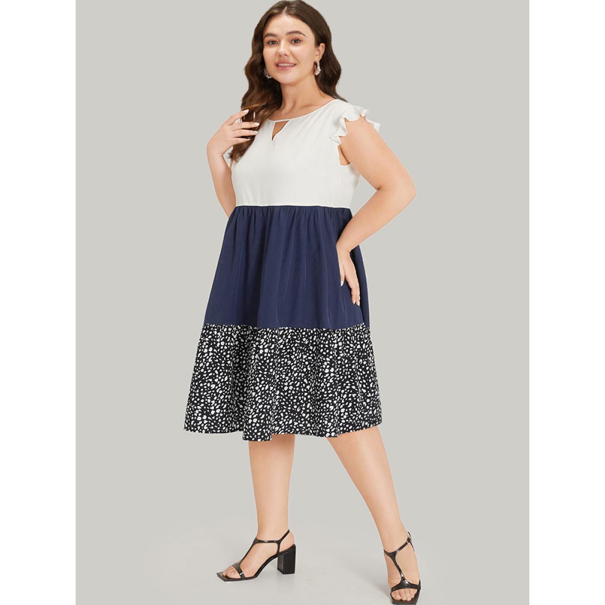 Plus Size Leopard Print Patchwork Ruffle Cap Sleeve Keyhole Dress DarkBlue Women Elegant Patchwork Keyhole Cut-Out Cap Sleeve Curvy Knee Dress BloomChic 30/6X