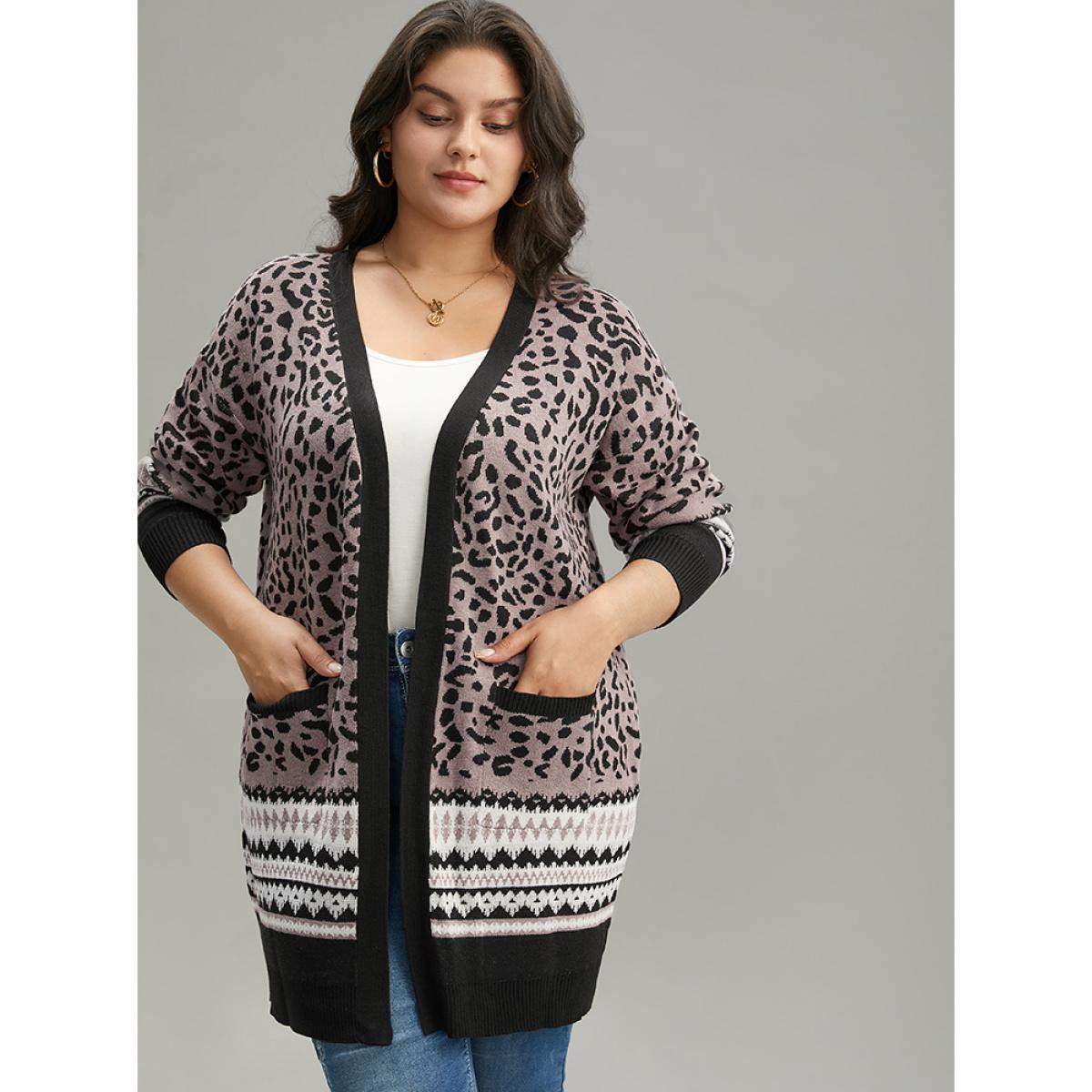 Plus Size Leopard Print Pocket Contrast Trim Cardigan Leopard Women Casual Long Sleeve Dailywear Cardigans BloomChic 18-20/2X