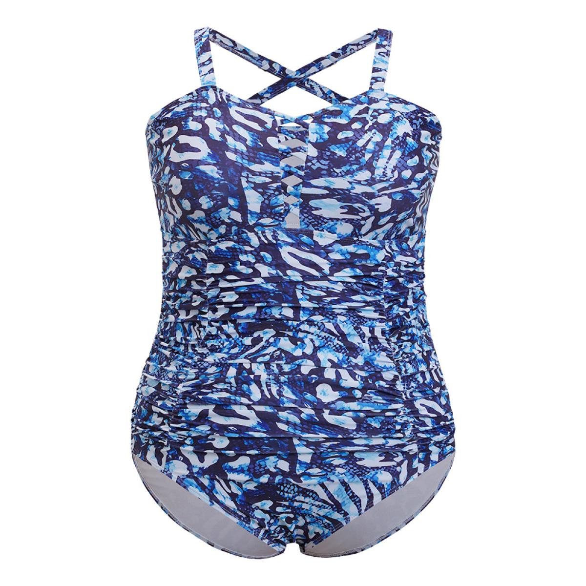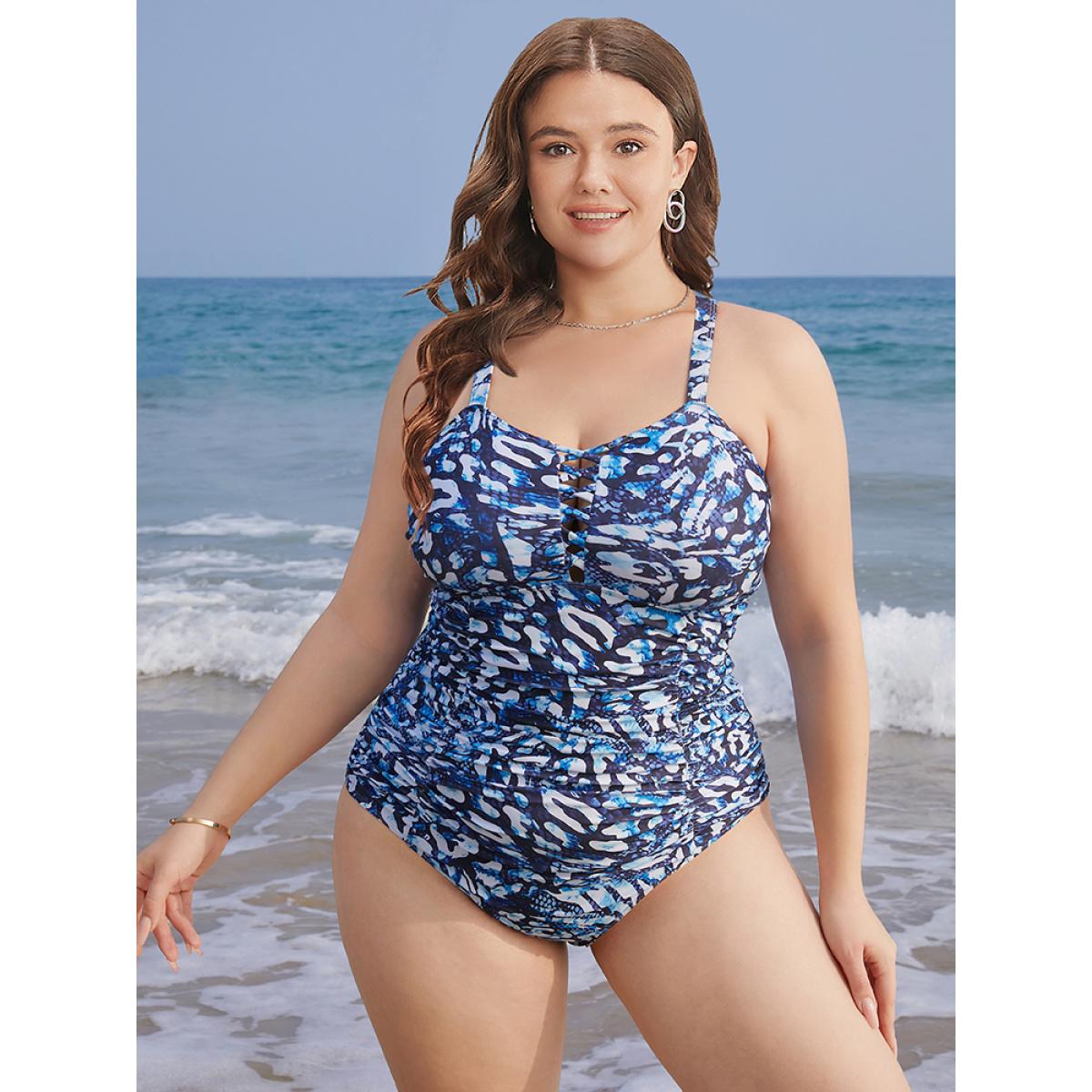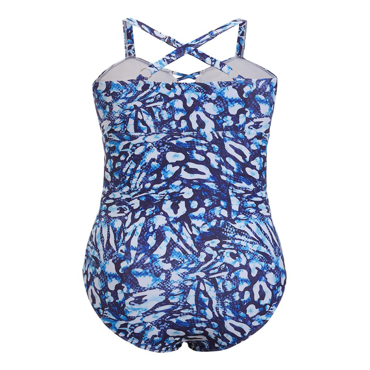 Plus Size Leopard Print Ruched Crisscross Front One Piece Swimsuit Women's Swimwear Blue Vacation Adjustable Straps Curve Bathing Suits High stretch One Pieces BloomChic 10/M