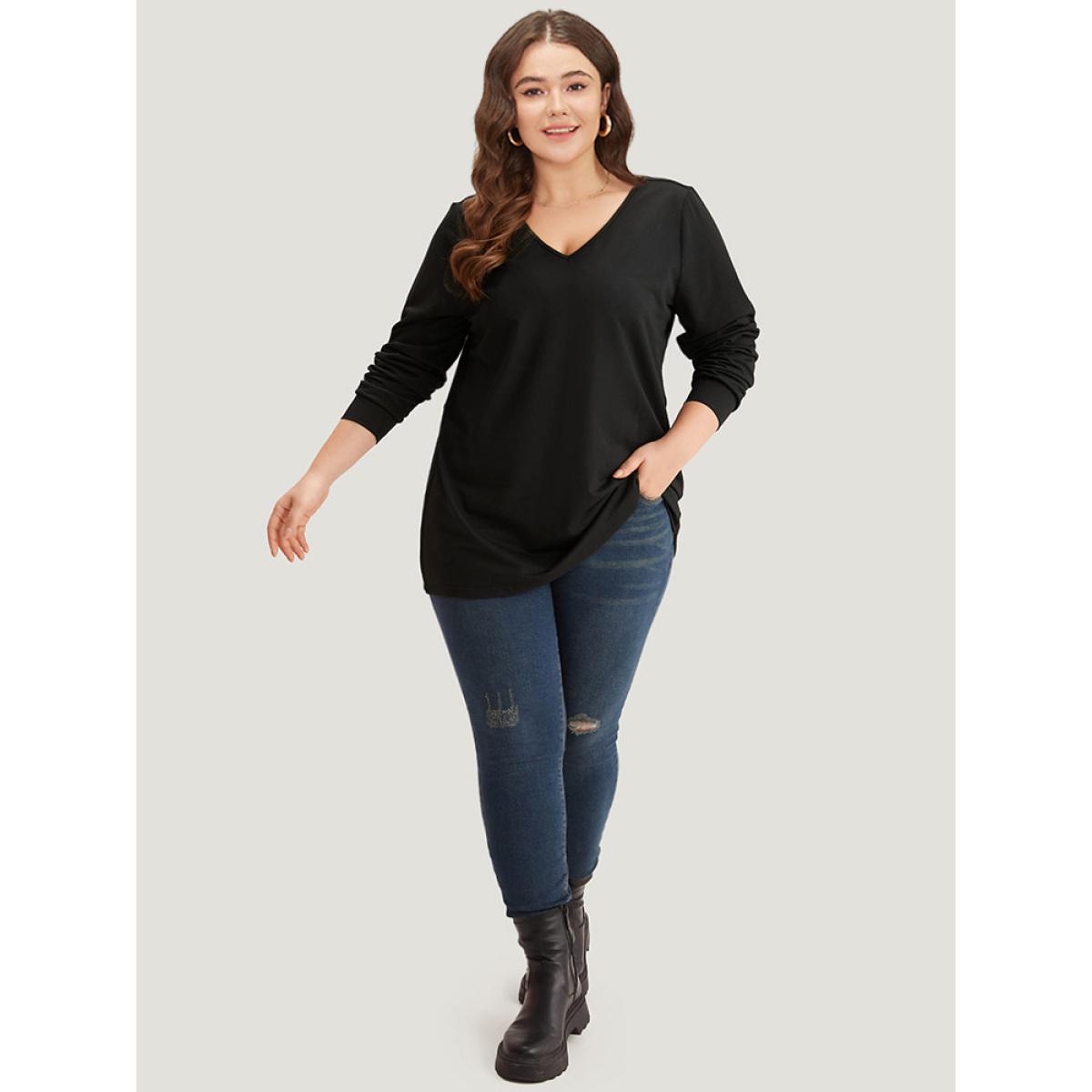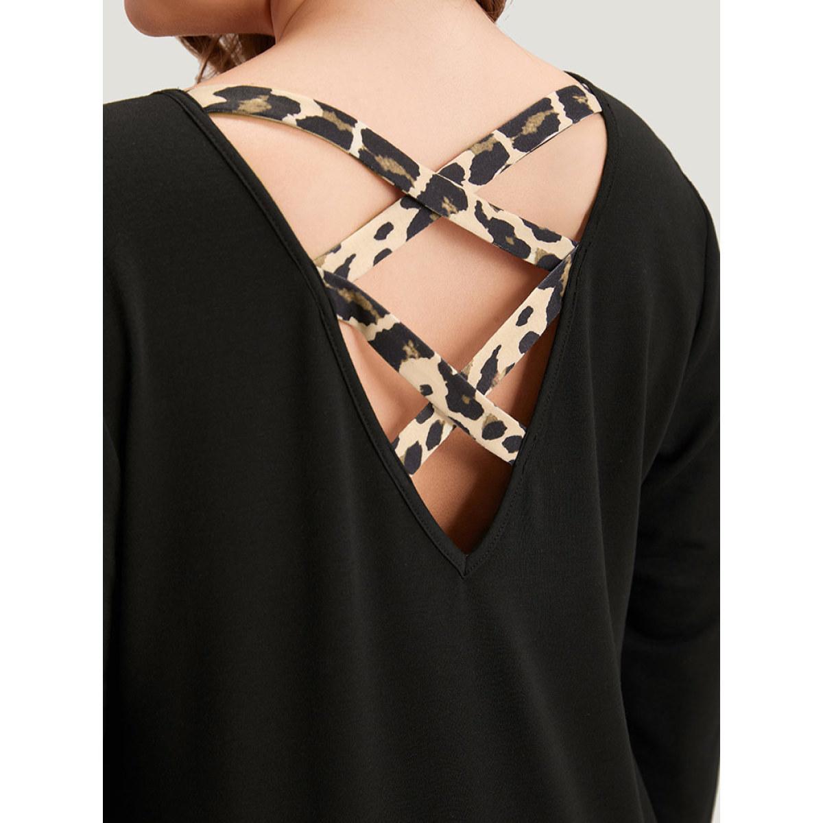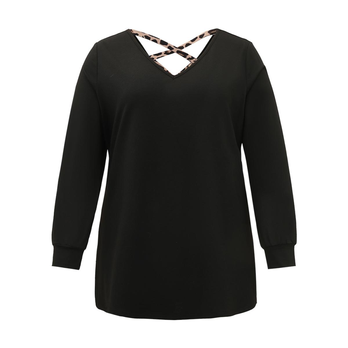 Plus Size Leopard Print V Neck Back Crisscross Sweatshirt Women Black Casual Patchwork V-neck Dailywear Sweatshirts BloomChic 22-24/3X