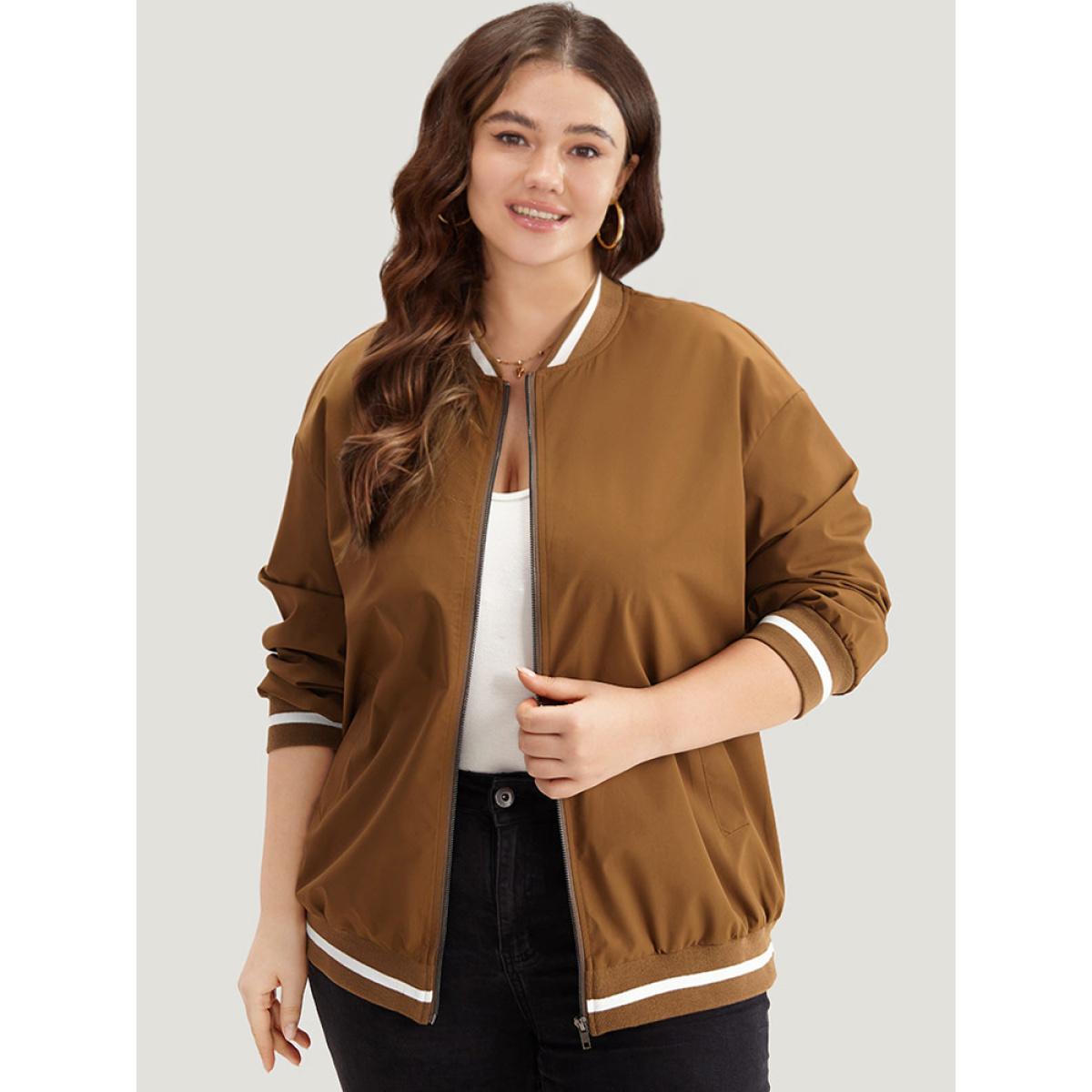 Plus Size Letter Embroidered Pocket Baseball Collar Jacket Women DarkBrown Rib Knit Pocket Dailywear Jackets BloomChic 28/5X