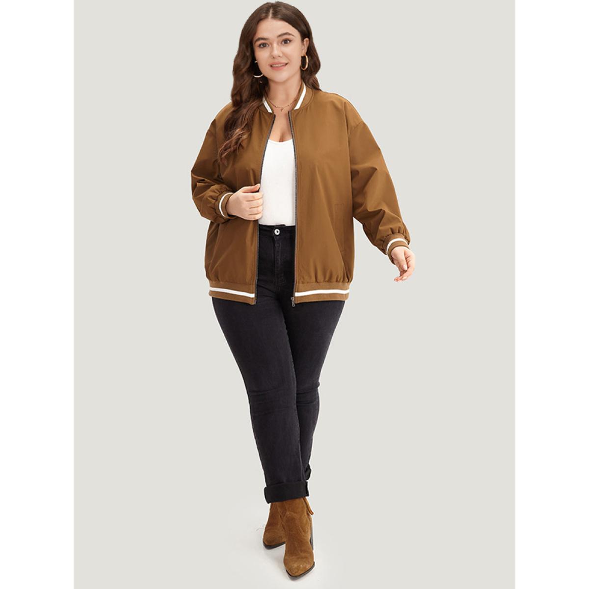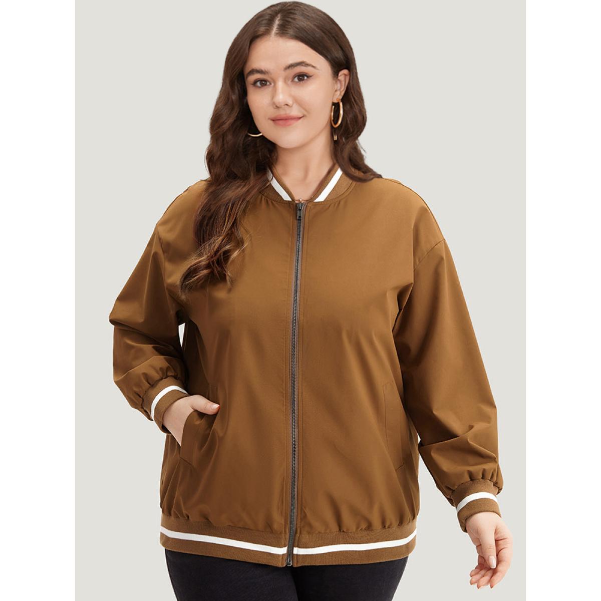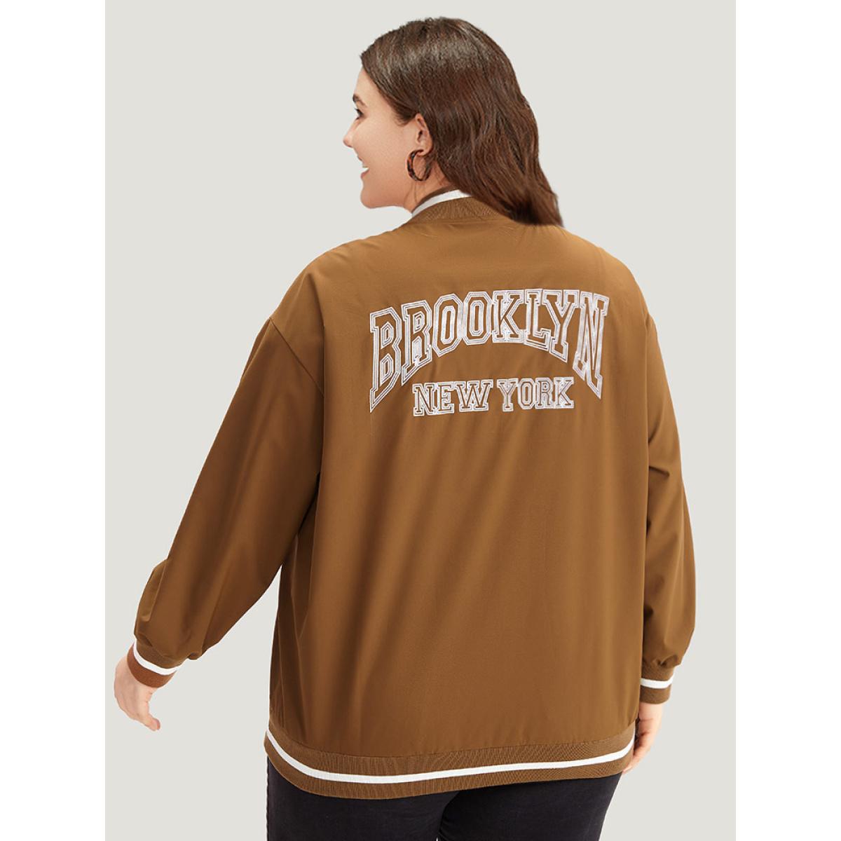 Plus Size Letter Embroidered Pocket Baseball Collar Jacket Women DarkBrown Rib Knit Pocket Dailywear Jackets BloomChic 28/5X Product Image