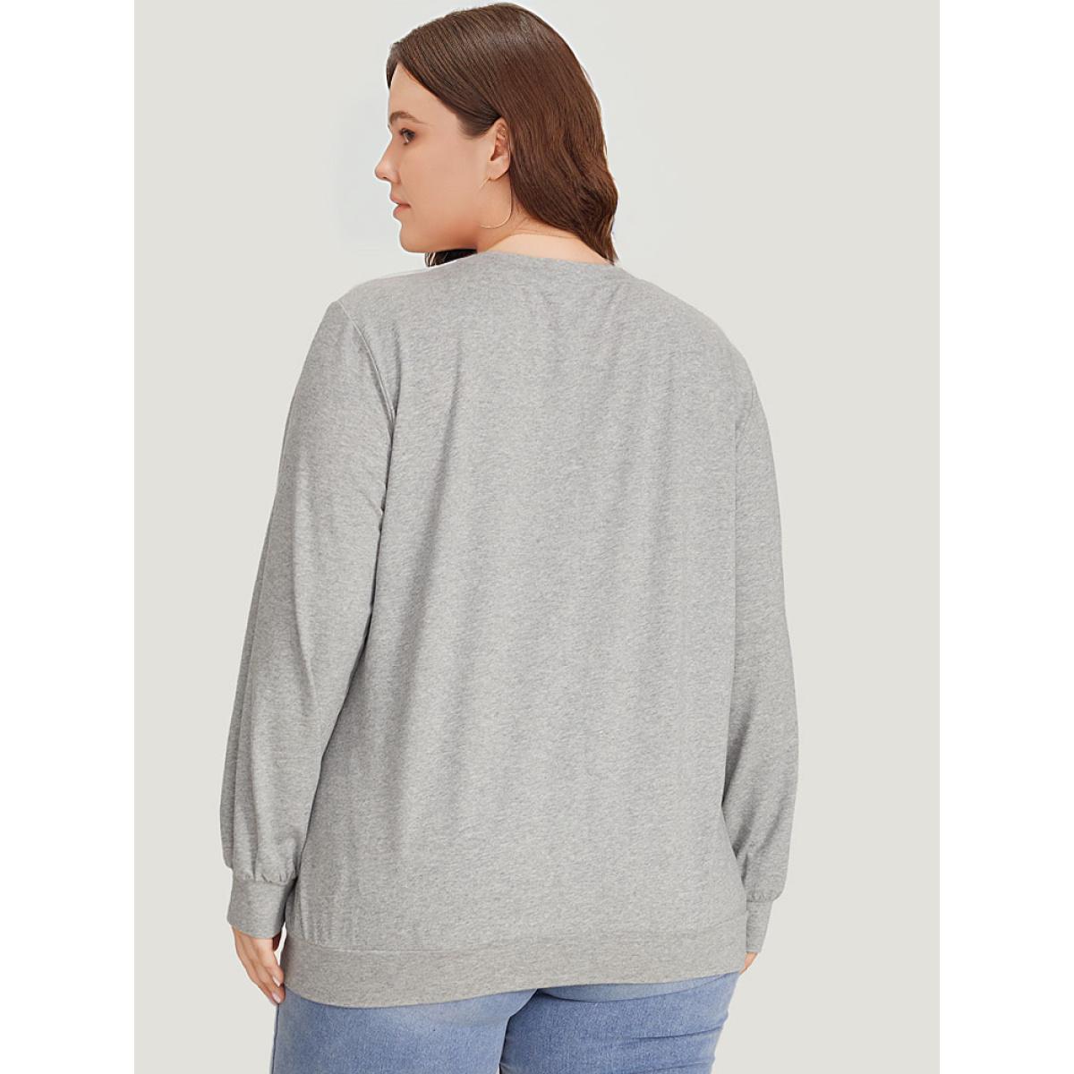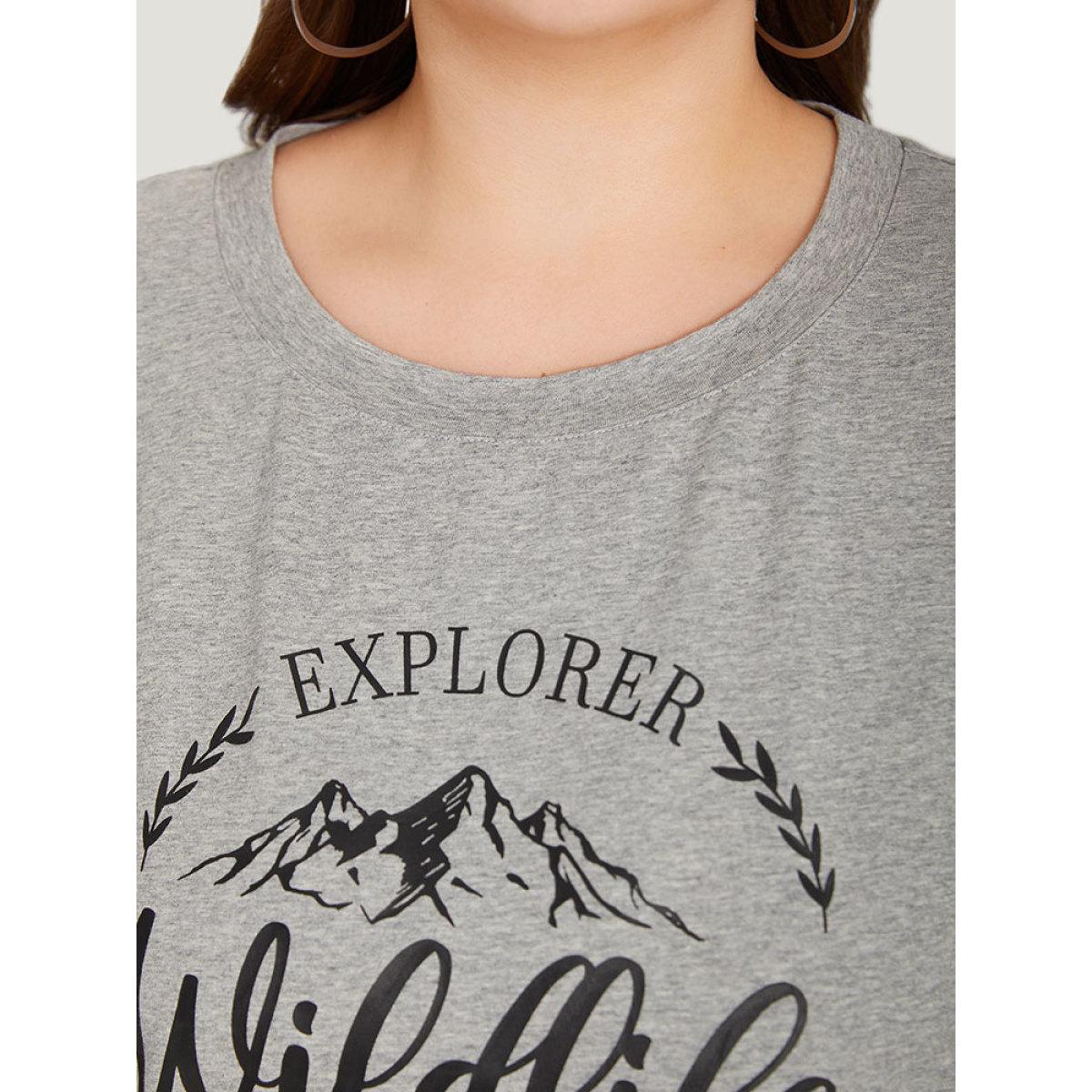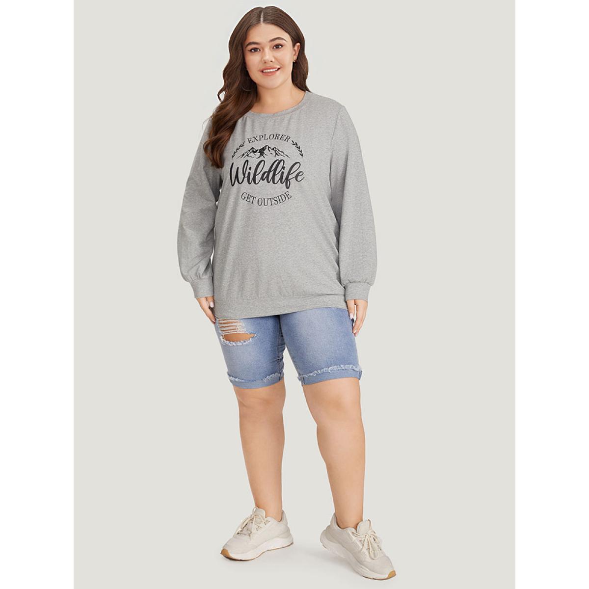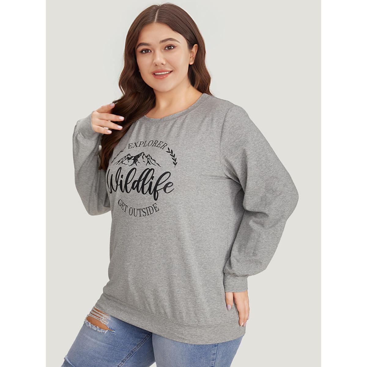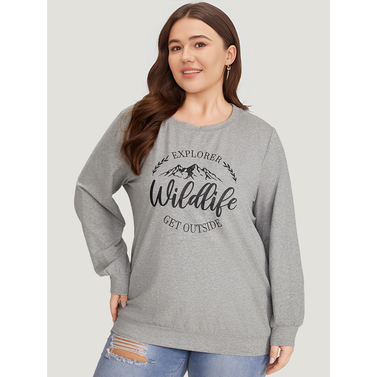 Plus Size Letter & Mountain Print Round Neck Sweatshirt Women LightGray Casual Printed Dailywear Sweatshirts BloomChic 12/L