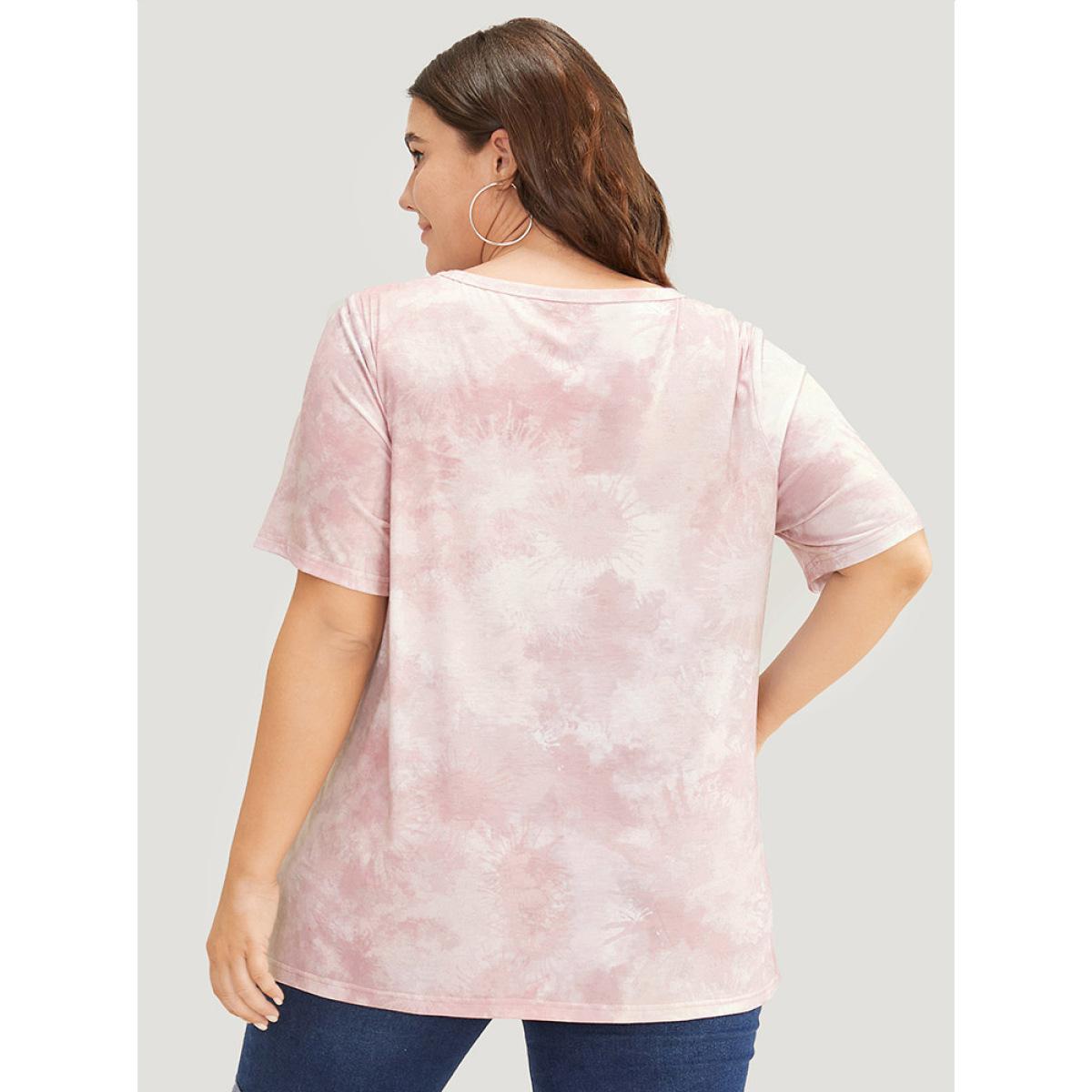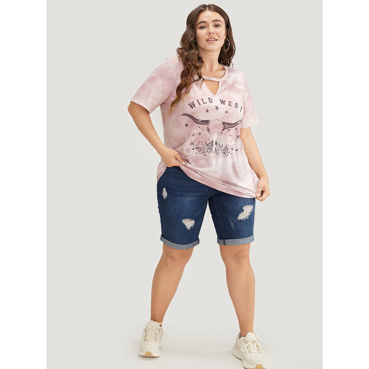 Plus Size Letter & Star Print Keyhole Tie Dye T-shirt MistyRose Women Casual Keyhole Western Dailywear T-shirts BloomChic 10/M