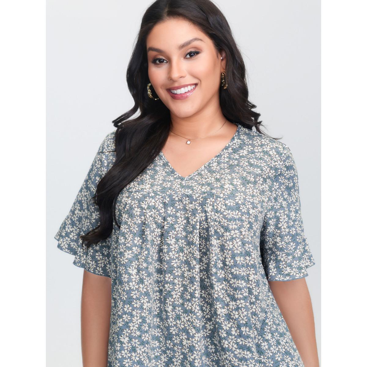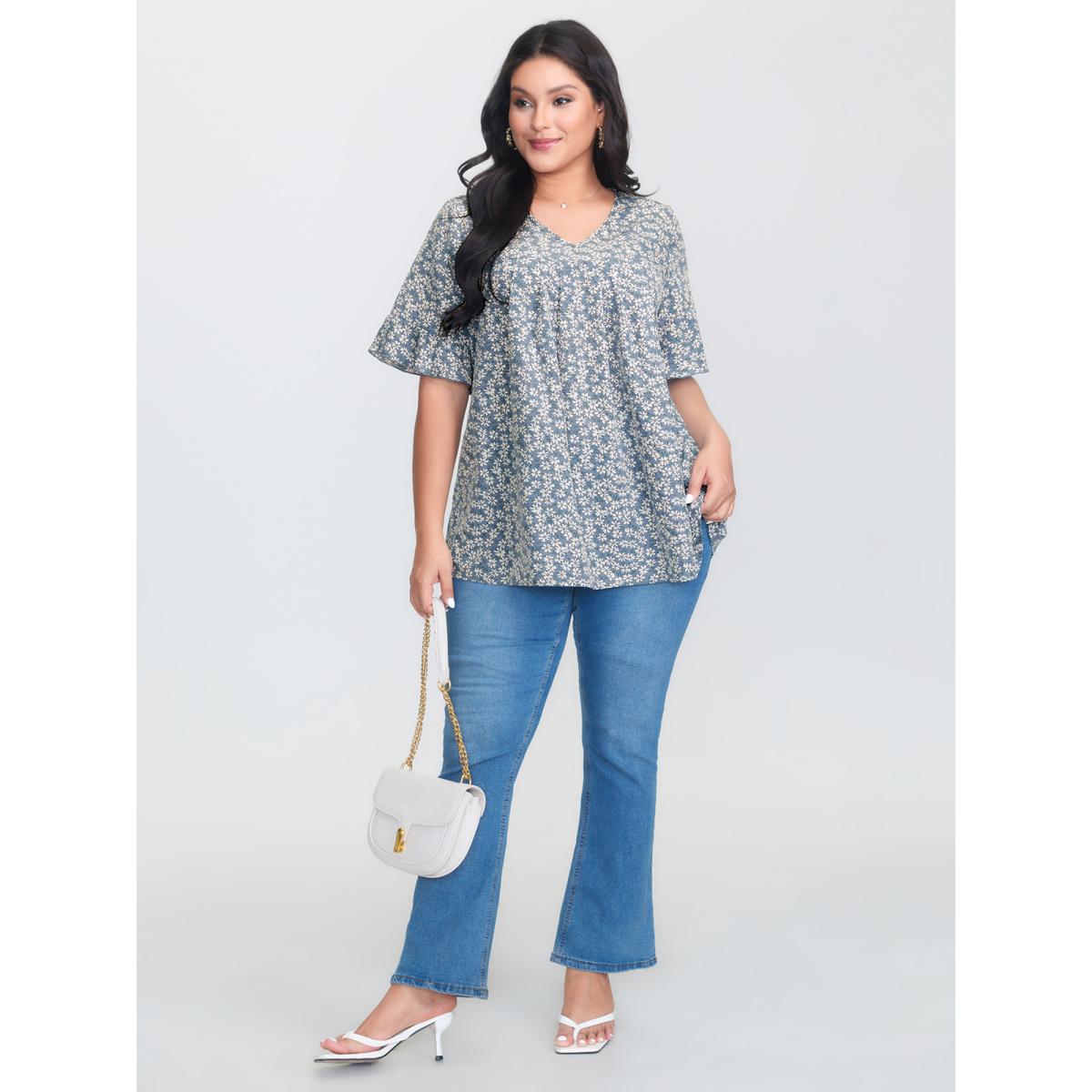 Plus Size LightBlue Ditsy Floral Pleated Flared Sleeve Shirt Women Timeless Half Sleeve V-neck Elegant Blouses BloomChic 28/5X