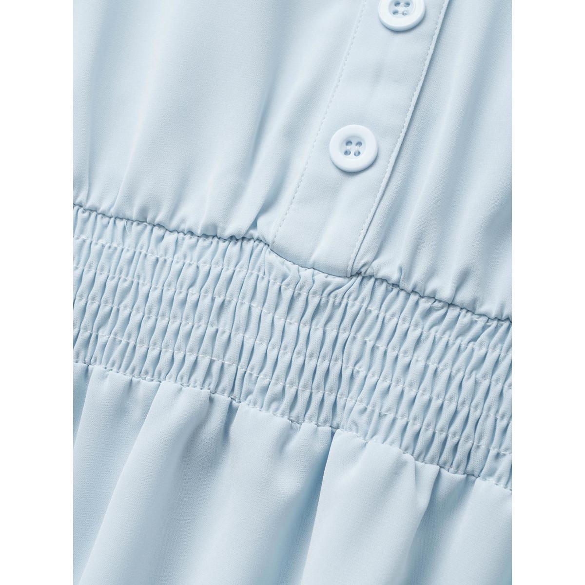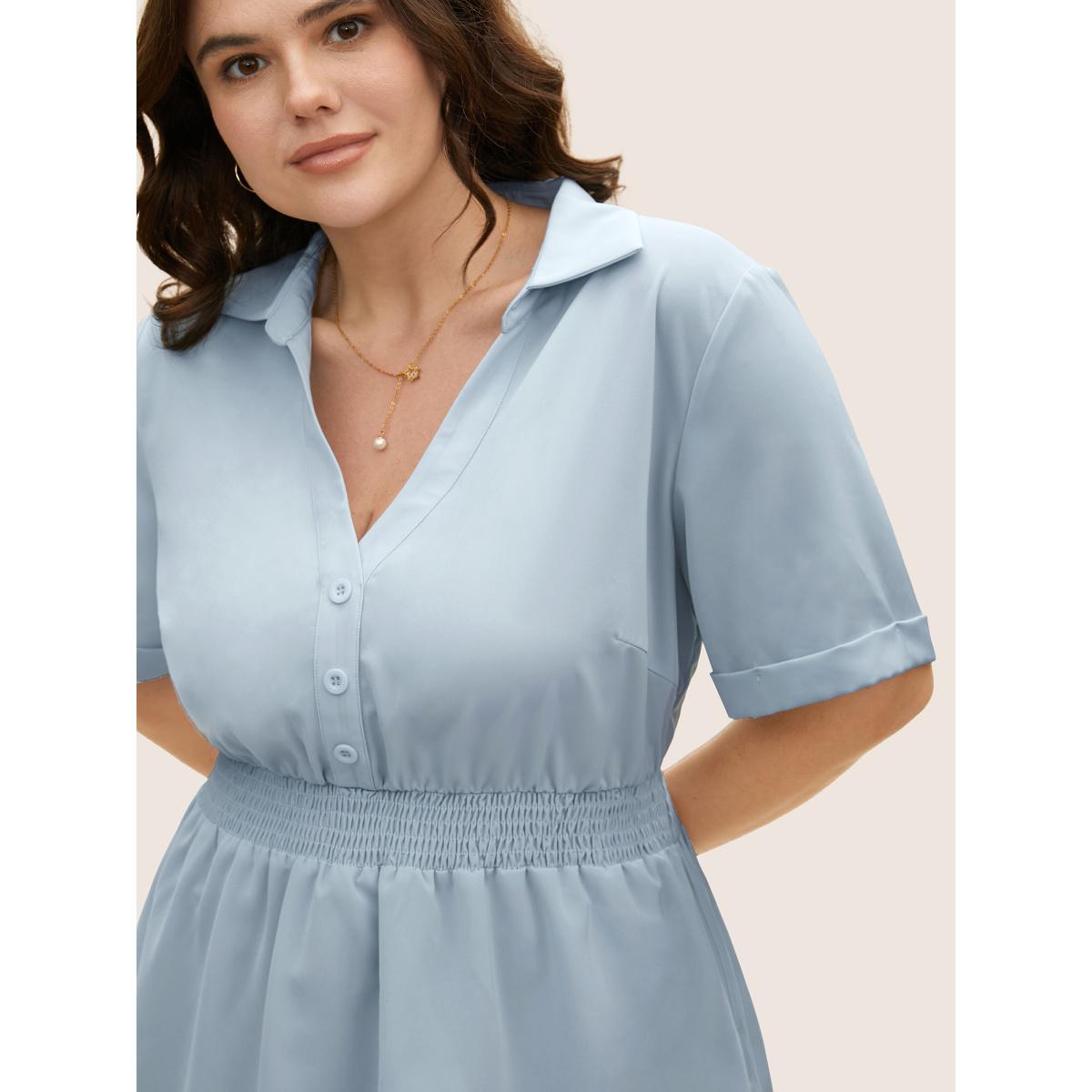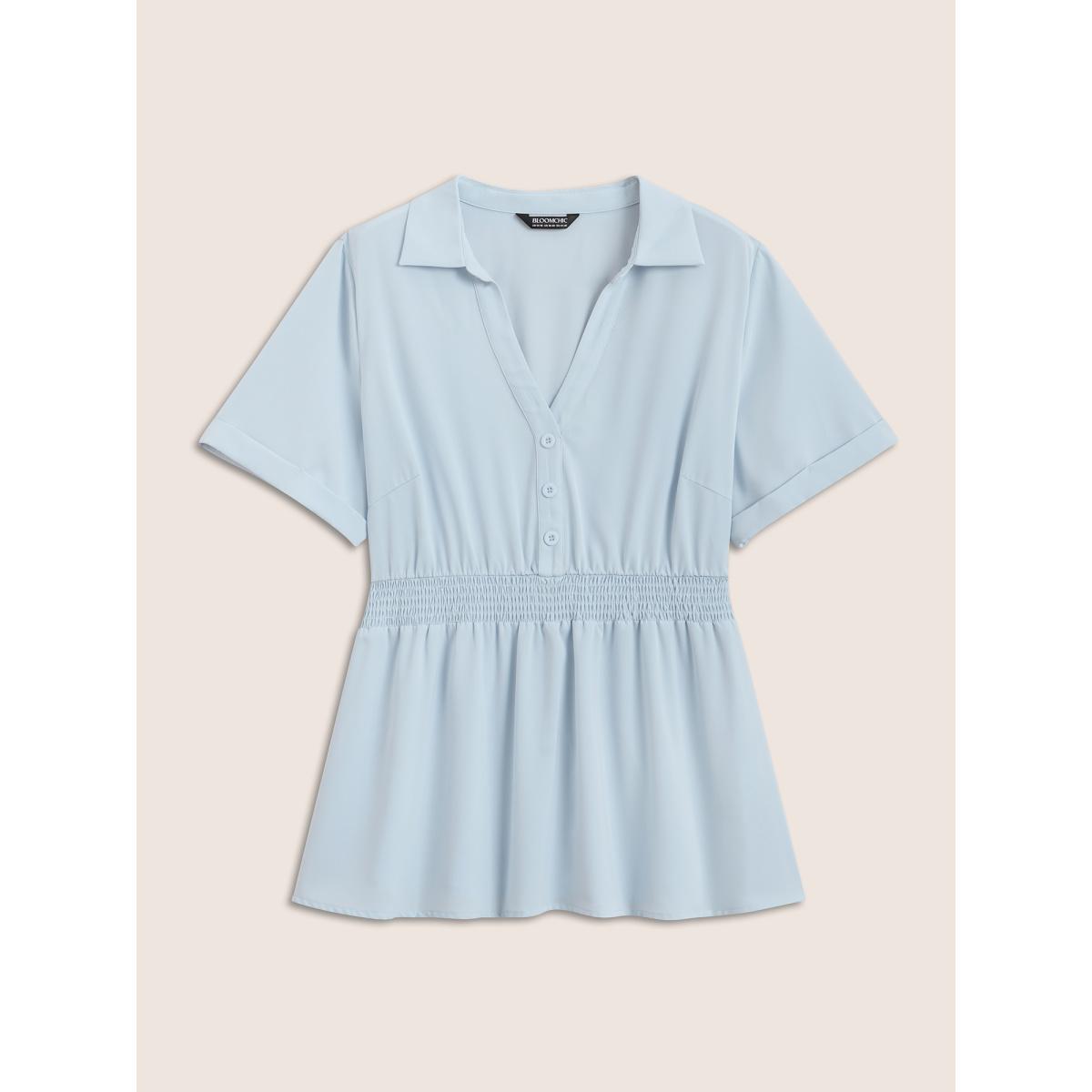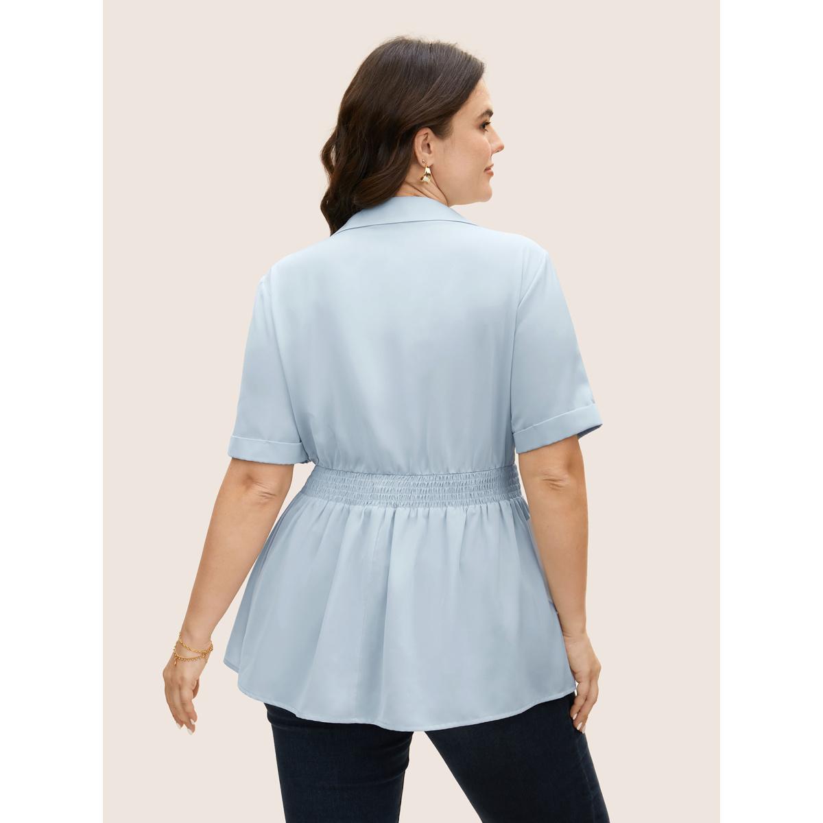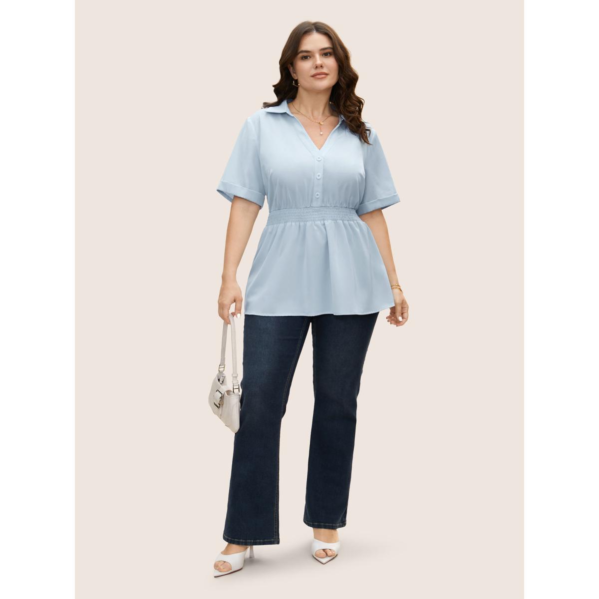 Plus Size LightBlue Lapel Collar Shirred Button Detail Blouse Women Workwear Essentials Short sleeve Shirt collar Work Blouses BloomChic 22-24/3X