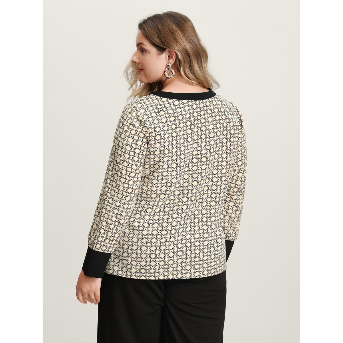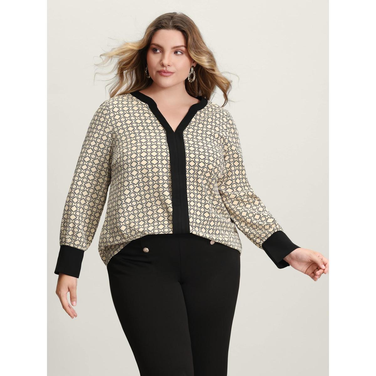 Plus Size LightBrown Geometric Print Color Contrast Blouse Women Office Extra Long Sleeve Flat collar with V-notch Office Blouses BloomChic 30/6X