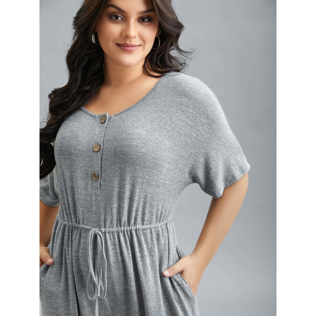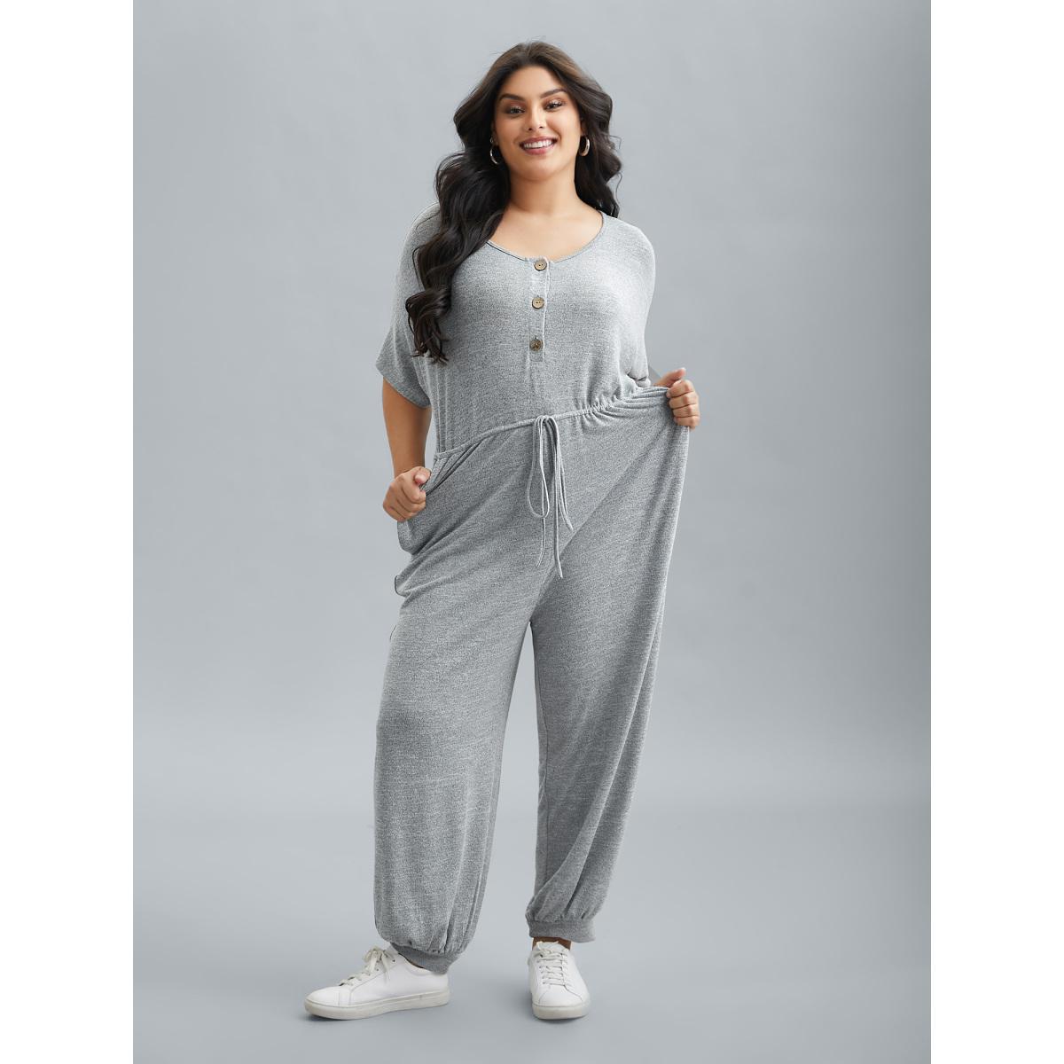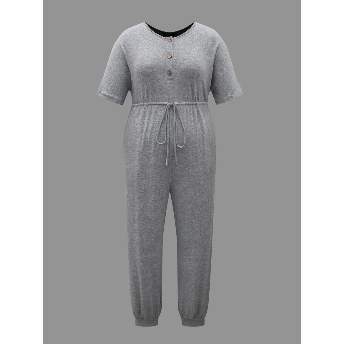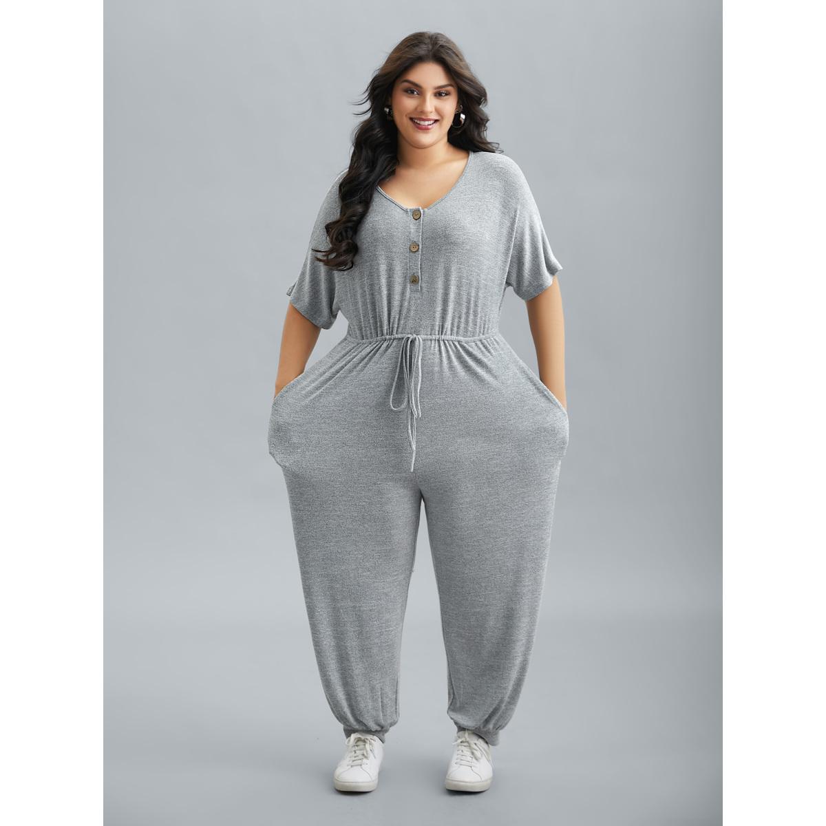 Plus Size LightGray Supersoft Button Drawstring Straight Jumpsuit Women Casual Half Sleeve Round Neck Everyday Loose Jumpsuits BloomChic 22-24/3X