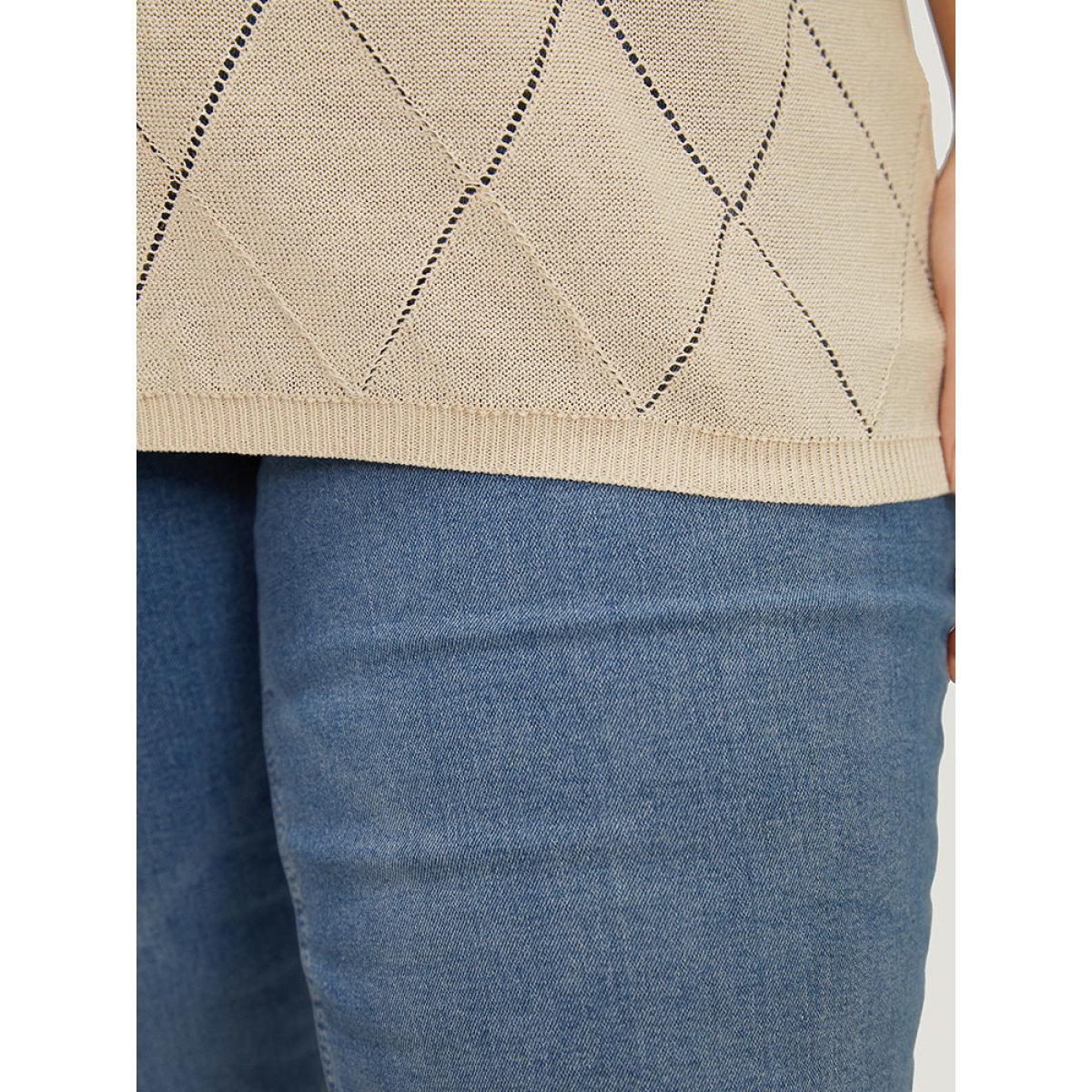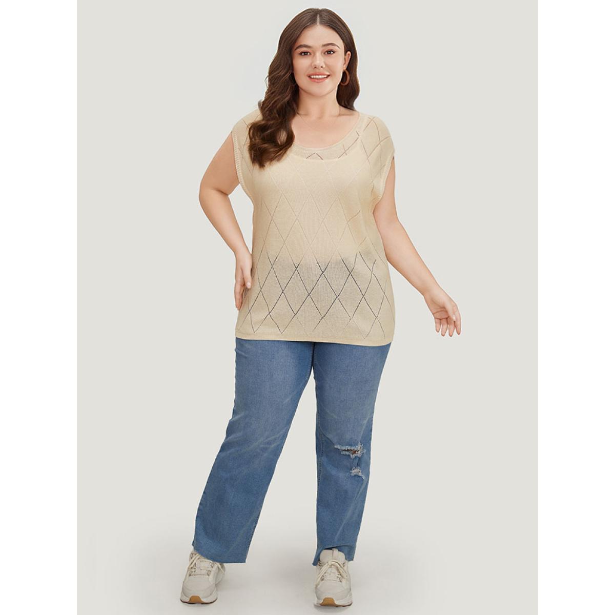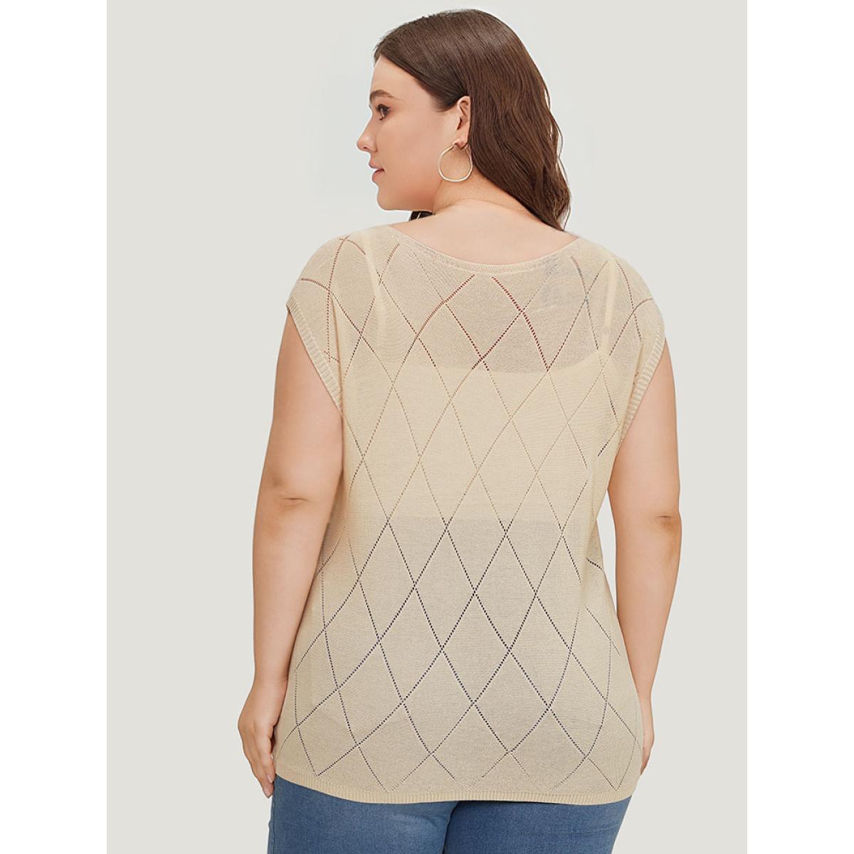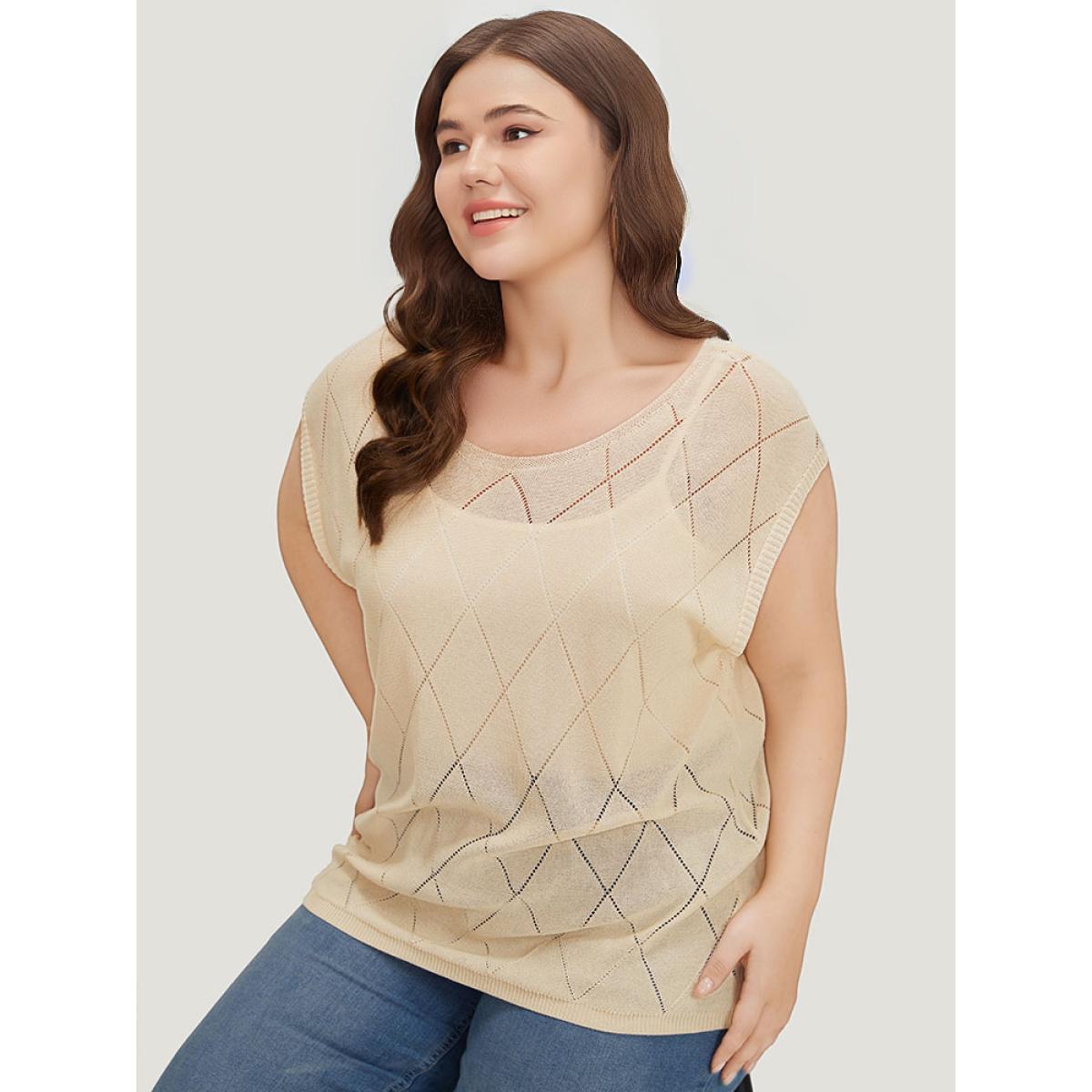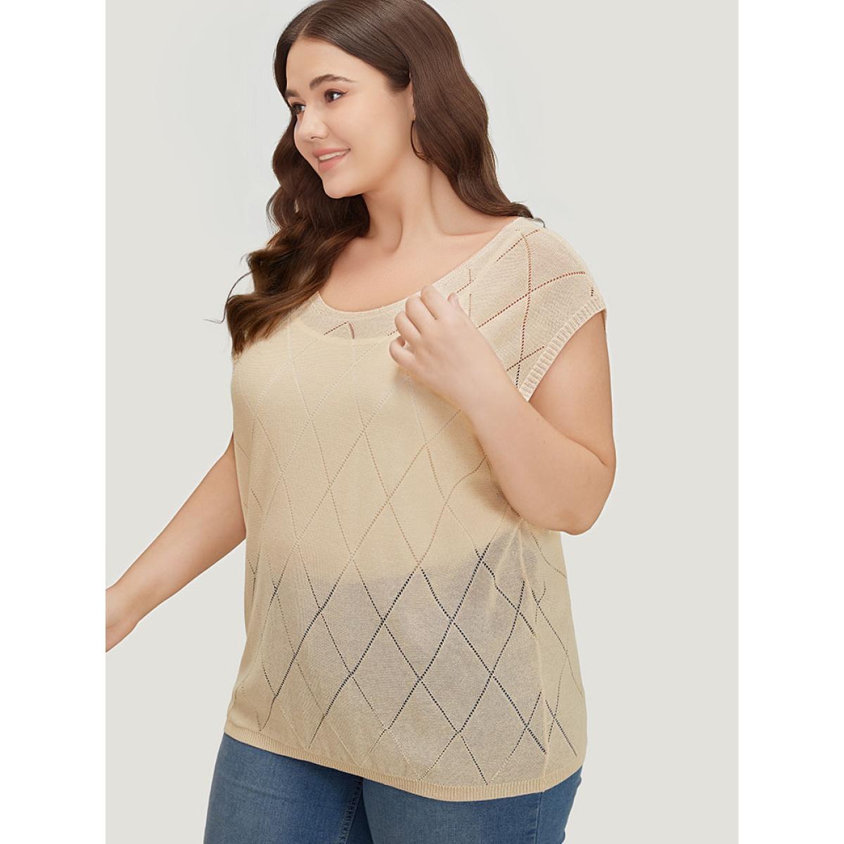 Plus Size Lightweight Argyle Eyelet Batwing Sleeve Pullover Apricot Women Casual Short sleeve Round Neck Everyday Pullovers BloomChic 18-20/2X