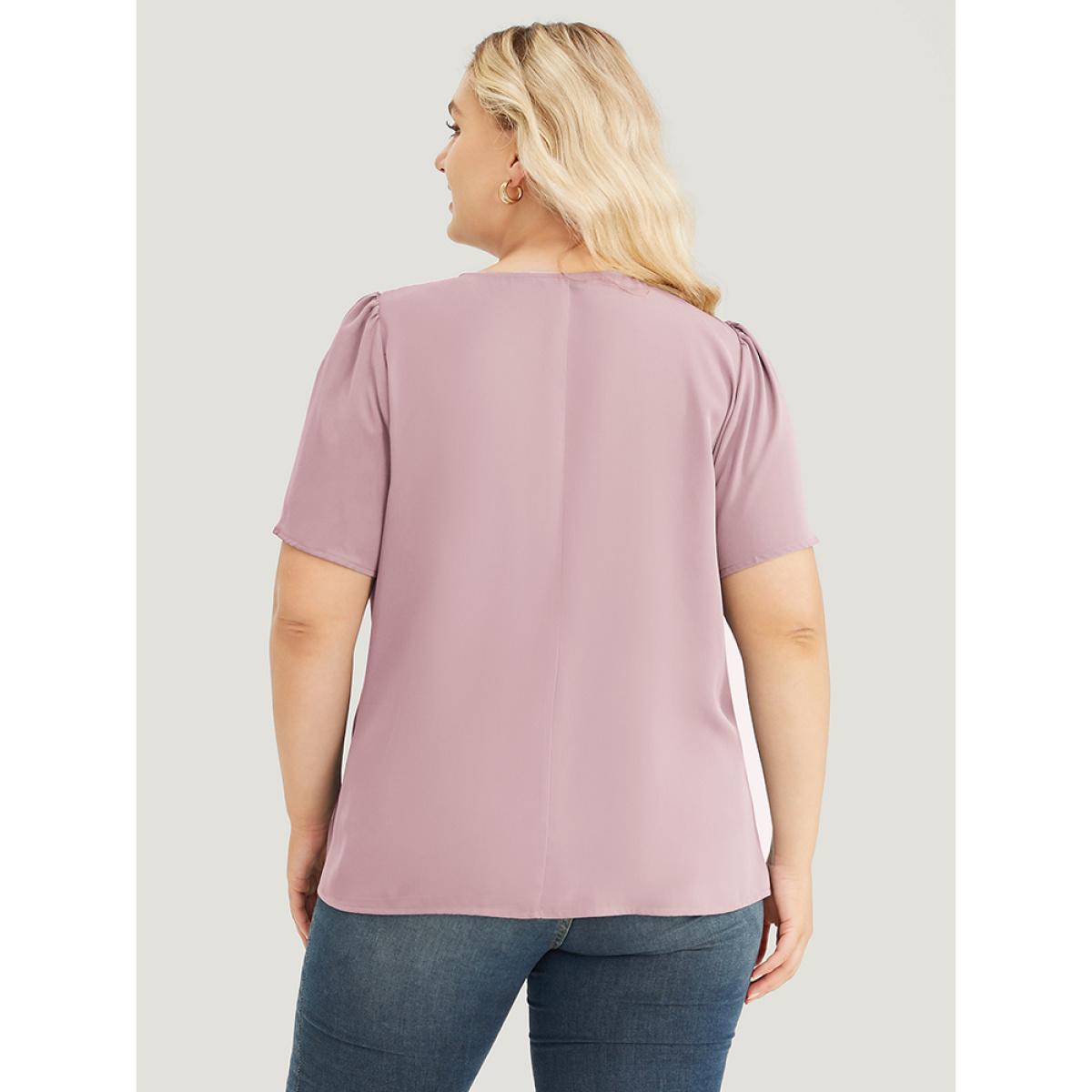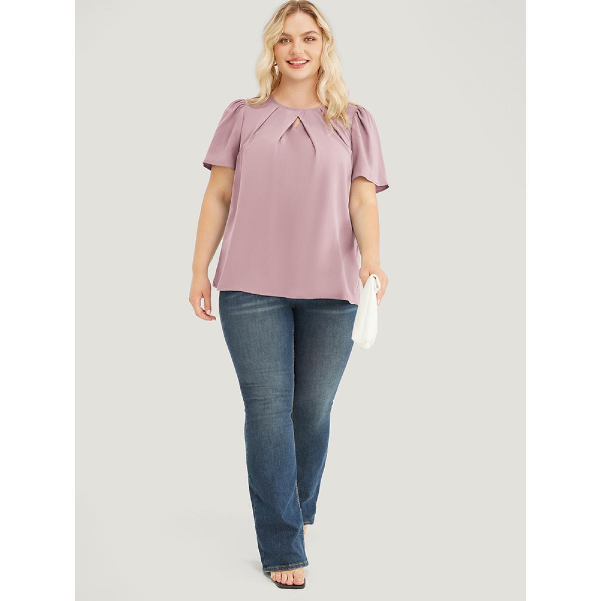 Plus Size Lilac Solid Pleated Detail Keyhole Puff Sleeve Blouse Women Office Short sleeve Round Neck Office Blouses BloomChic 30/6X