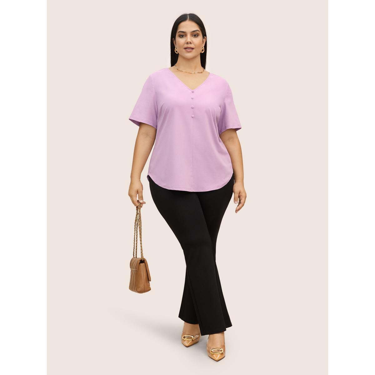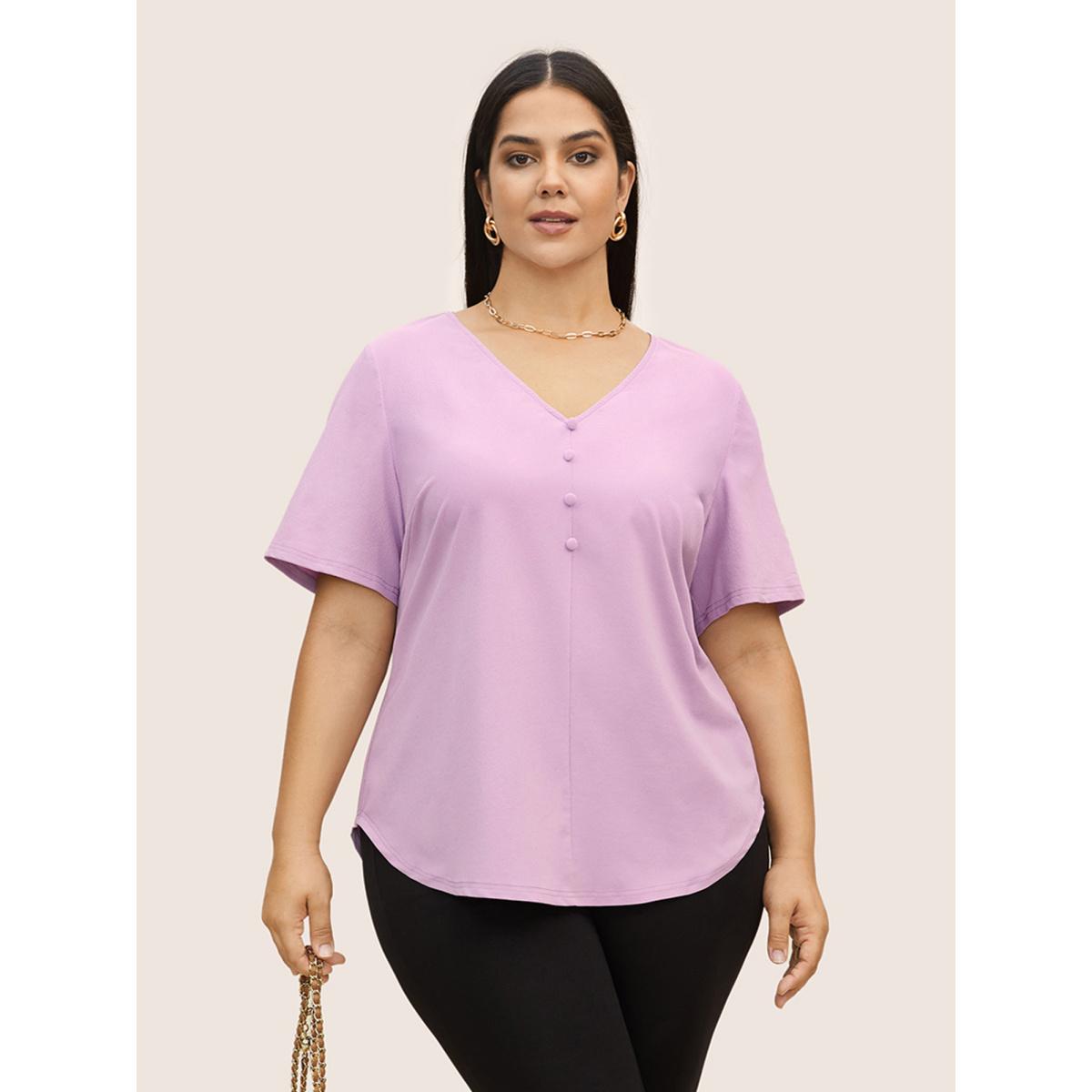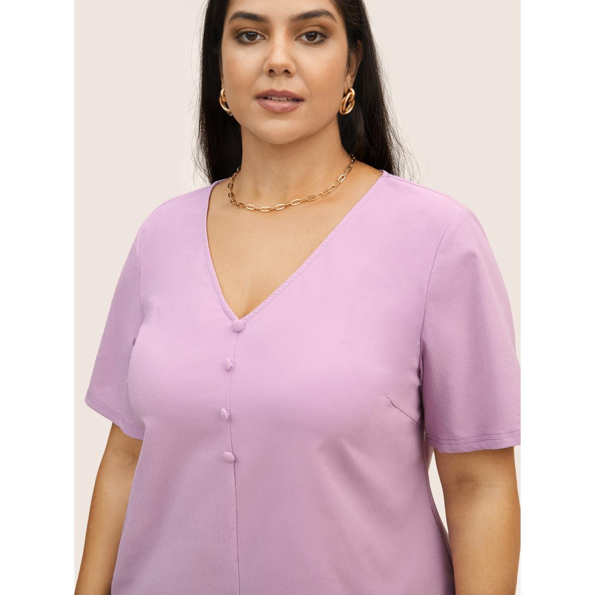 Plus Size Lilac Stretchy Woven Solid Button Detail Blouse Women Work From Home Short sleeve V-neck Work Blouses BloomChic 28/5X