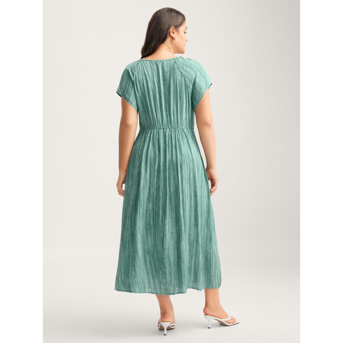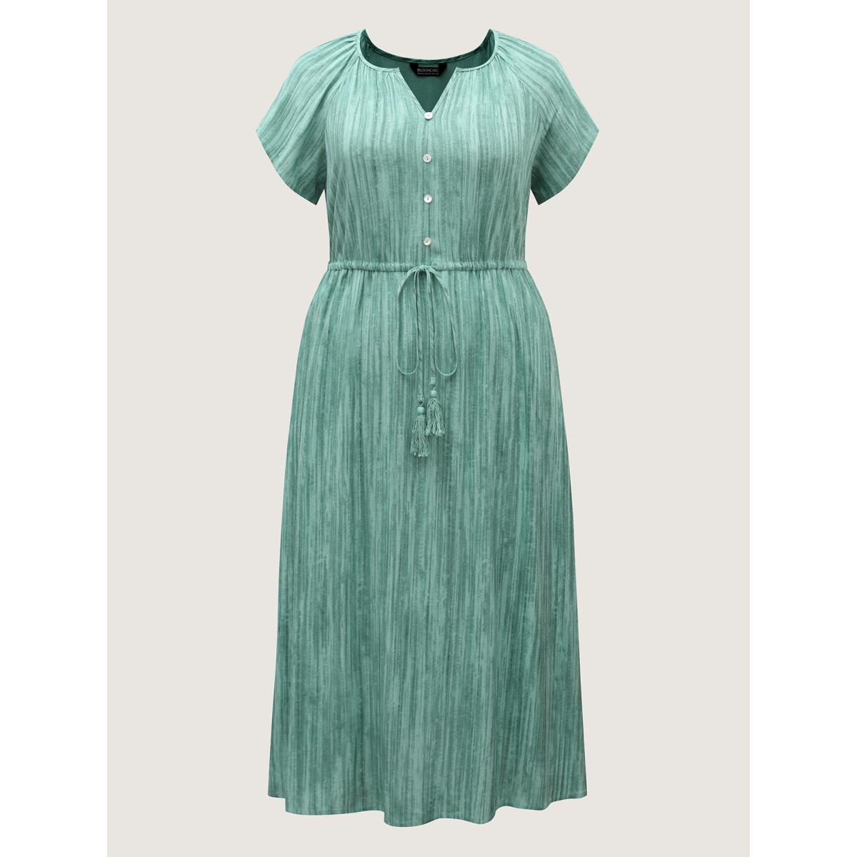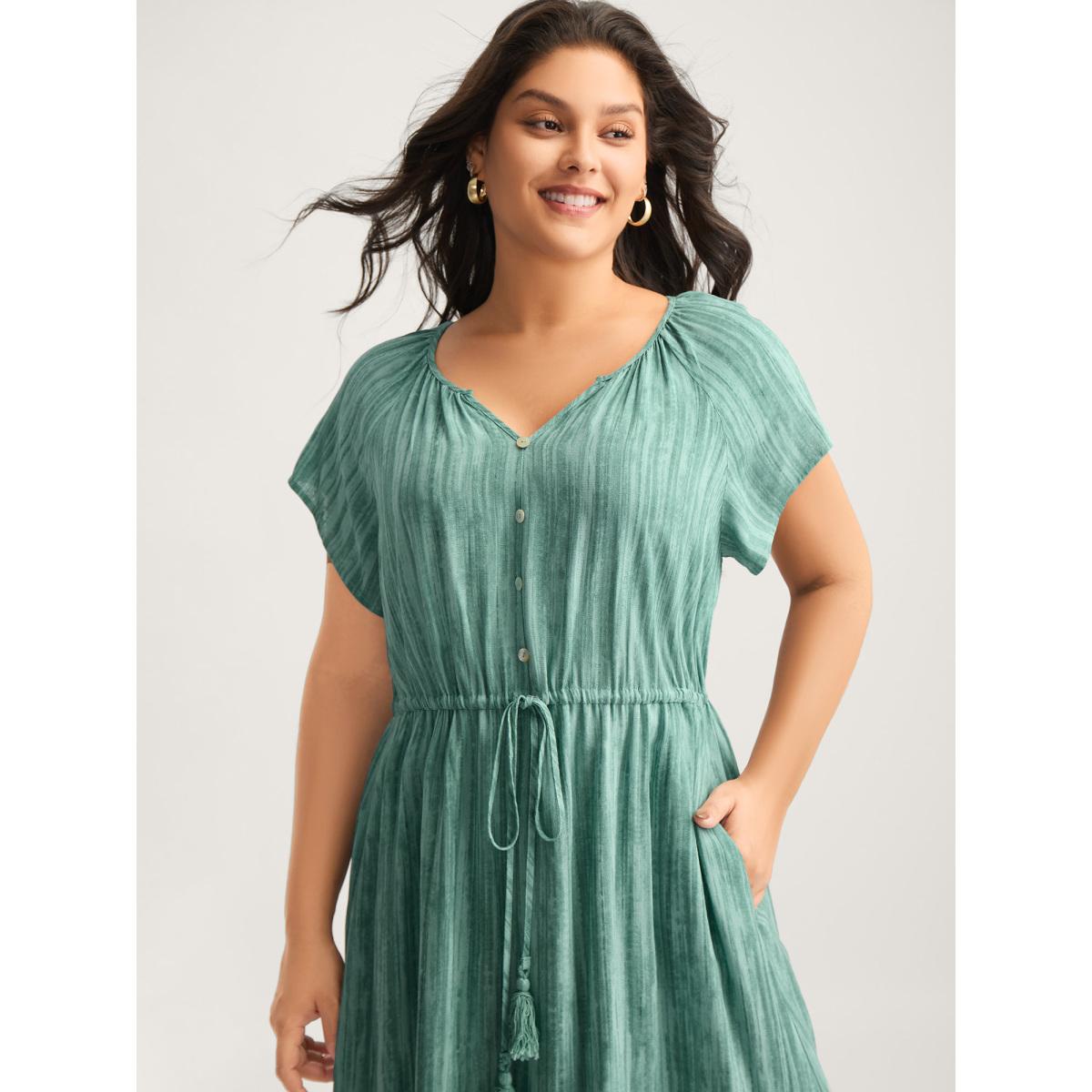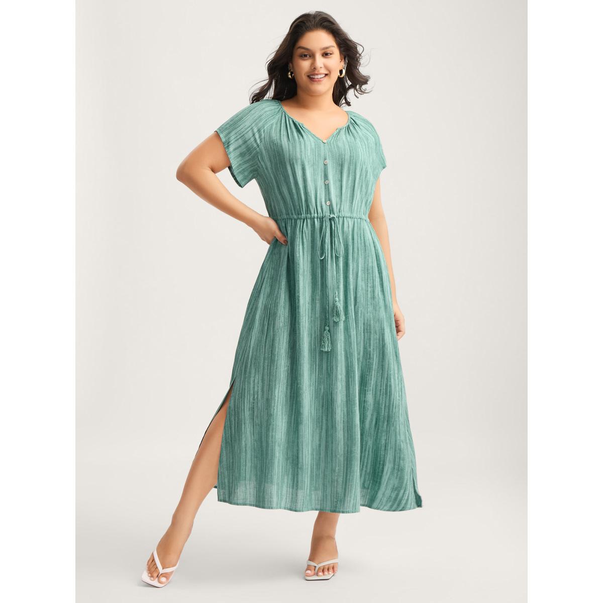 Plus Size Linen Rayon Blend Tassels Textured Maxi Dress Teal Women Notched collar Cap Sleeve Curvy BloomChic 12/L