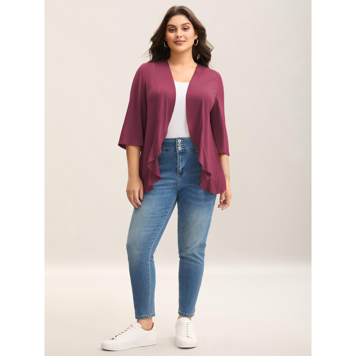Plus Size Lotus Hem Curvy Kimono Cover-Up Women Burgundy Leisure Plain Casual Kimonos BloomChic 10/M