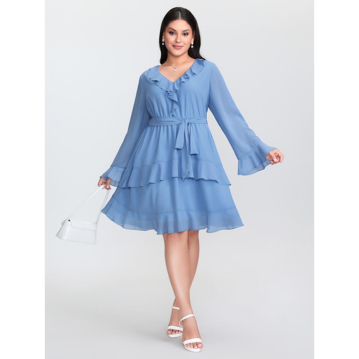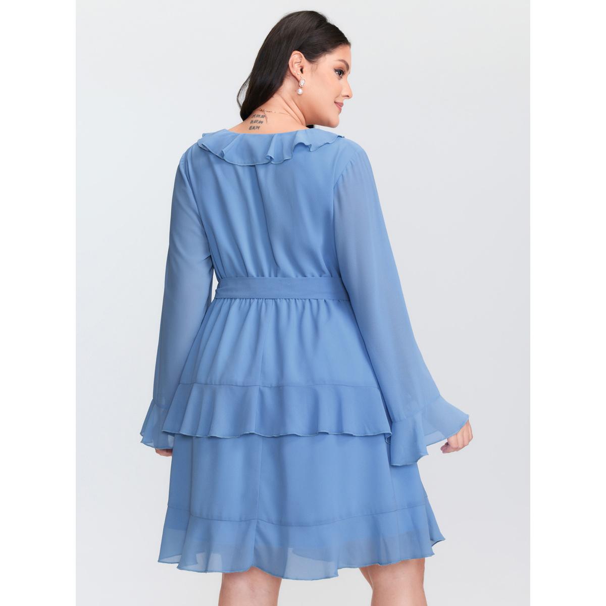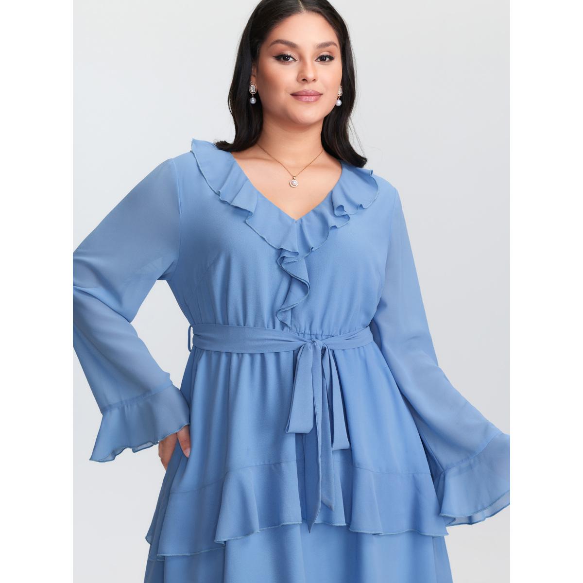 Plus Size Lotus Leaf Neckline Layered Midi Dress LightBlue Women Romantic See through V-neck Long Sleeve Curvy BloomChic 10/M