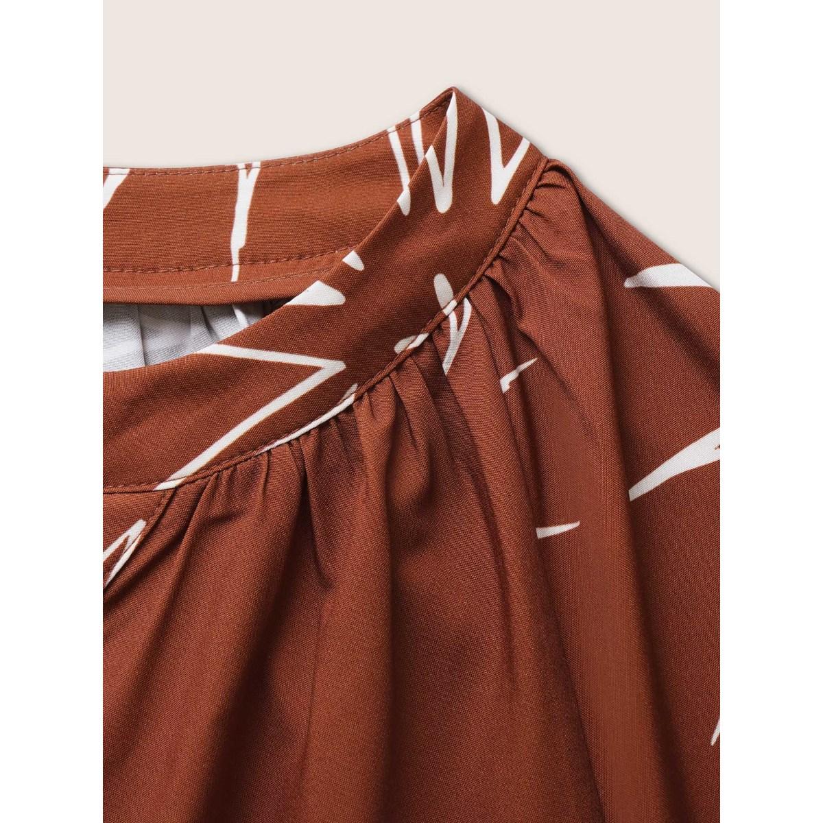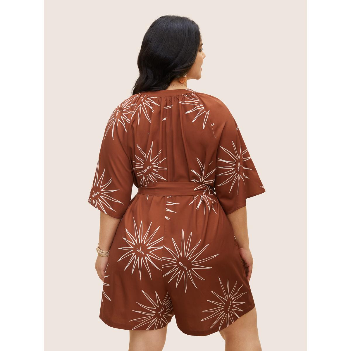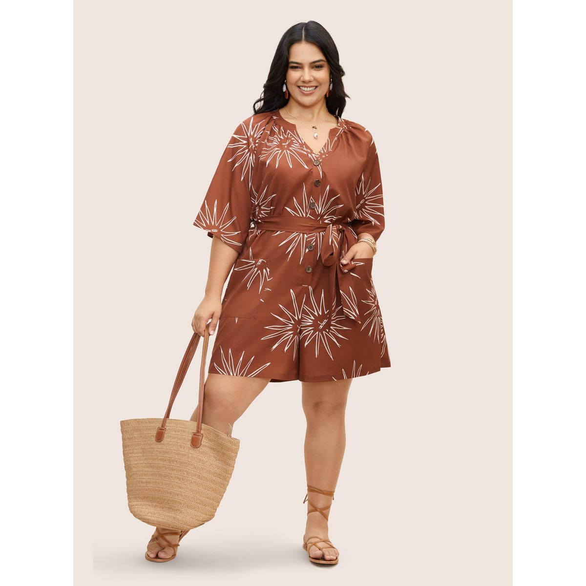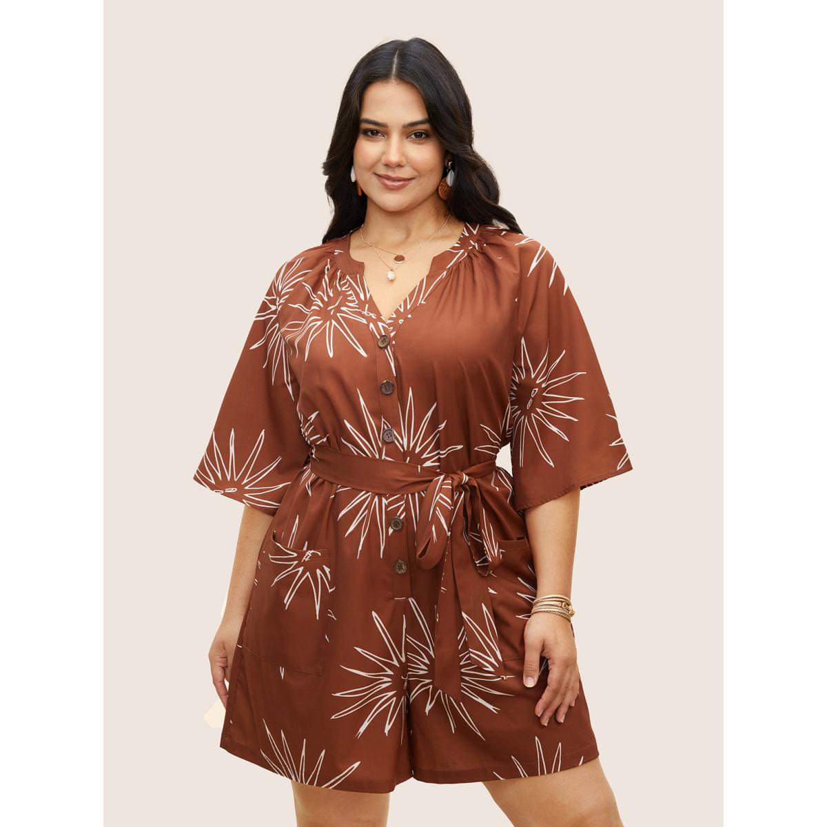 Plus Size Maroon Sun Print Gathered Button Up Jumpsuit Women Resort Half Sleeve Flat collar with V-notch Vacation Loose Jumpsuits BloomChic 26/4X