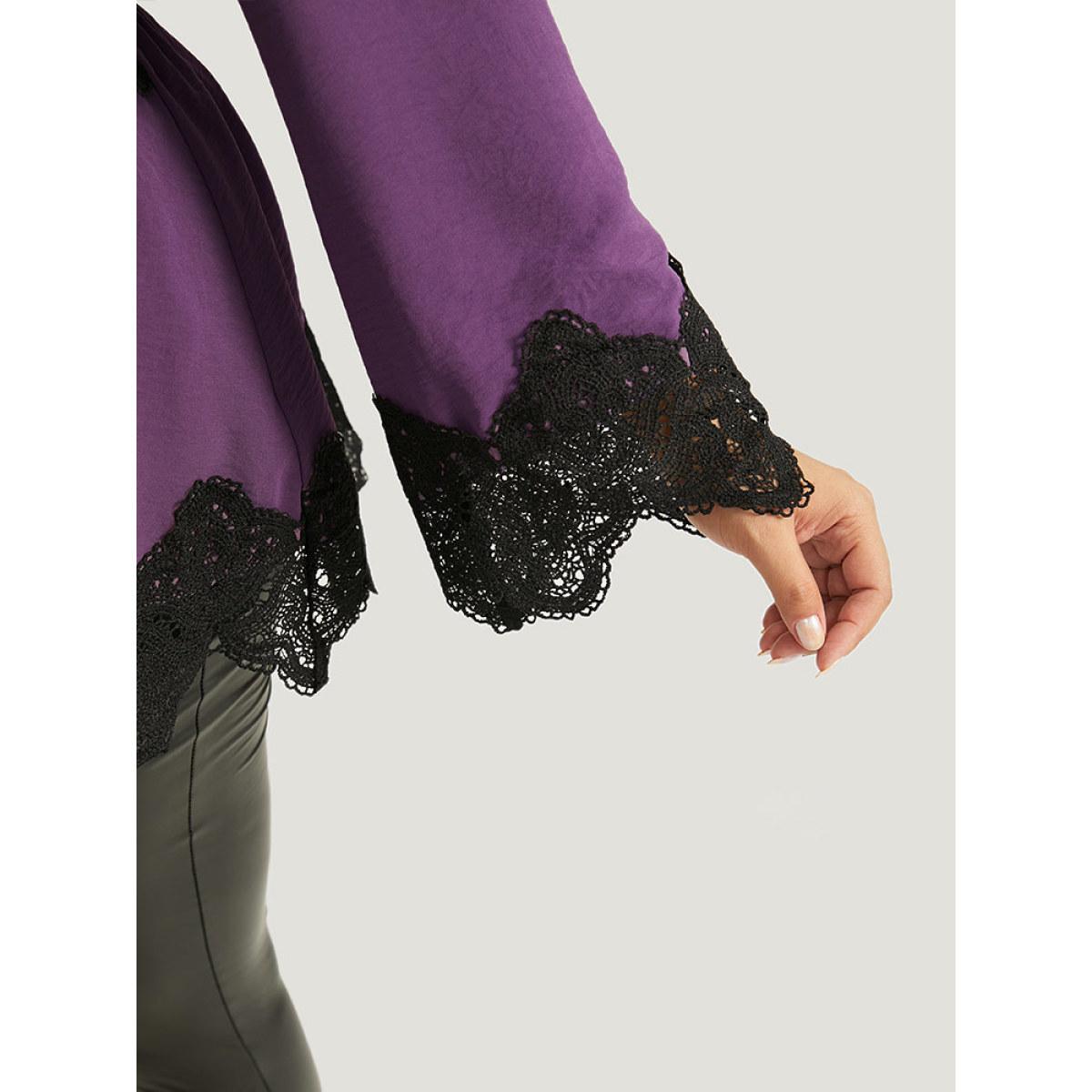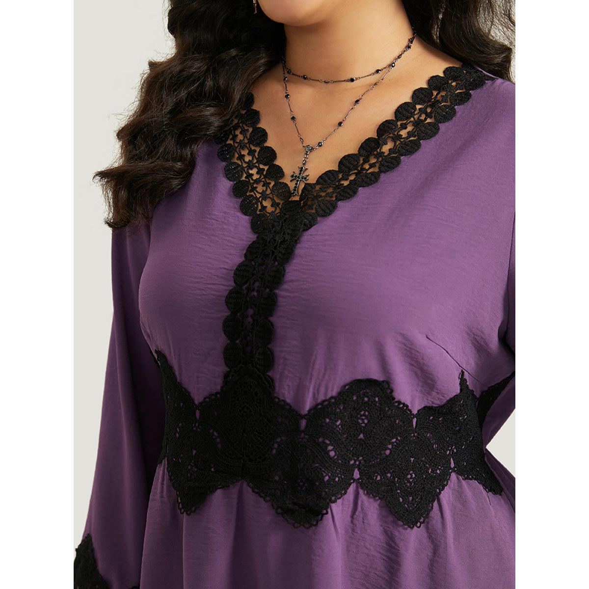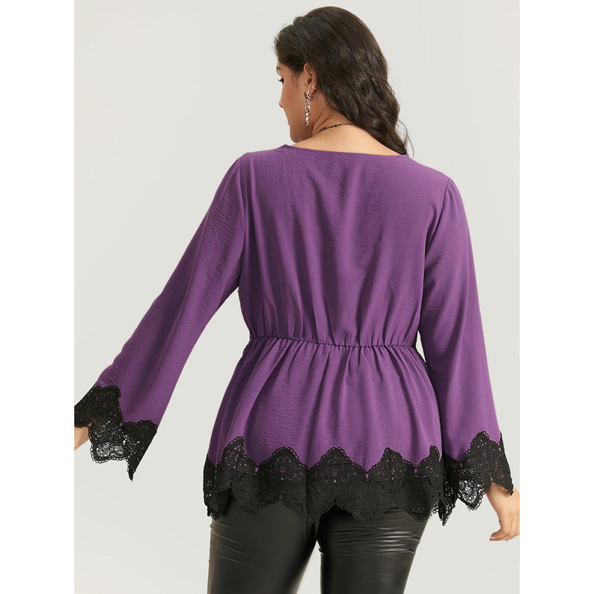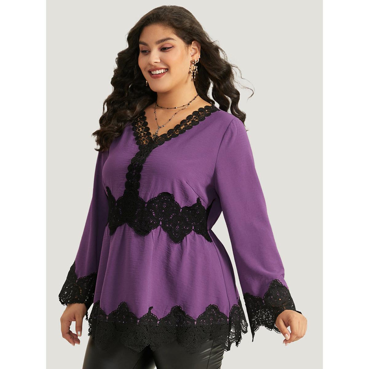 Plus Size Mauve Halloween Plain Eyelet Lace Scalloped Trim Blouse Women Elegant Long Sleeve V-neck Dailywear Blouses BloomChic 26/4X