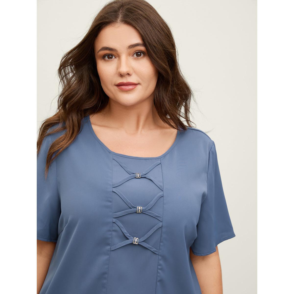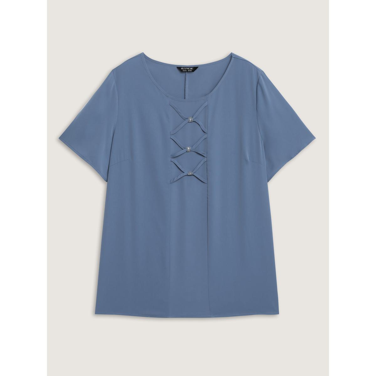 Plus Size Mediumblue Cross-Tie Metal Detail Solid Blouse Women Short sleeve Round Neck Office Blouses BloomChic 14-16/1X