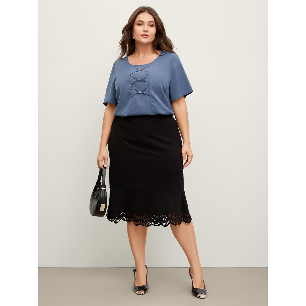 Plus Size Stone Keyhole Metal Chain Detail Ruffle Sleeve Blouse Women Work From Home Short sleeve Round Neck Work Blouses BloomChic 22-24/3X