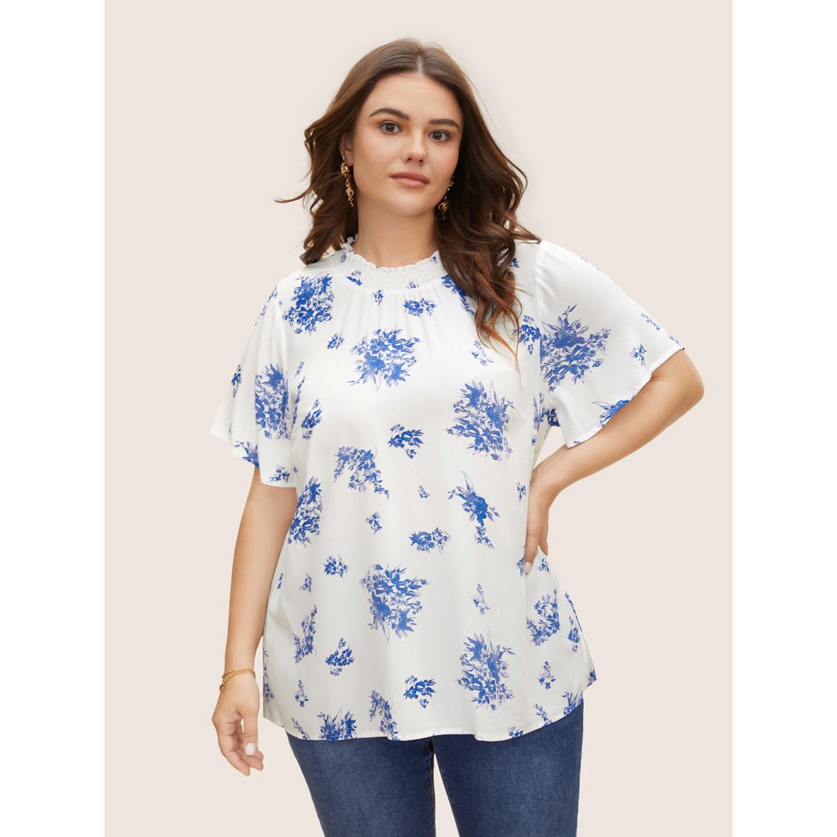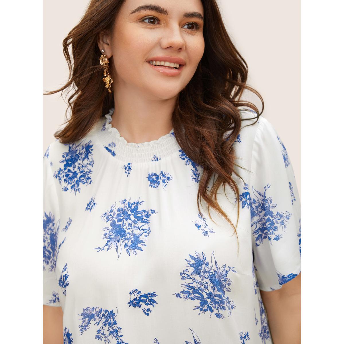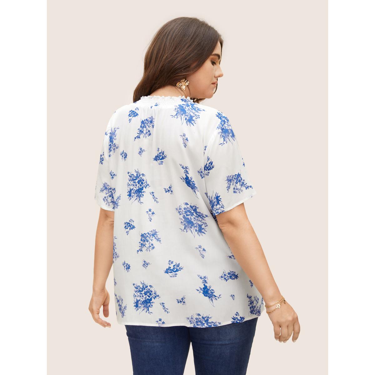 Plus Size Mediumblue Wrap Collar Floral Ruffle Sleeve Blouse Women Elegant Short sleeve Wrap collar Everyday Blouses BloomChic 10/M