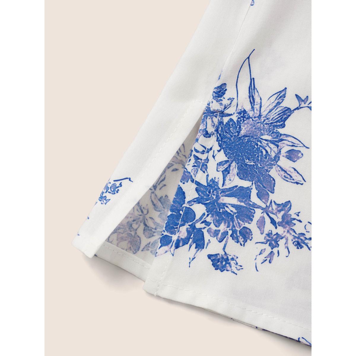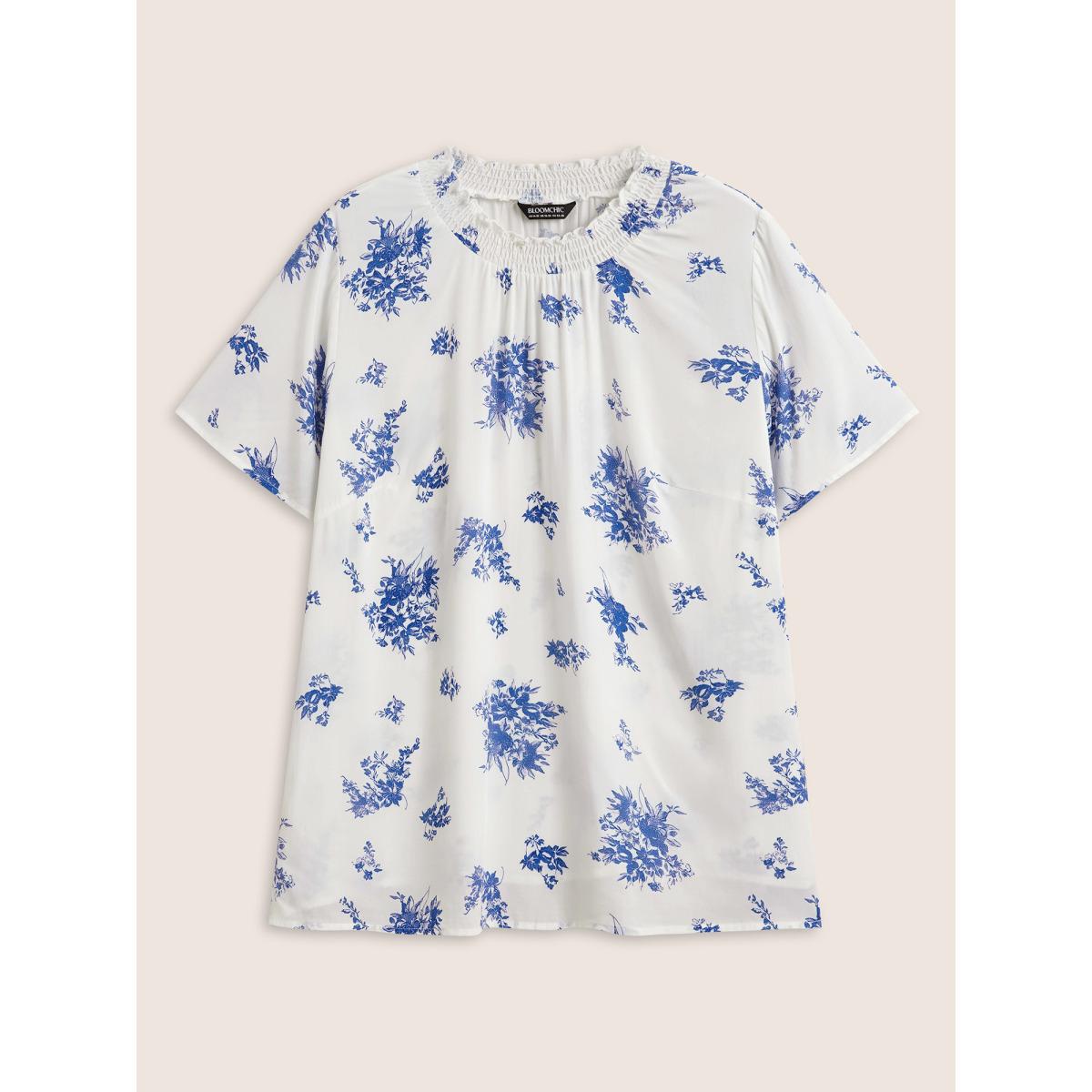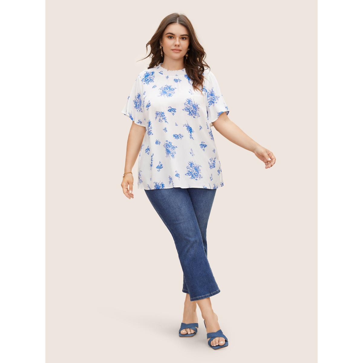 Plus Size Mediumblue Wrap Collar Floral Ruffle Sleeve Blouse Women Elegant Short sleeve Wrap collar Everyday Blouses BloomChic 10/M
