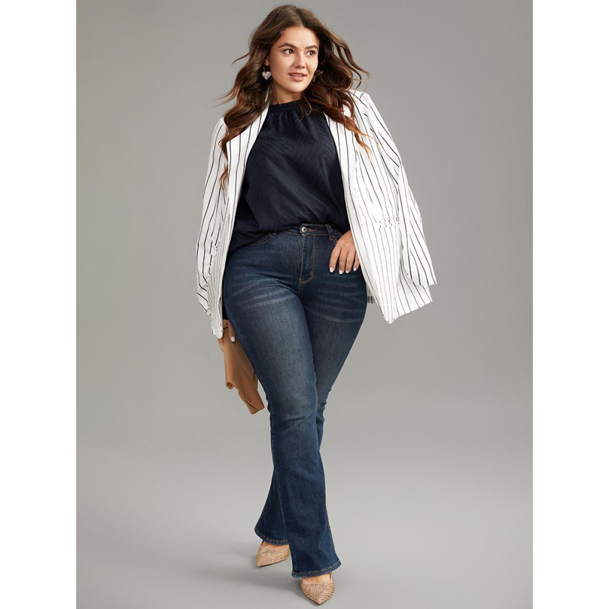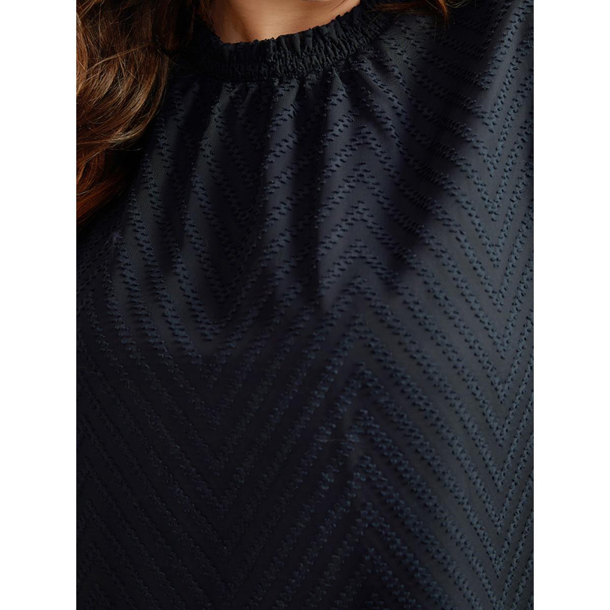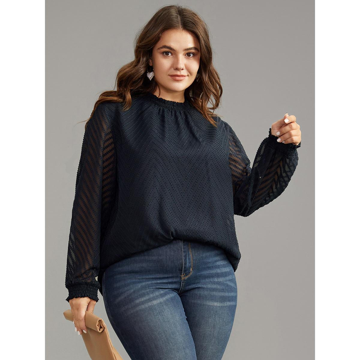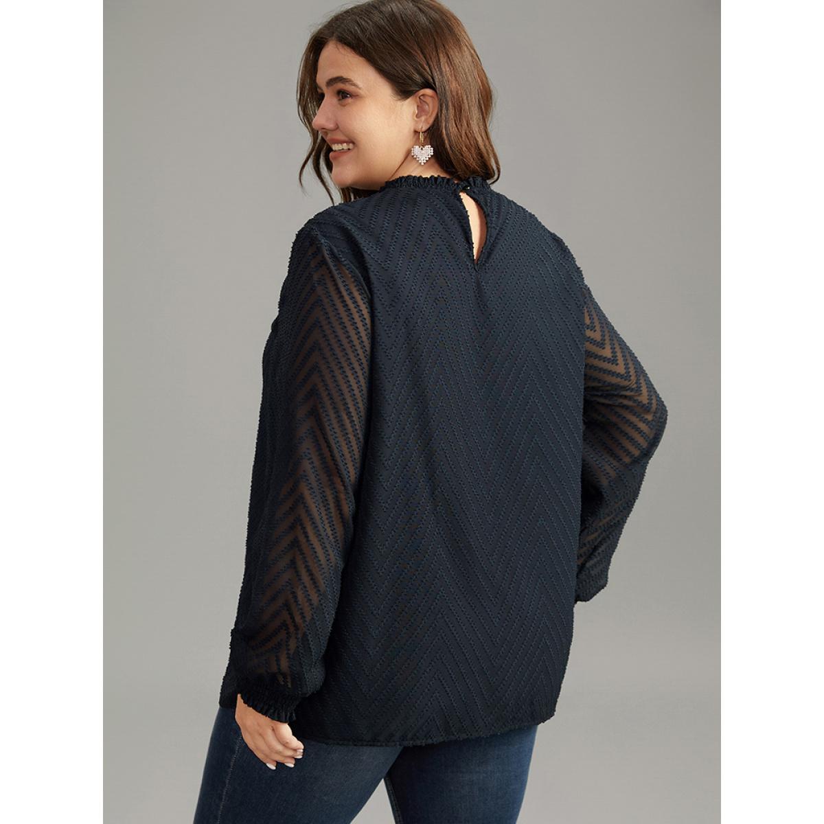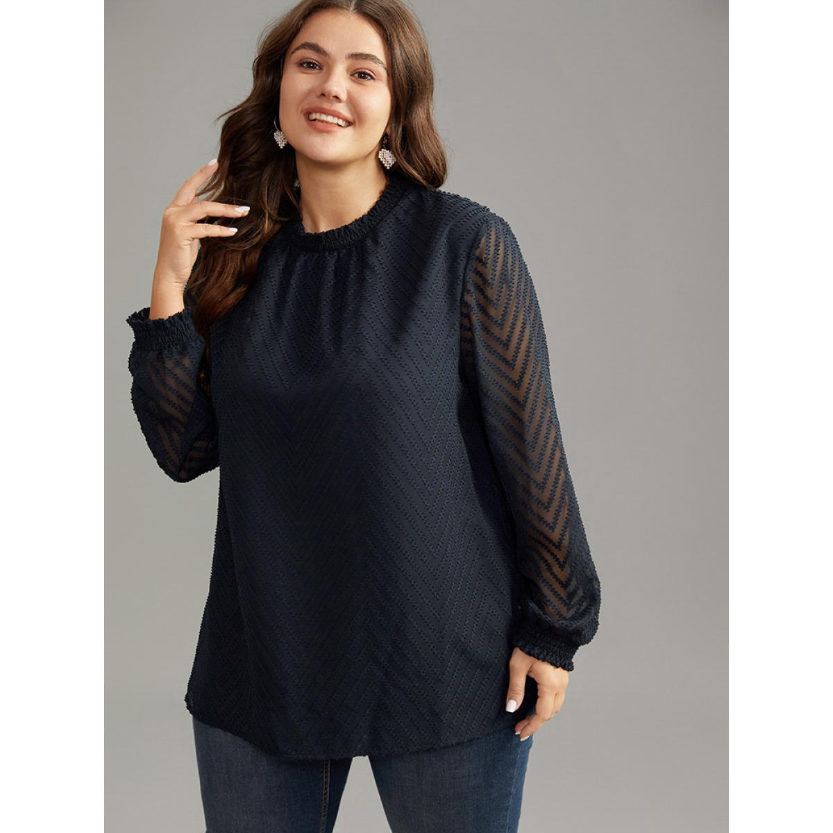Plus Size Midnight Plain Patchwork Mesh Shirred Frill Trim Blouse Women Office Long Sleeve Round Neck Work Blouses BloomChic 30/6X
