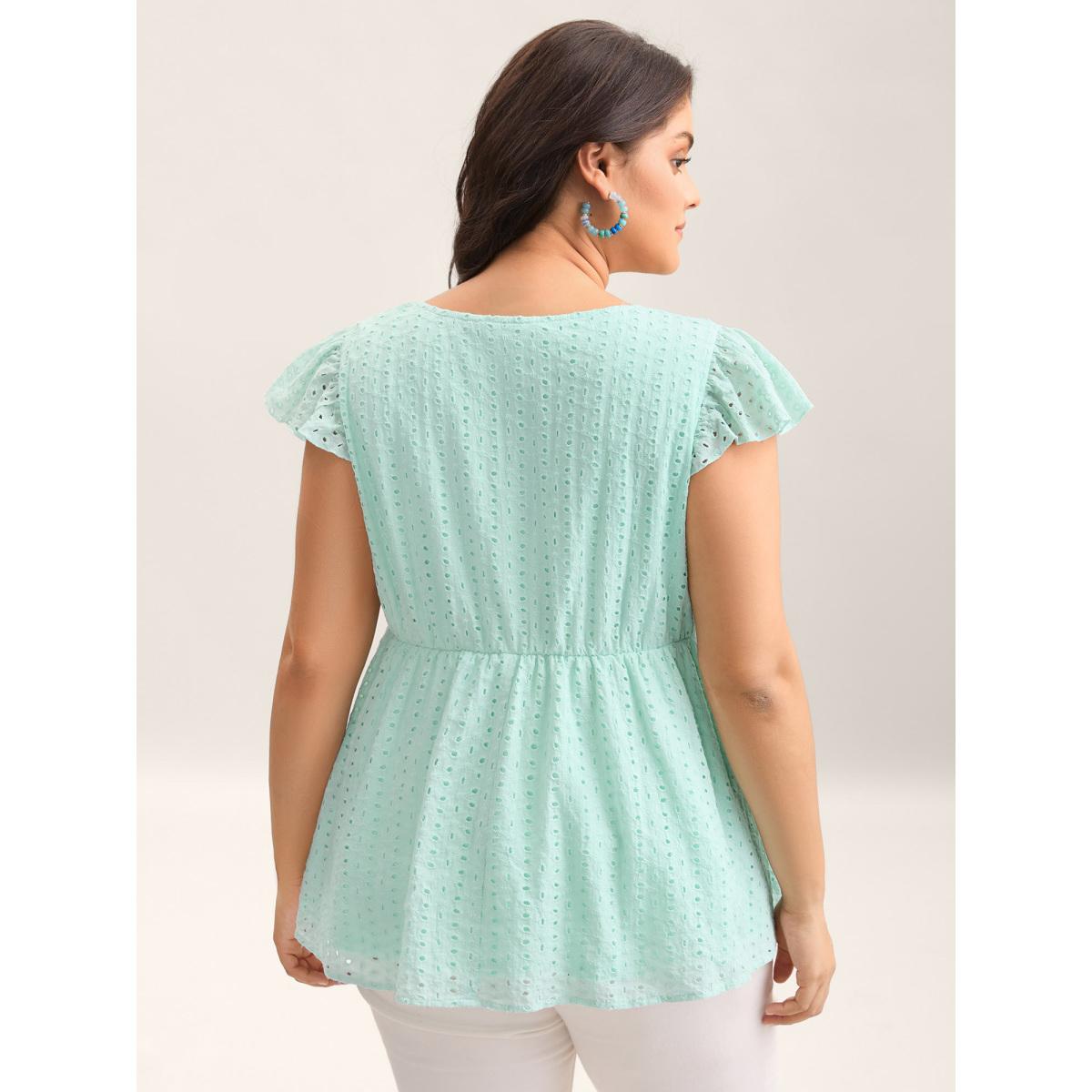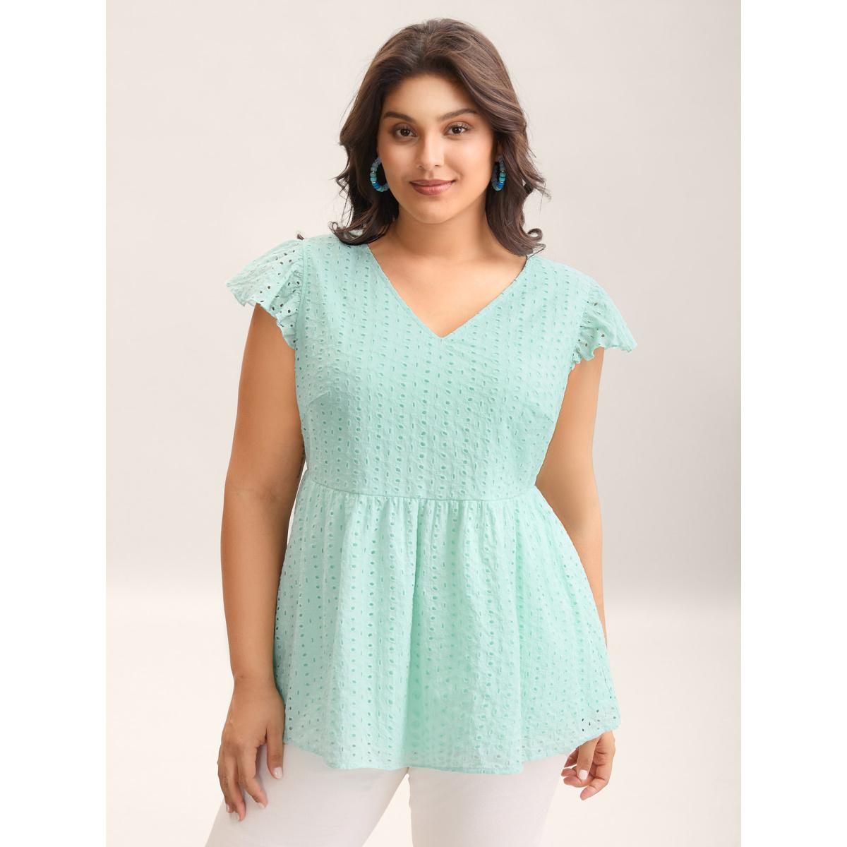 Plus Size Mint Cotton Embroidered Flutter Sleeve Babydoll Top Women Cap Sleeve V-neck Vacation Blouses BloomChic 14-16/1X