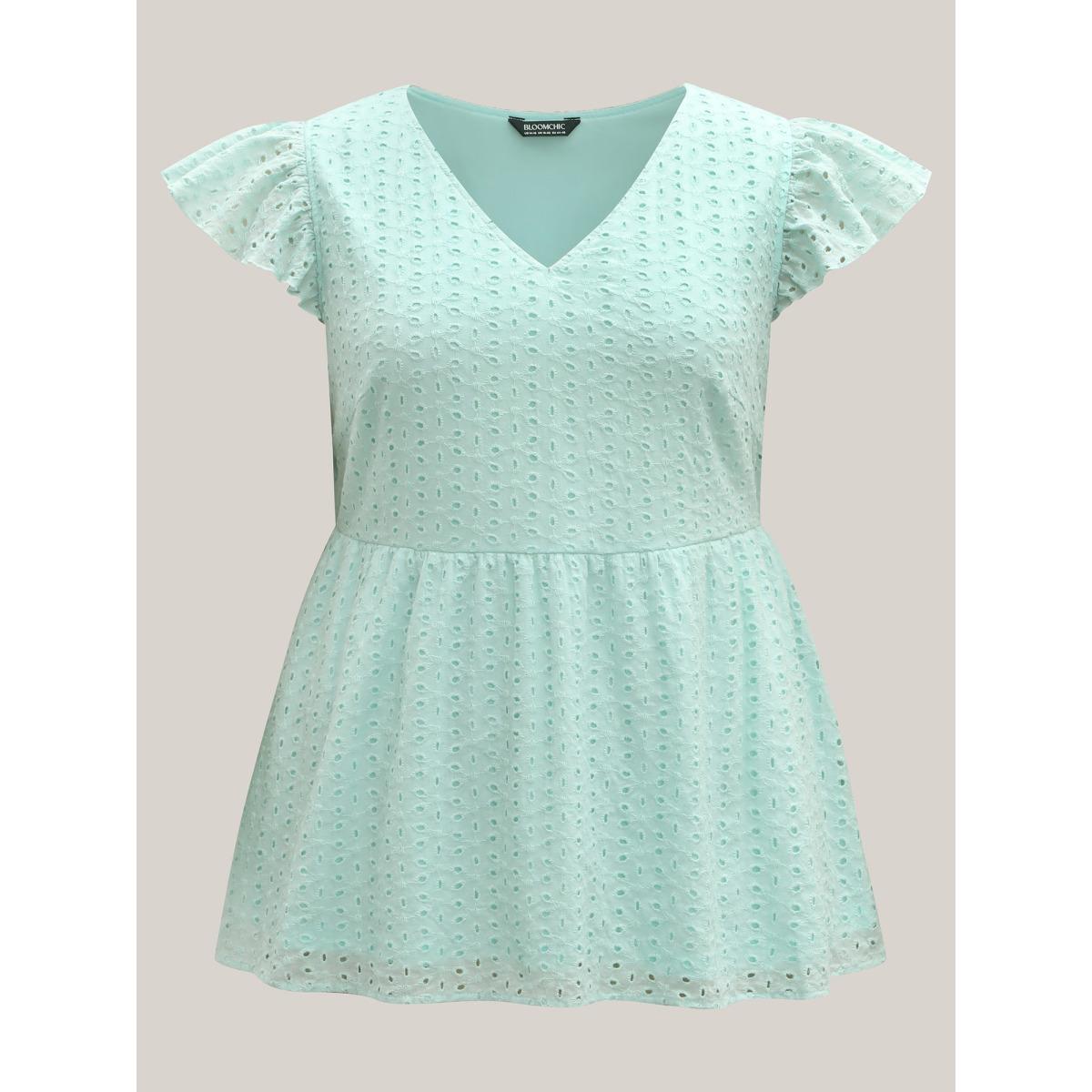Plus Size Mint Plain Broderie Anglaise Ruffle Sleeve Blouse Women Casual Elbow-length sleeve Round Neck Everyday Blouses BloomChic 18-20/2X