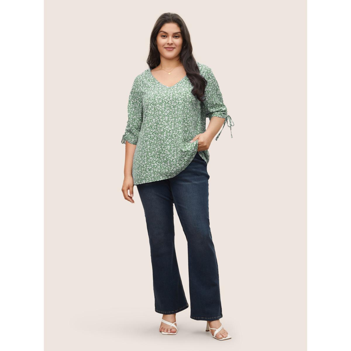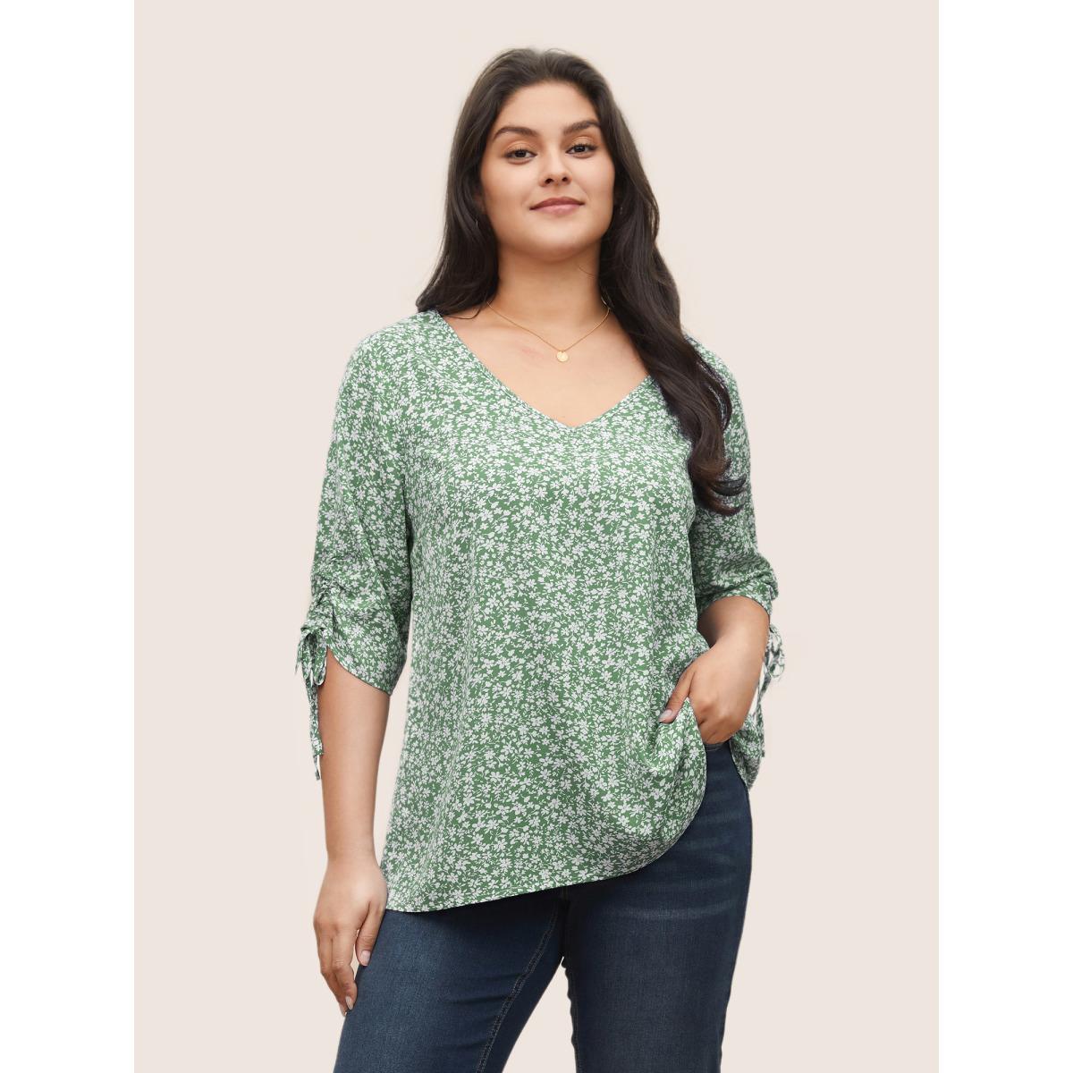 Plus Size Mint Ditsy Floral Knot Ties Sleeve Blouse Women Elegant Elbow-length sleeve V-neck Everyday Blouses BloomChic 14-16/1X