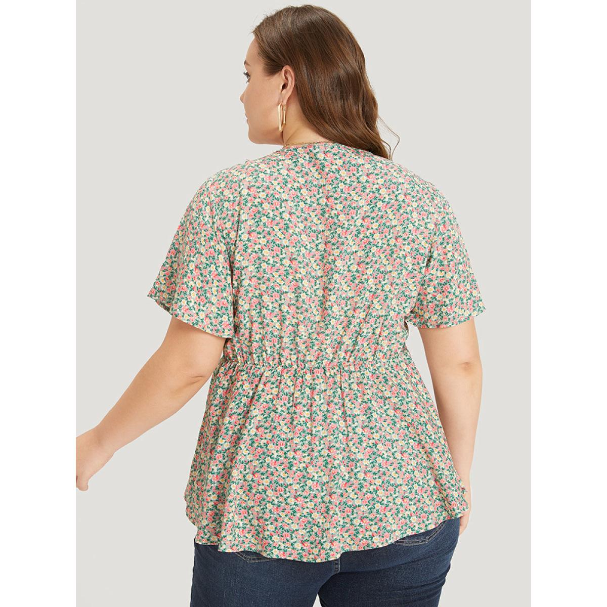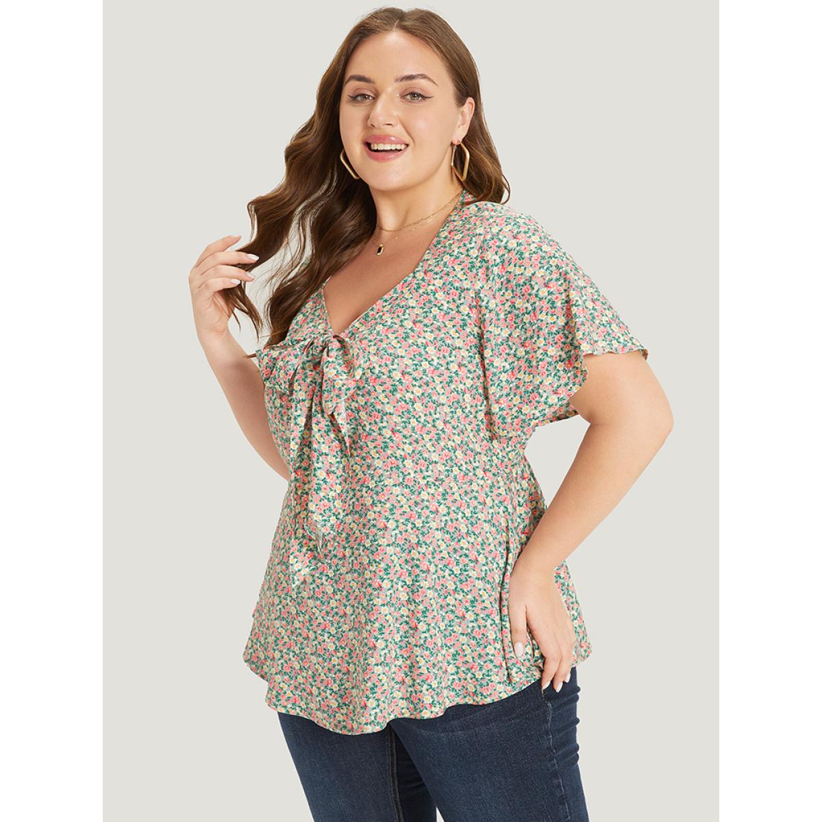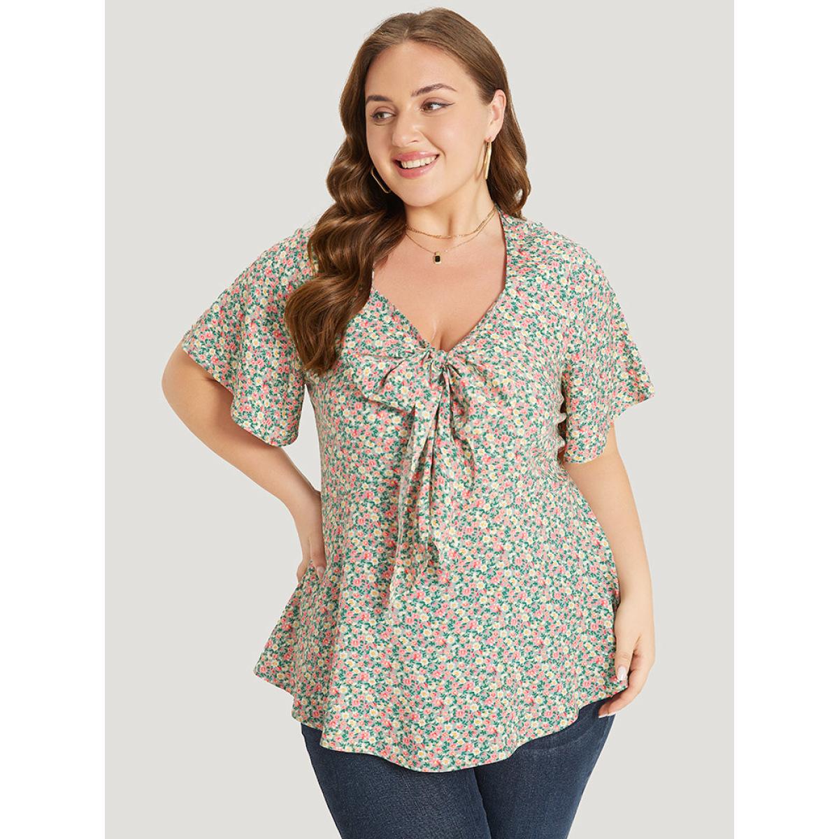 Plus Size Mint Ditsy Floral Knot V Neck Blouse Women Elegant Short sleeve V-neck Dailywear Blouses BloomChic 18-20/2X