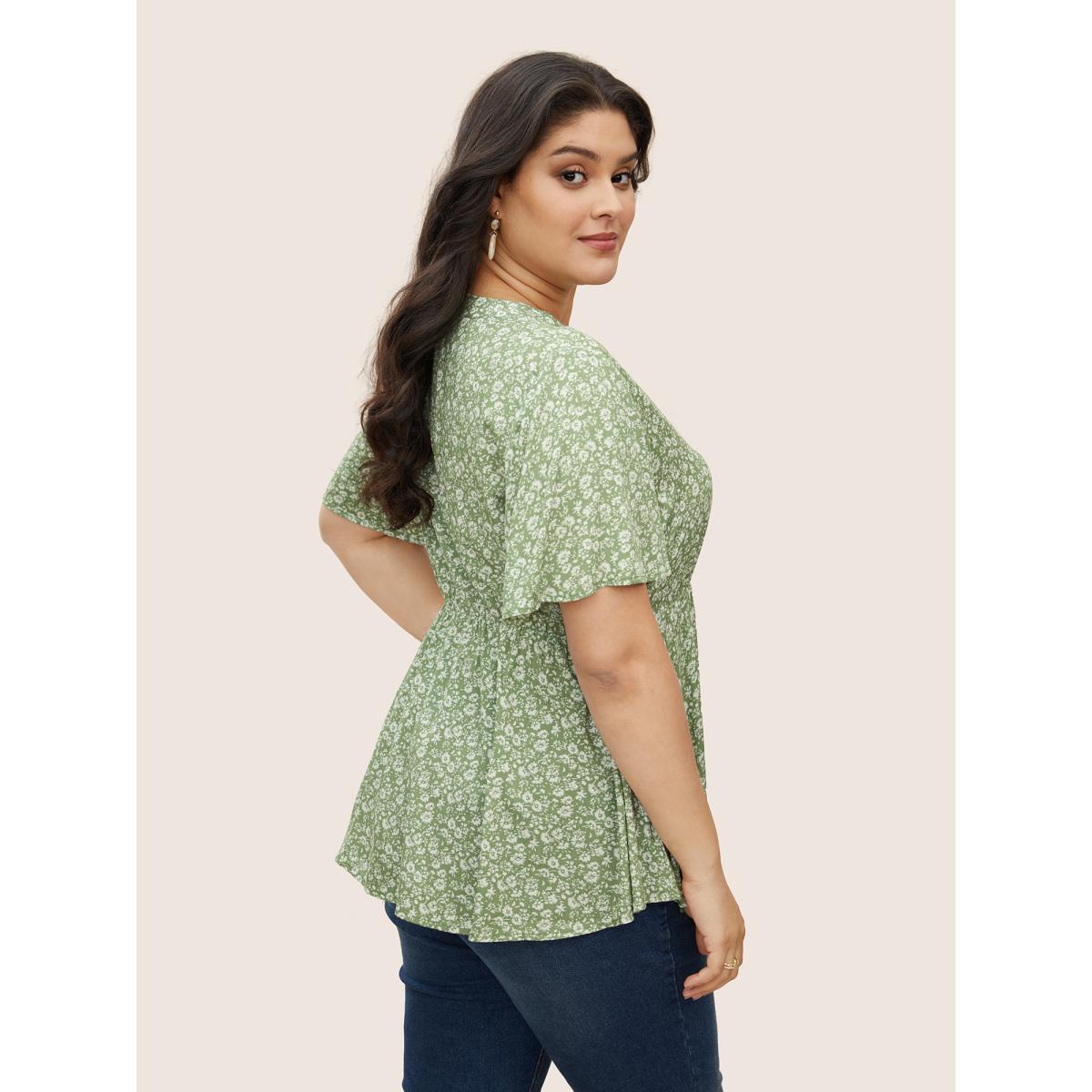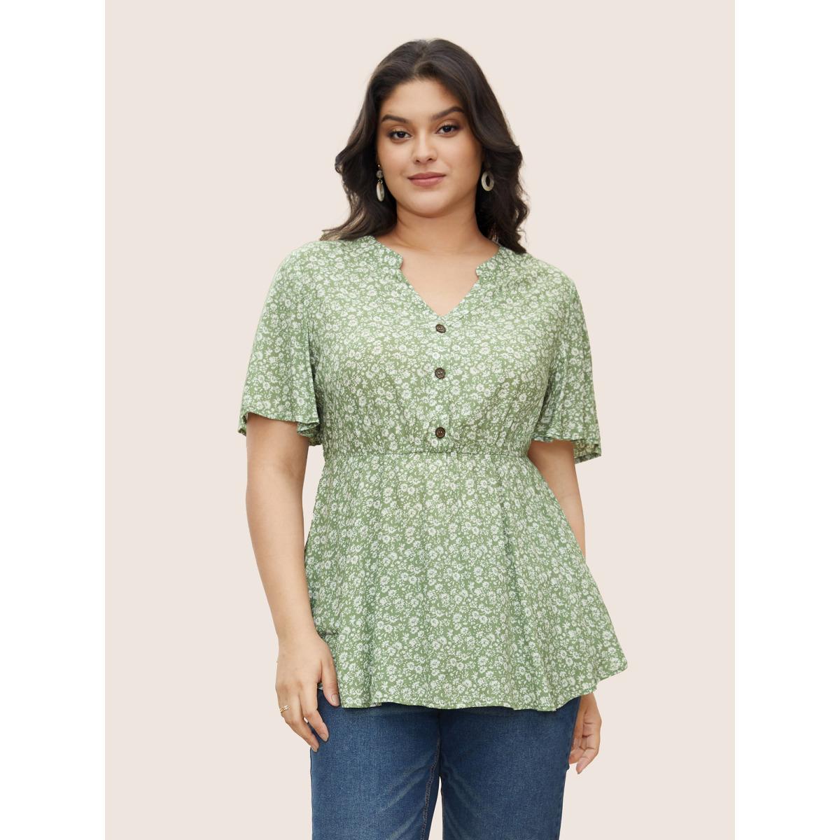 Plus Size Mint Ditsy Floral Notched Button Detail Blouse Women Elegant Short sleeve V-neck Everyday Blouses BloomChic 12/L