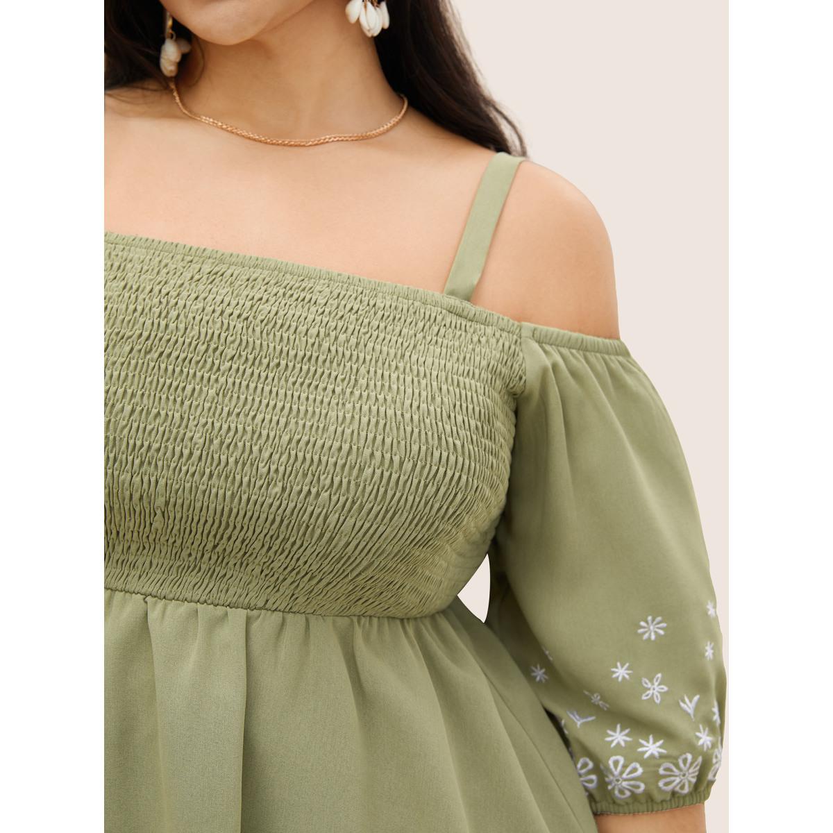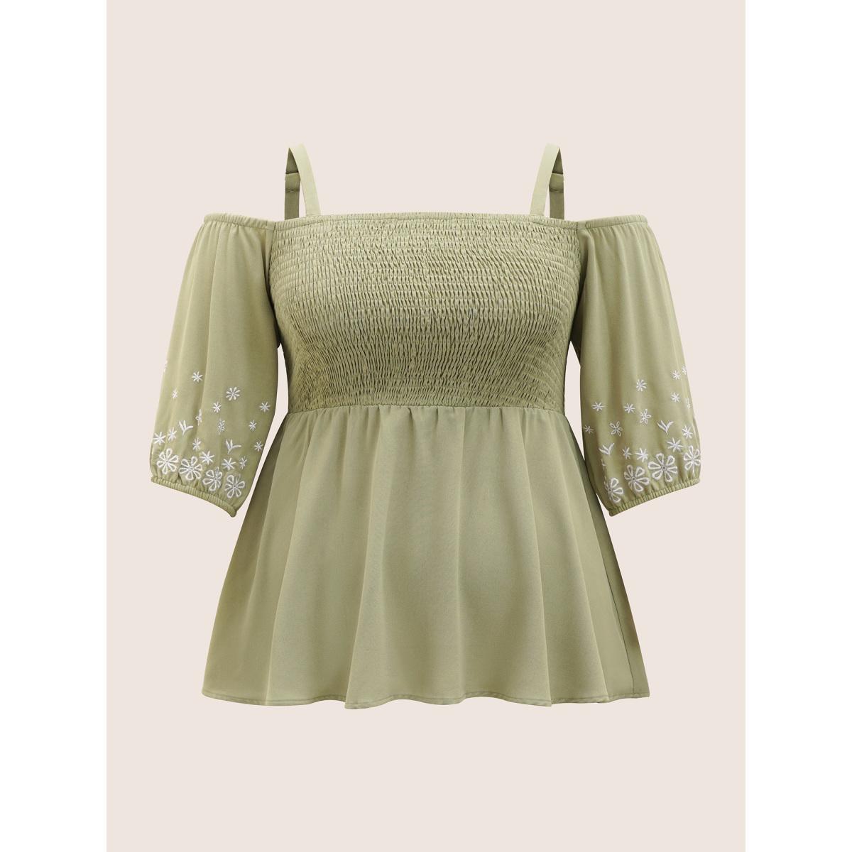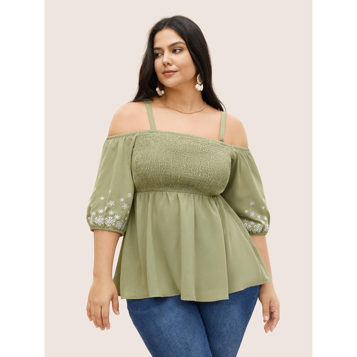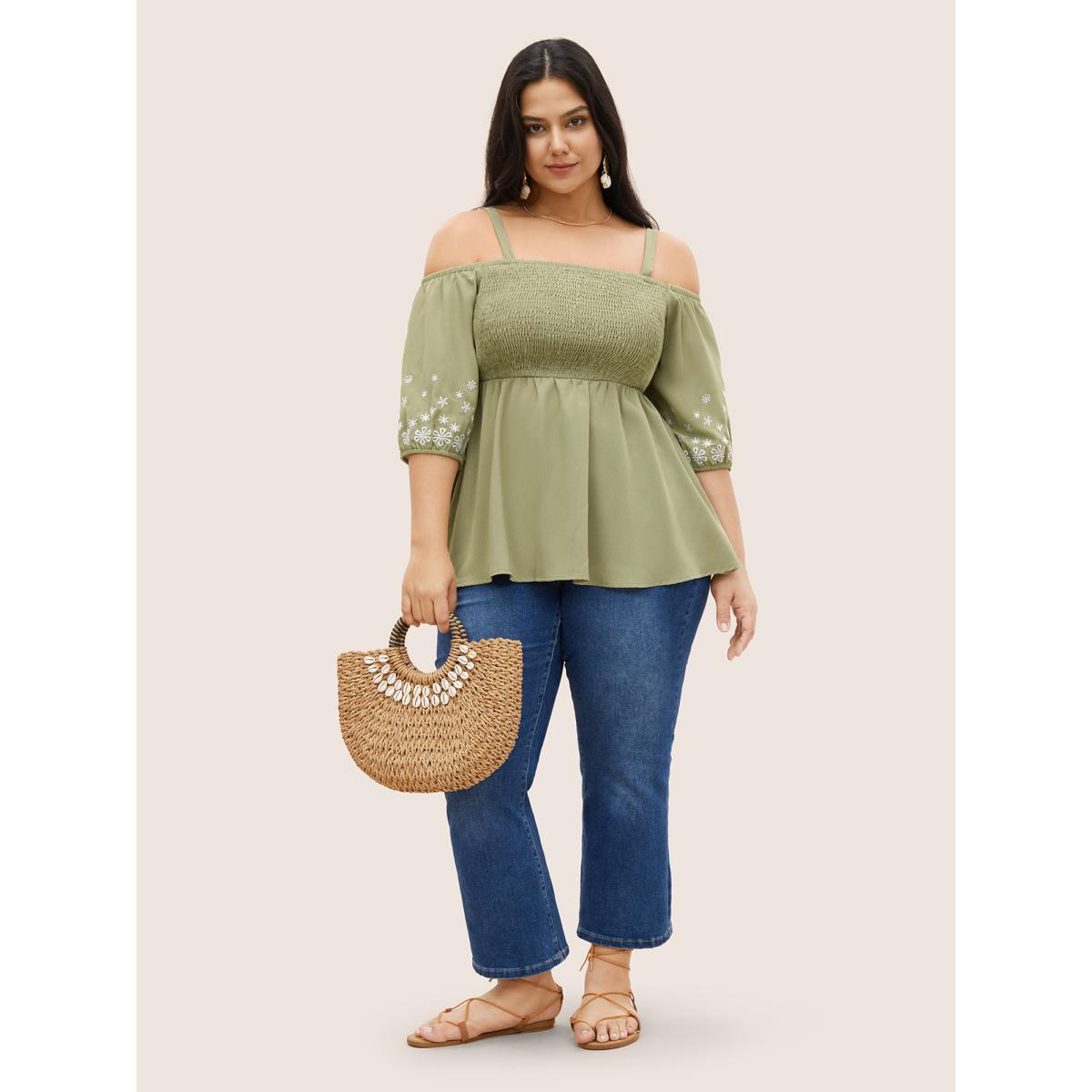 Plus Size Mint Floral Embroidered Shirred Off Shoulder Blouse Women Resort Half Sleeve One-shoulder neck Vacation Blouses BloomChic 12/L