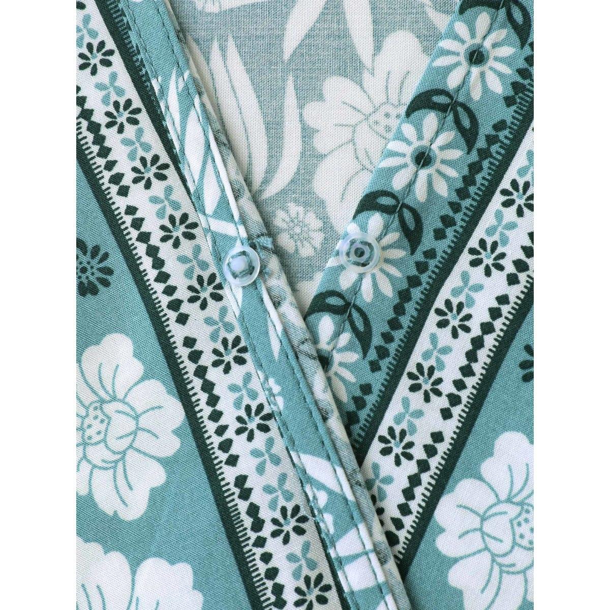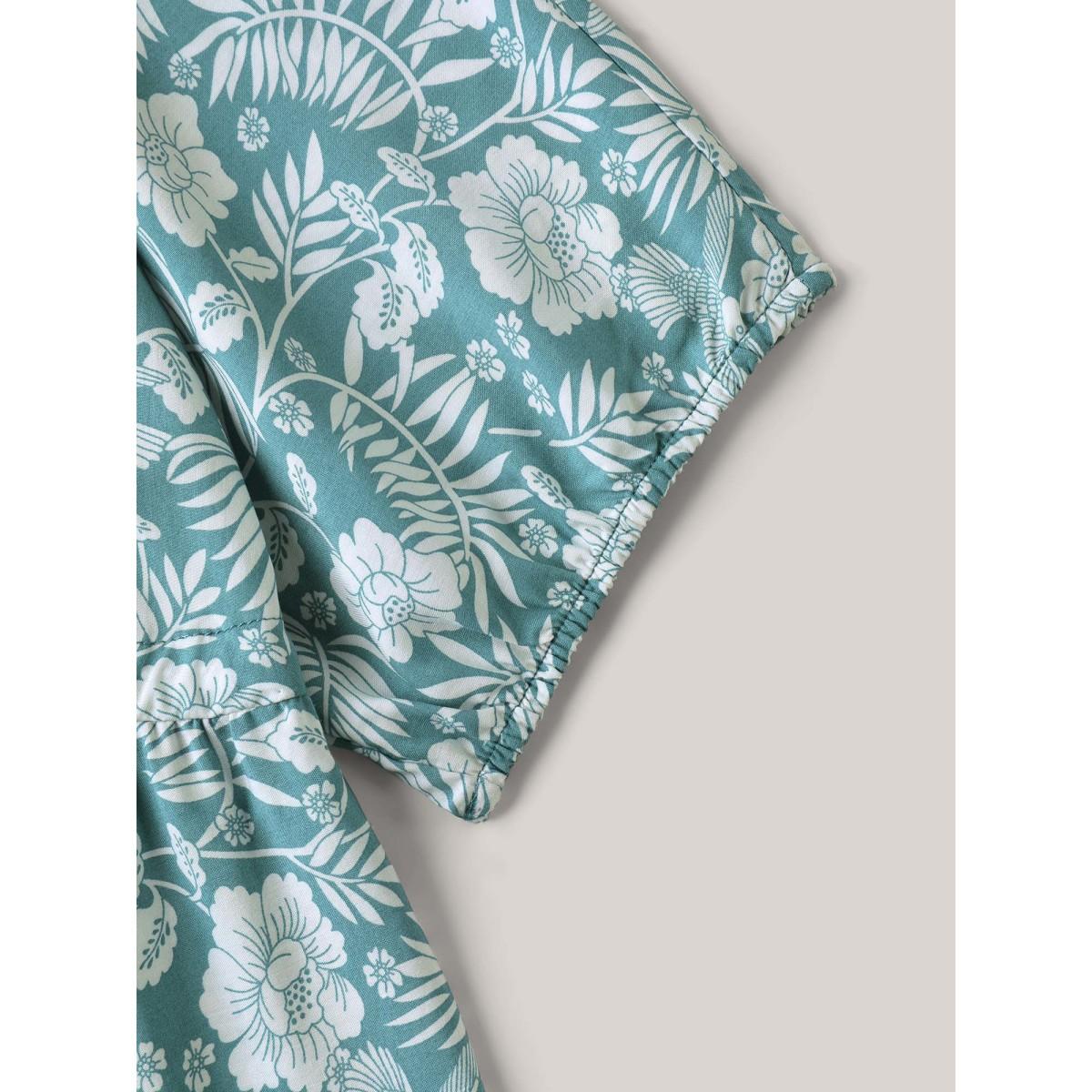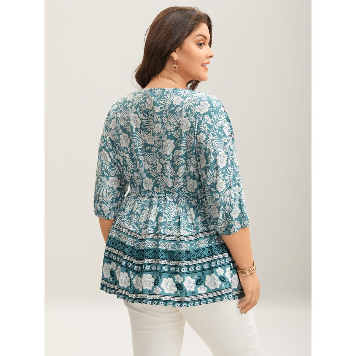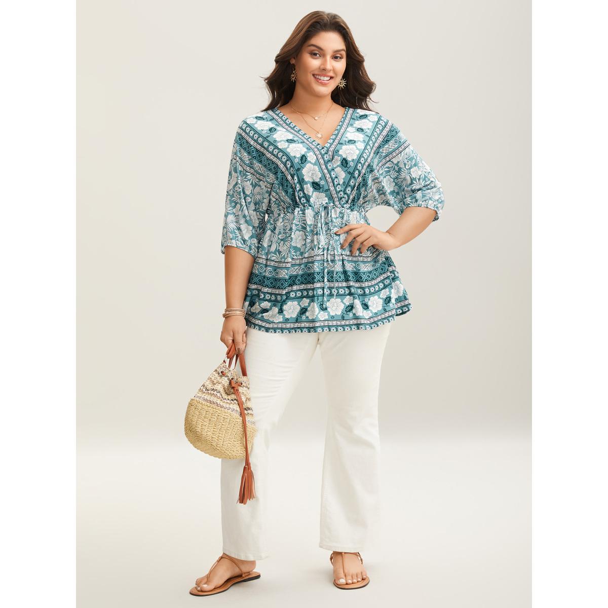 Plus Size Mint Floral Print Surplice Neck Waist-Cinched Shirt Women Boho Elbow-length sleeve Overlap Collar Vacation Blouses BloomChic 30/6X